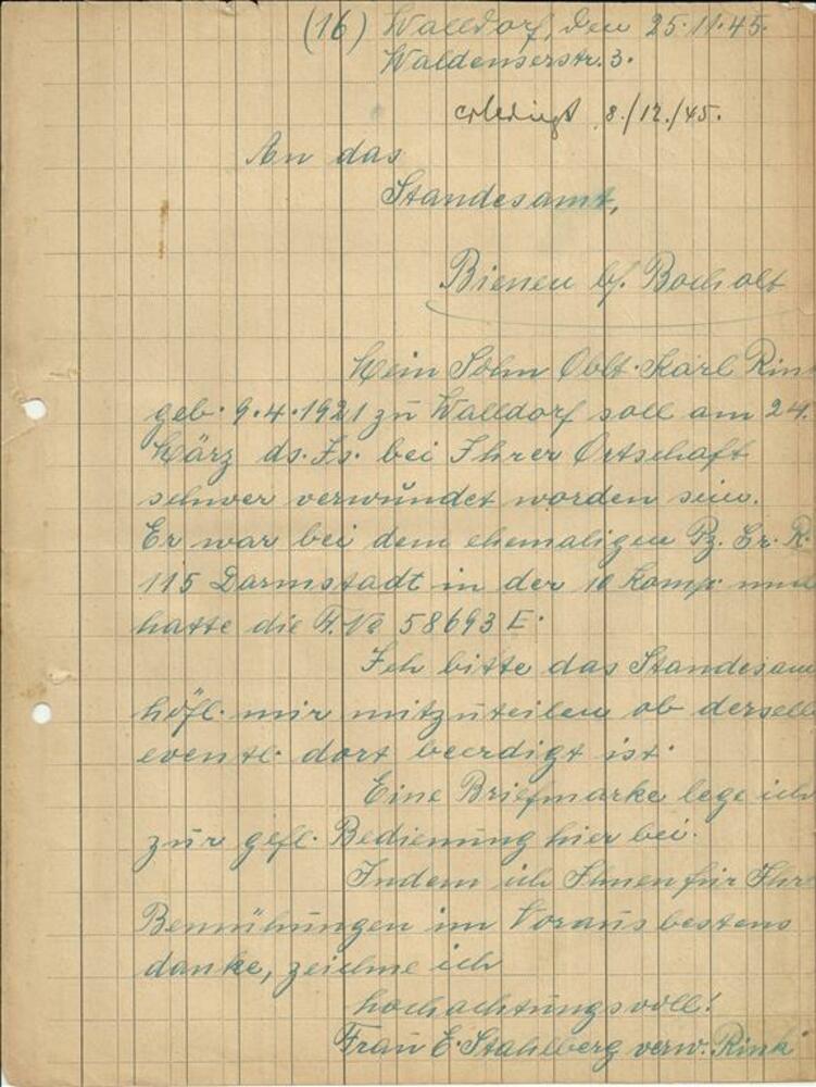 Brief aan het Landesamt Bienen 25 november 1945