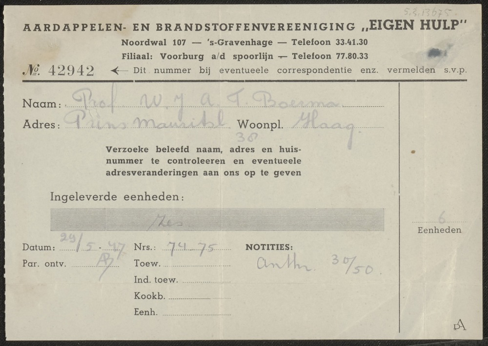 Rekening van de aardappelen- en brandstofvereeniging...