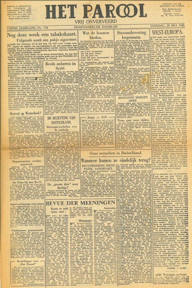 Het Parool, 29 mei 1945, 5e jaargang, No 118
