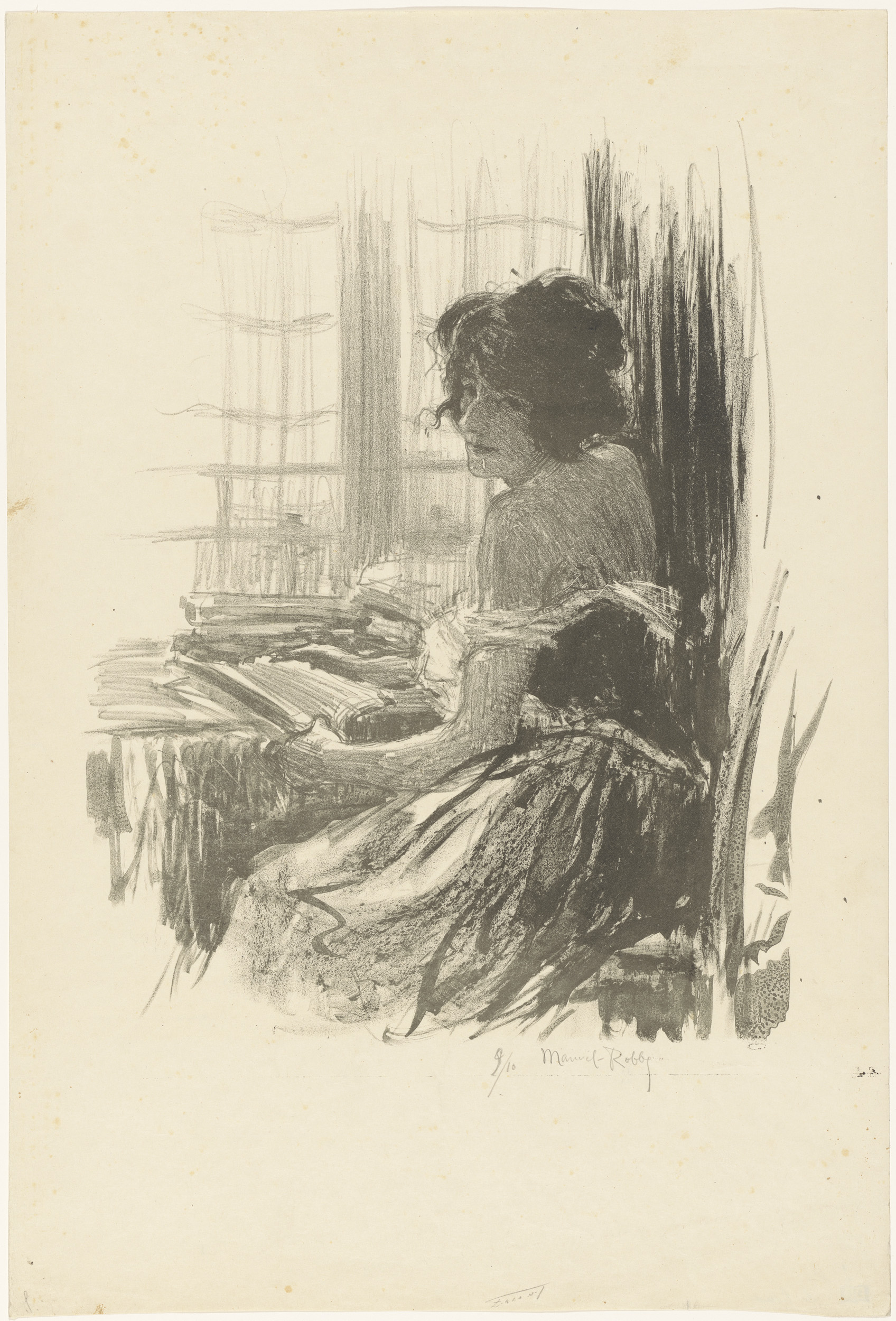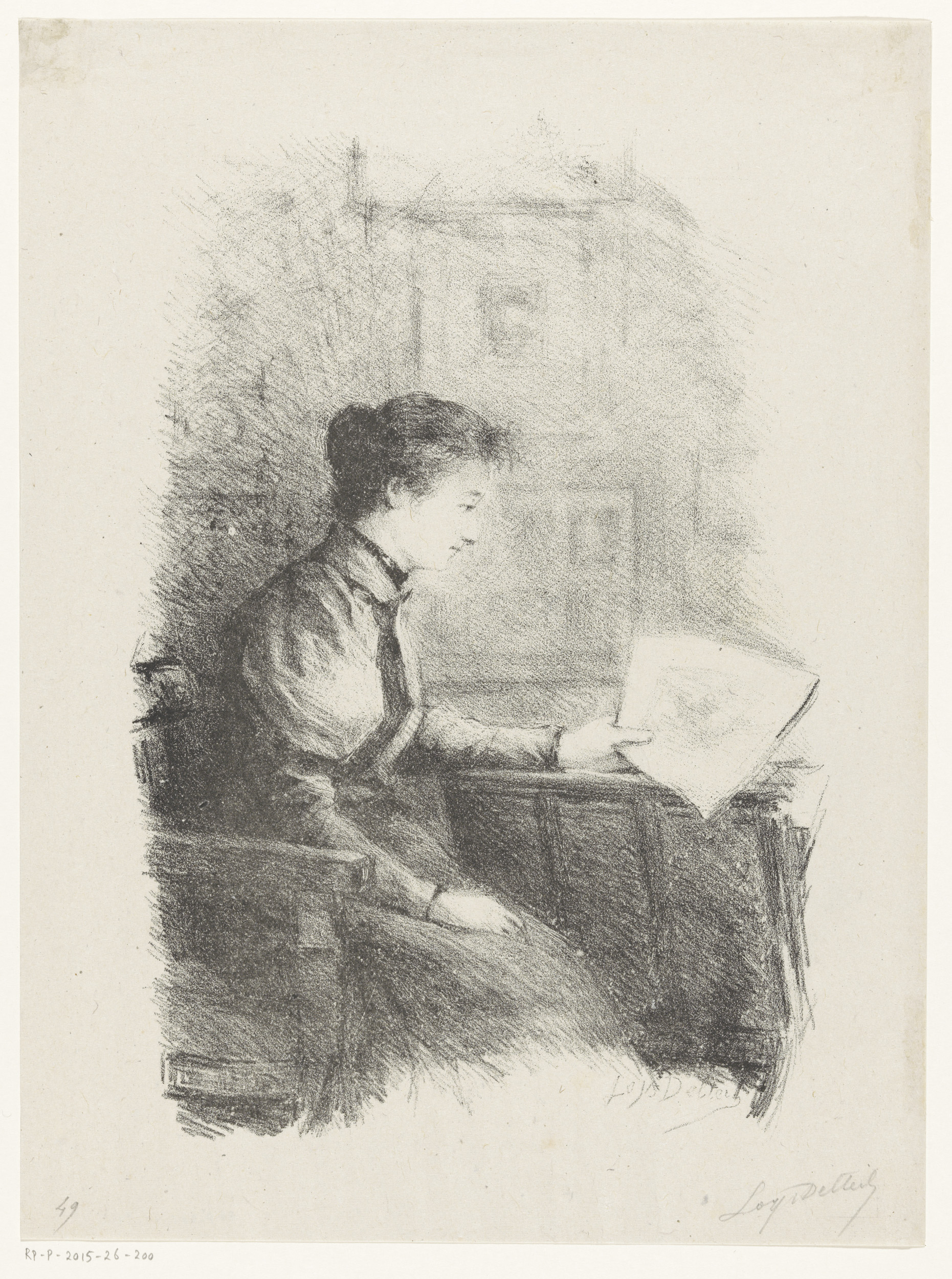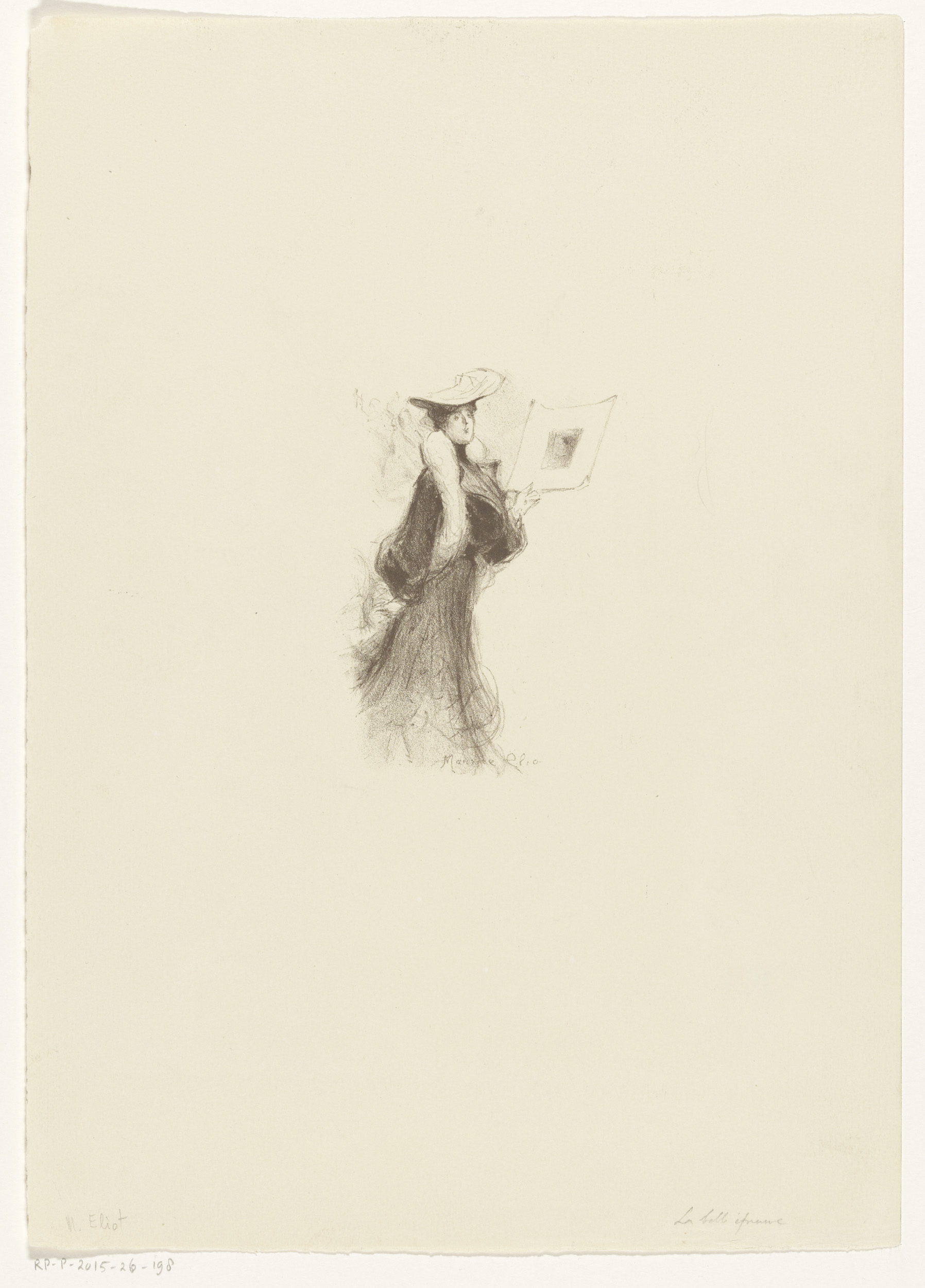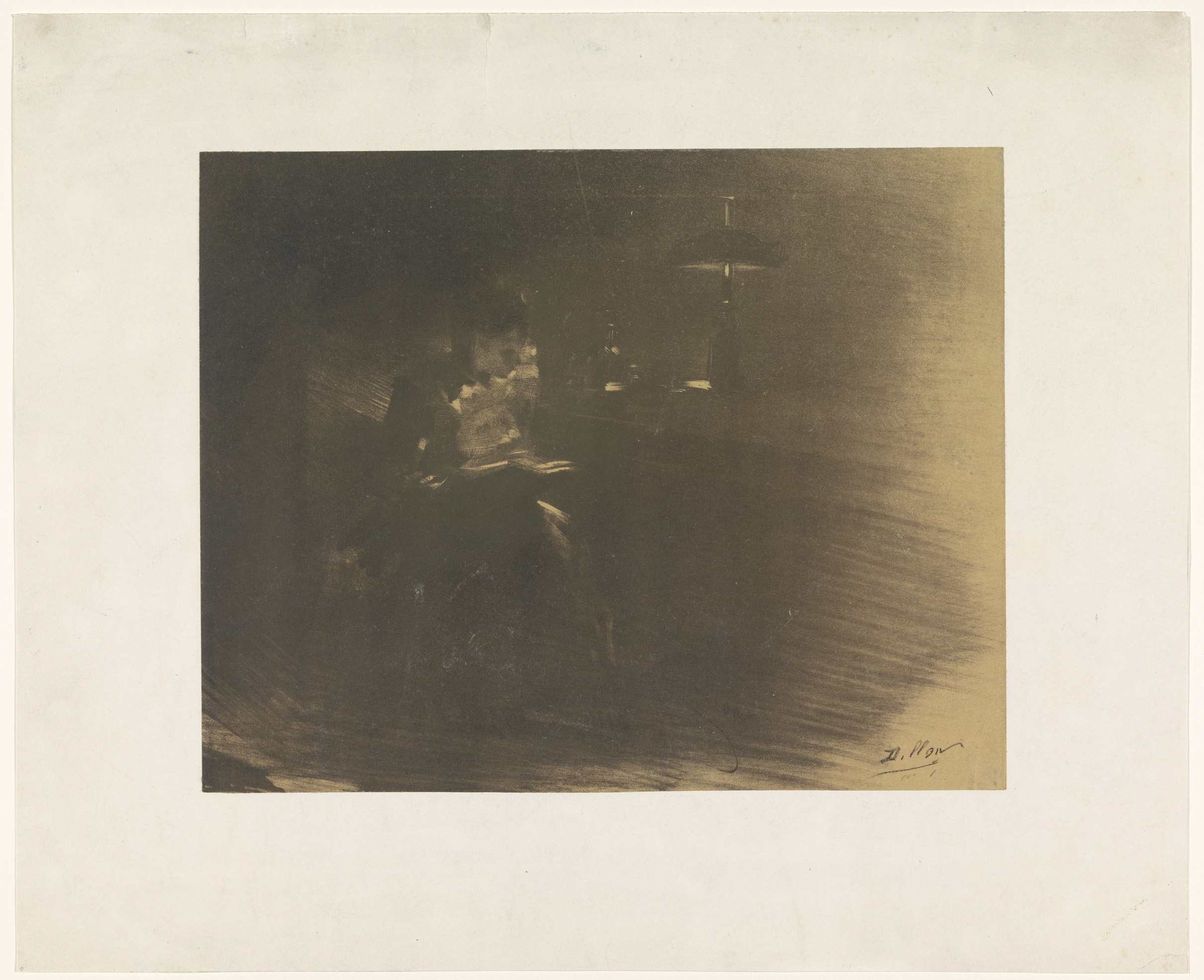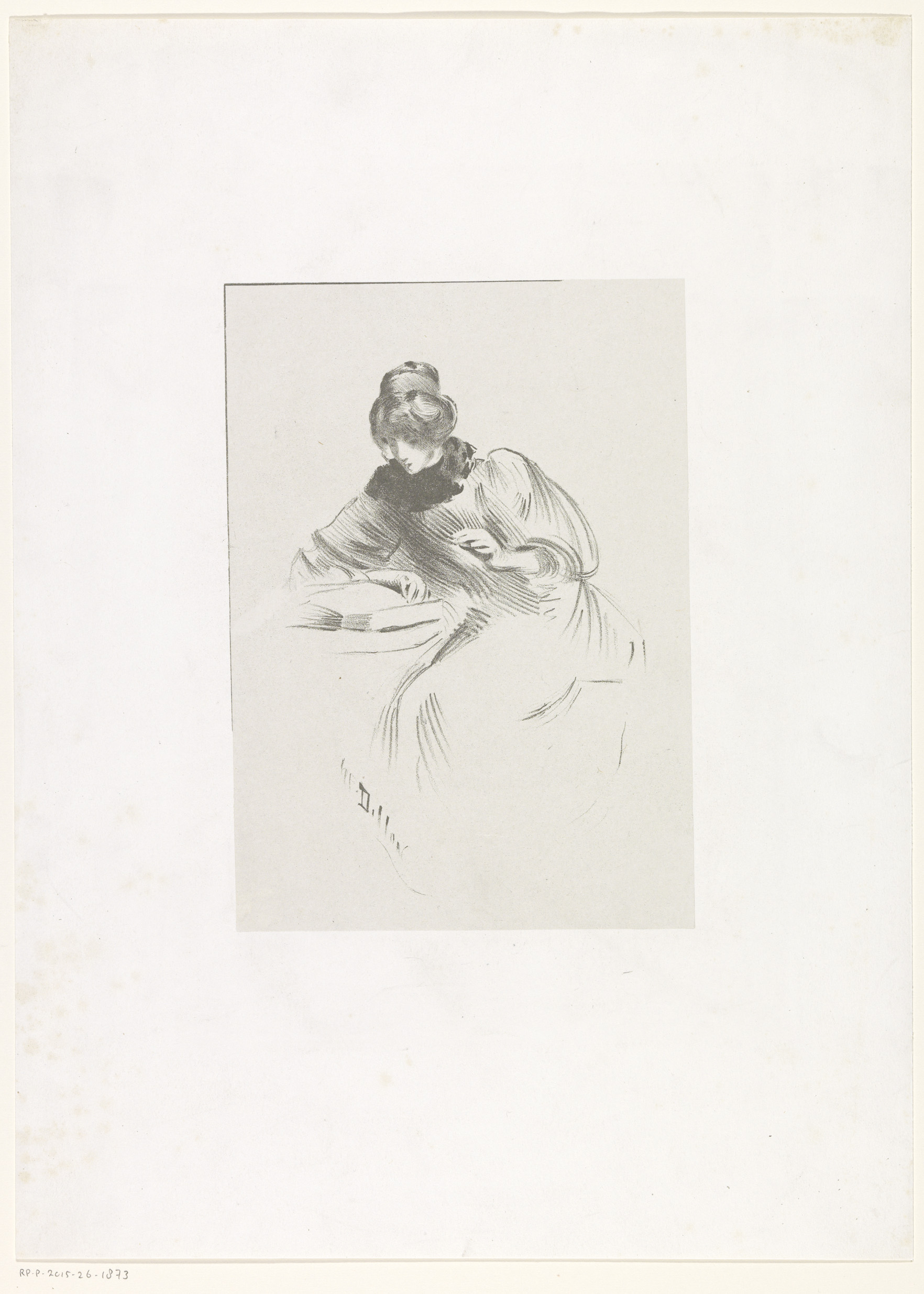 Zittende vrouw bekijkt een prent of tekening, voor h...