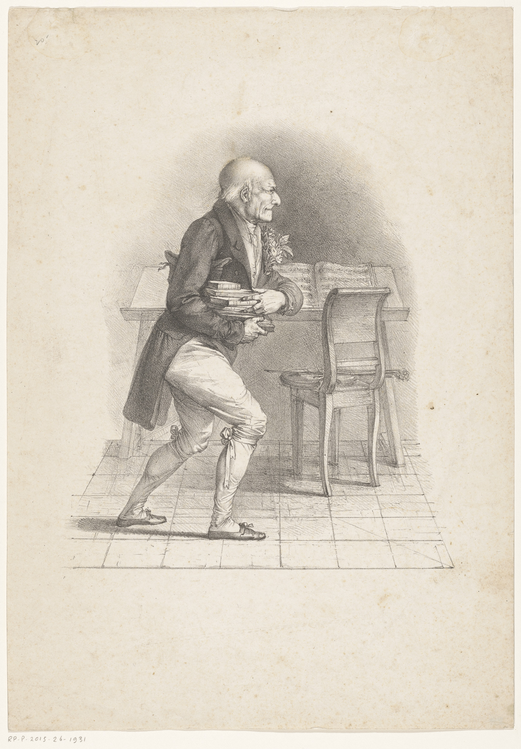 Violist met een stapel boeken onder zijn arm
