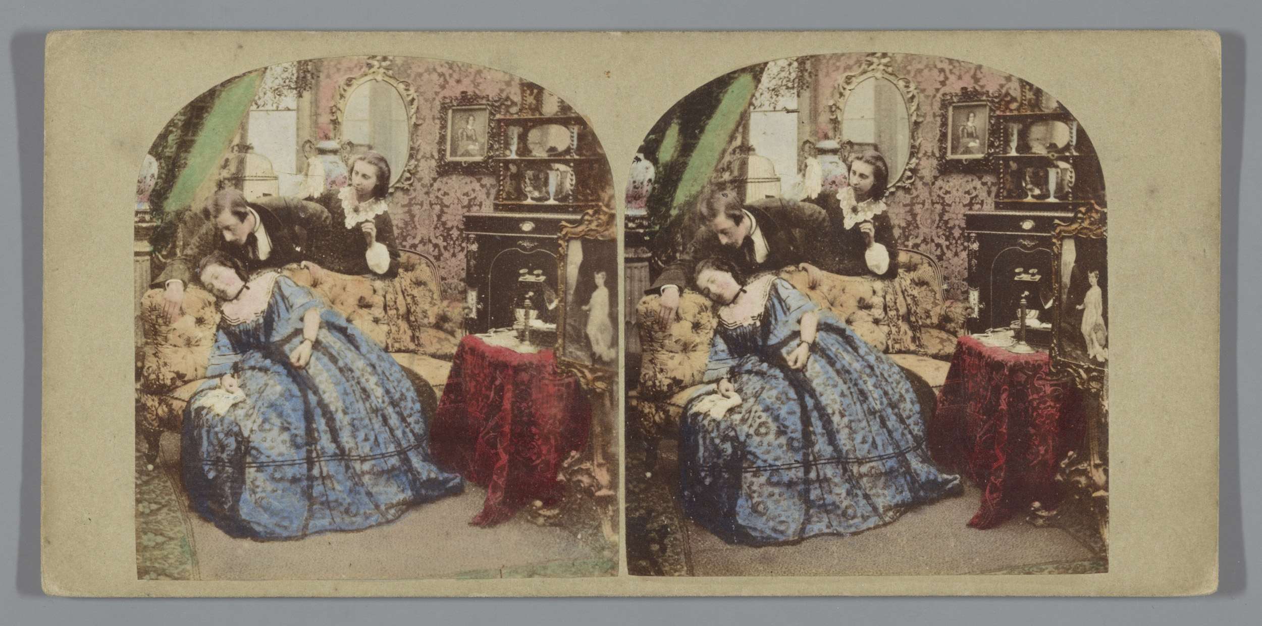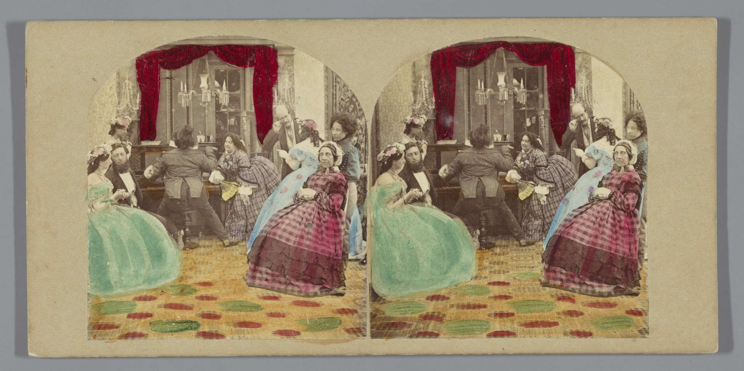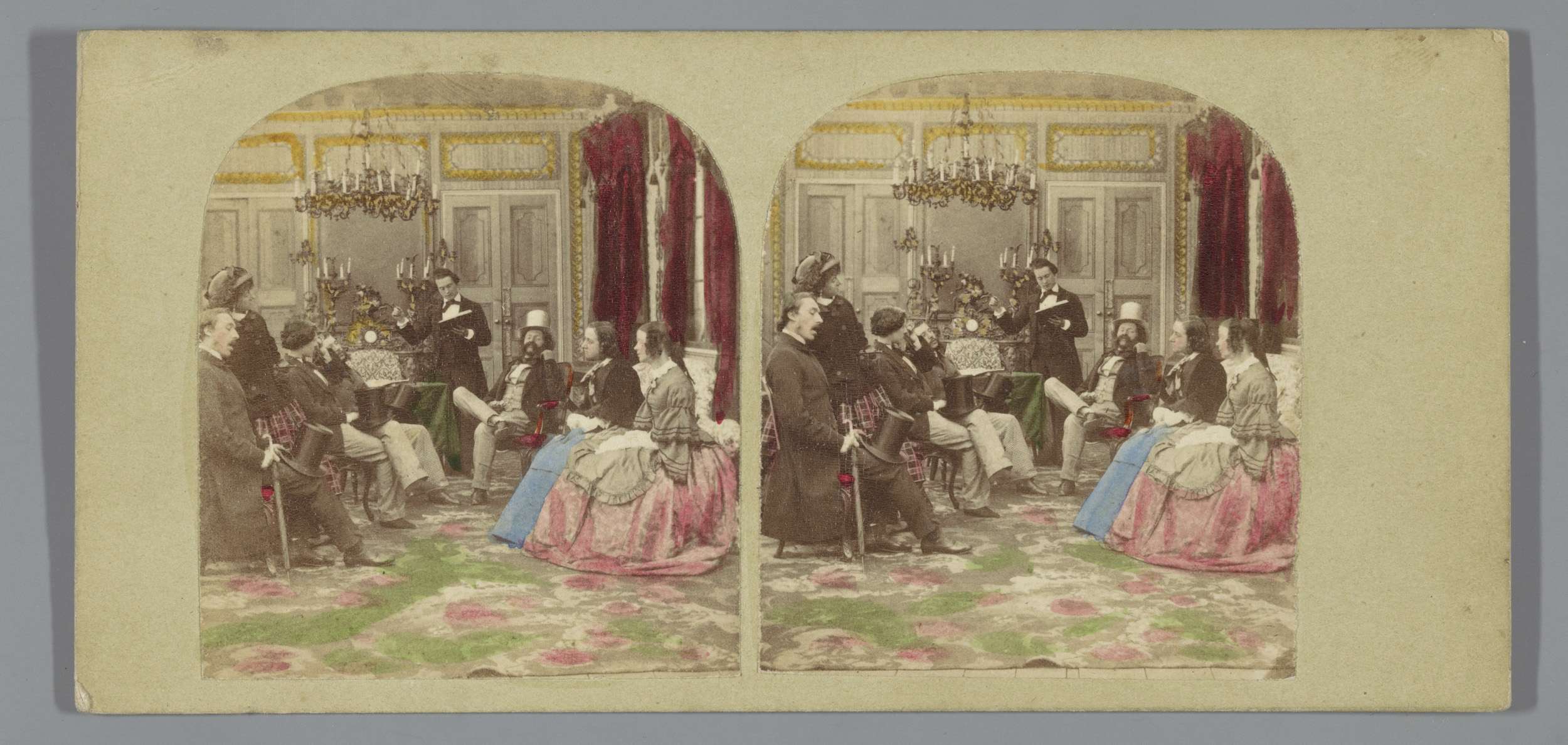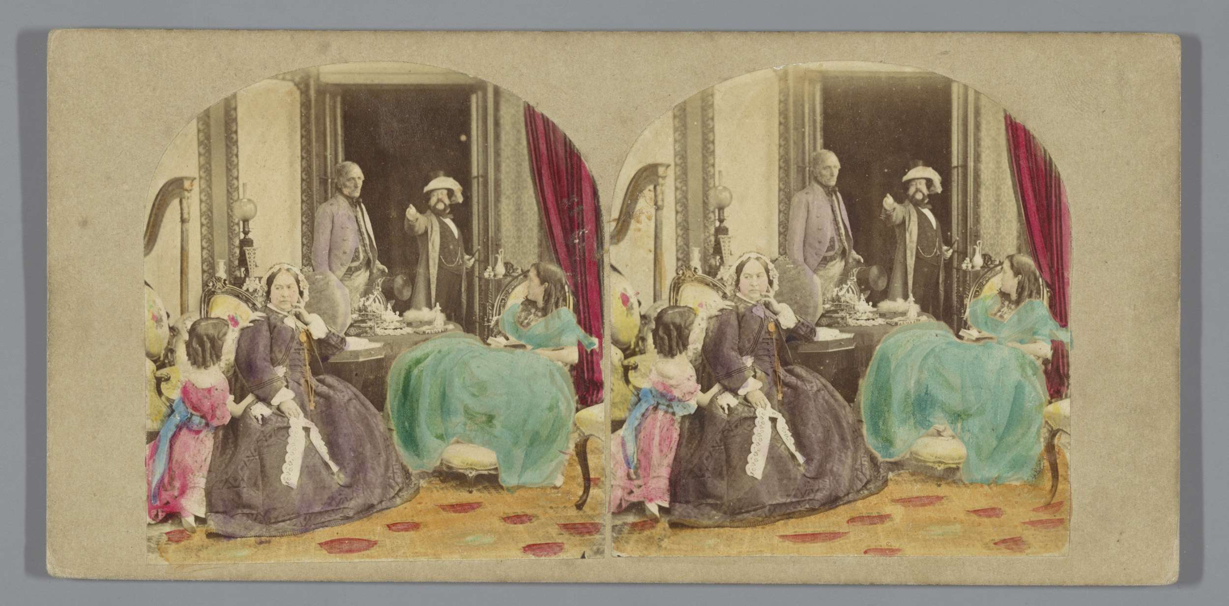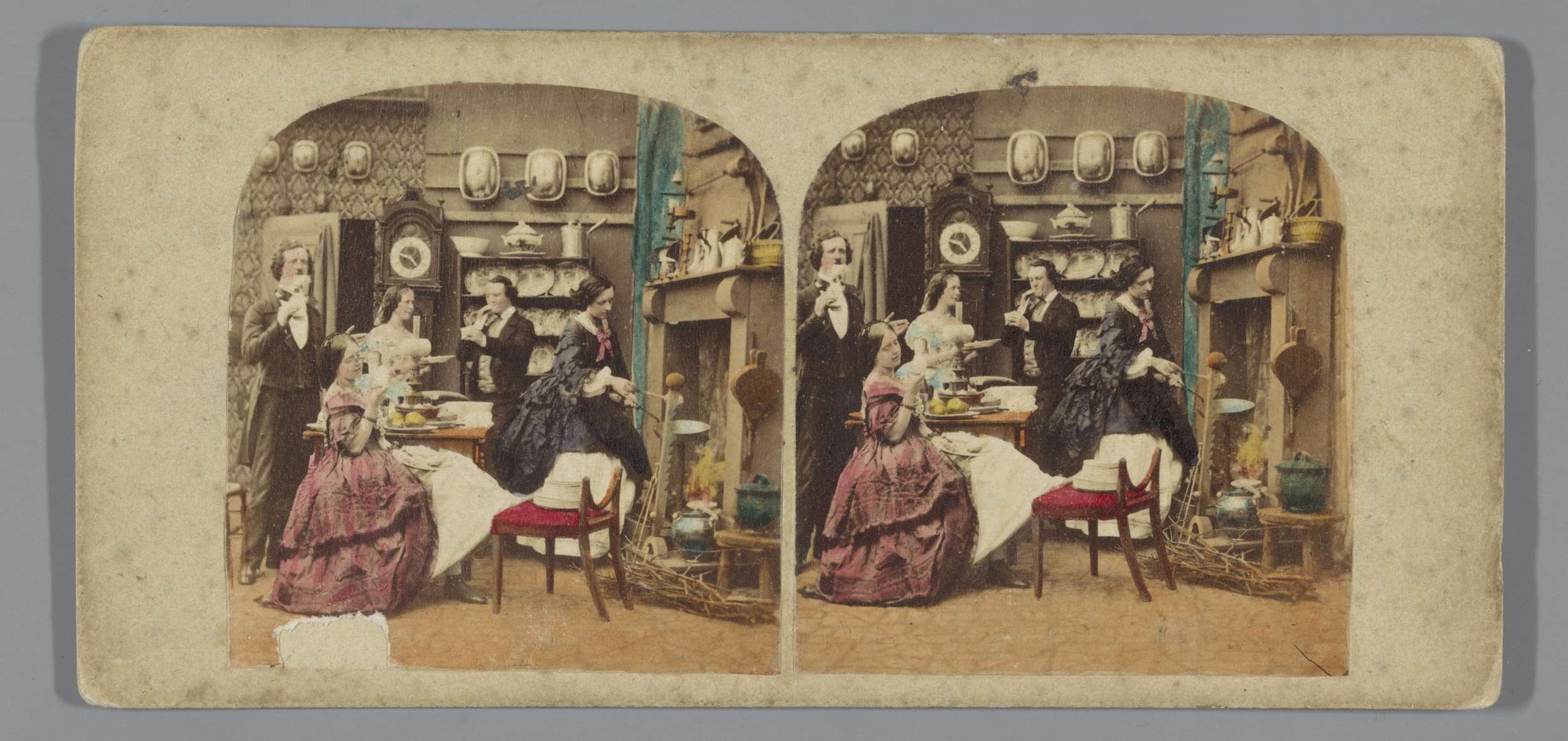 Tafereel in een huiskamer met mogelijk een stereosco...