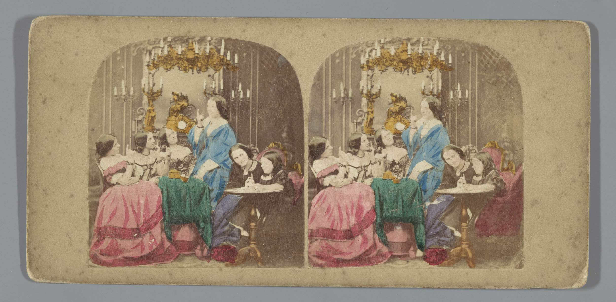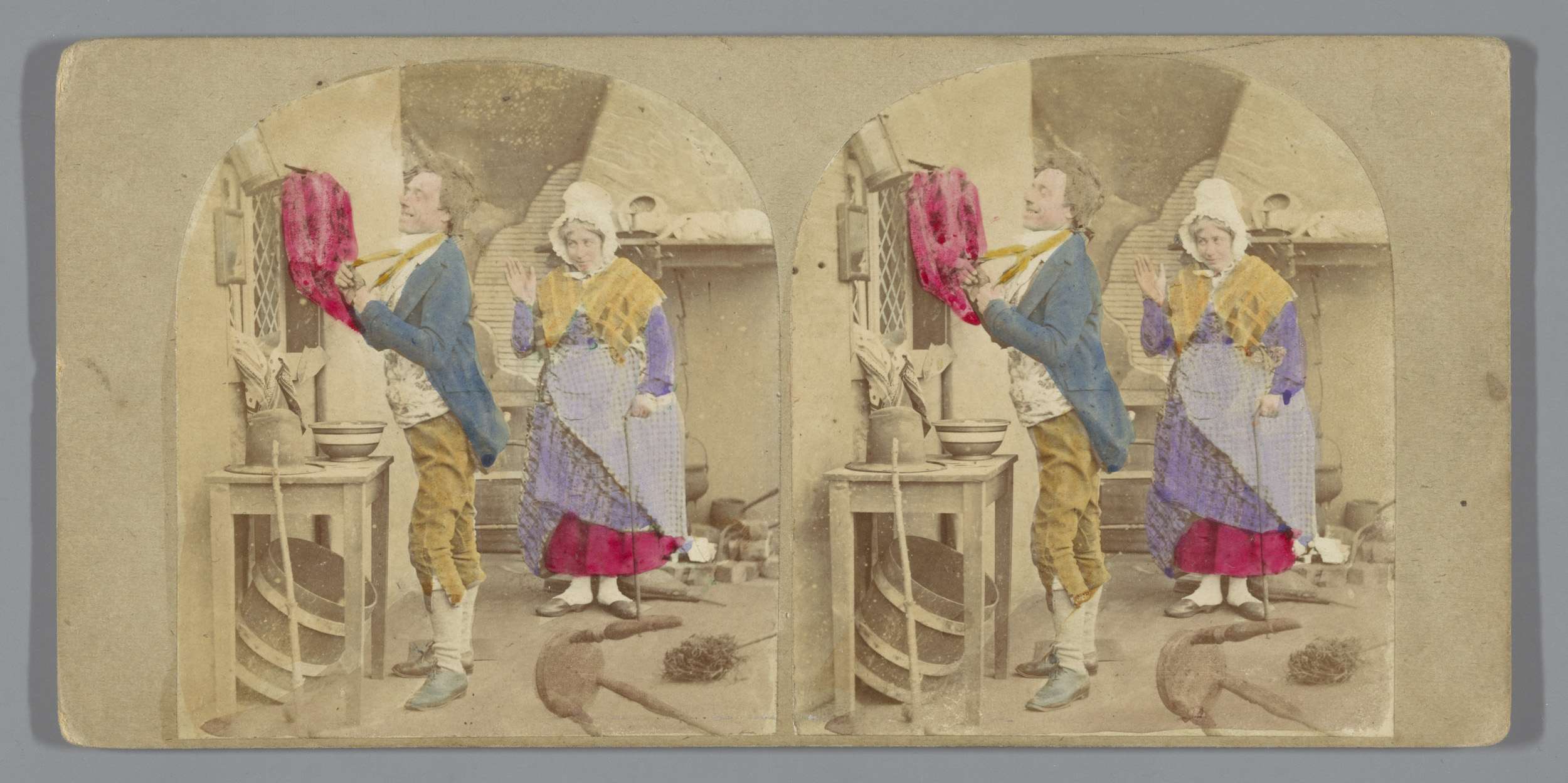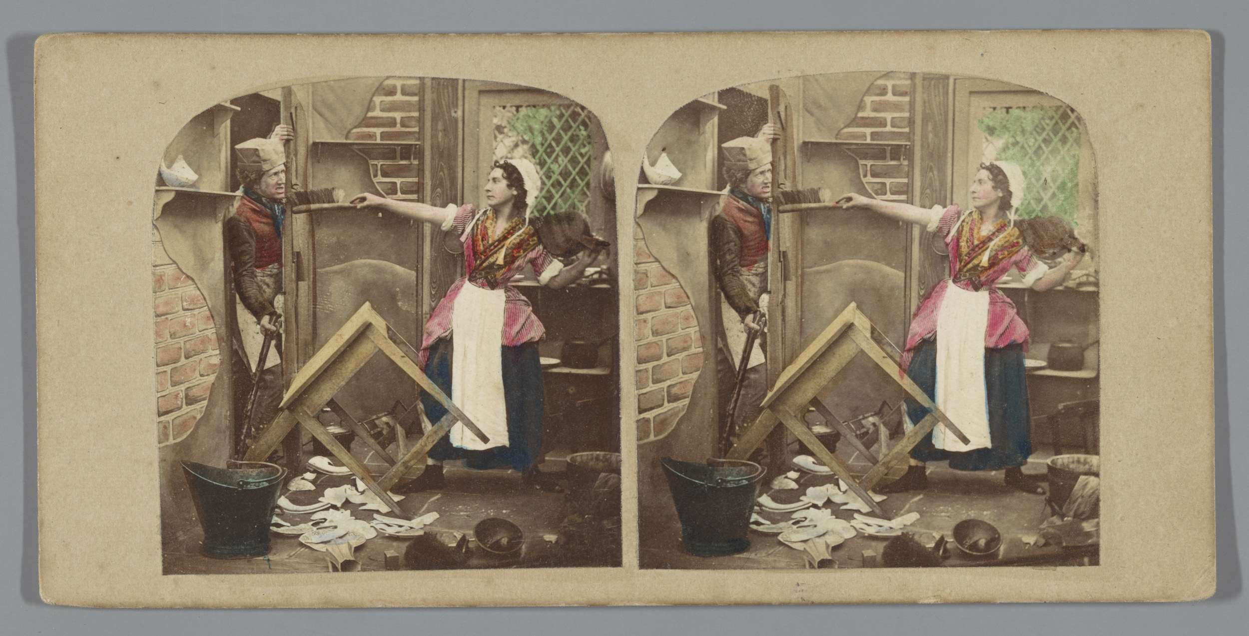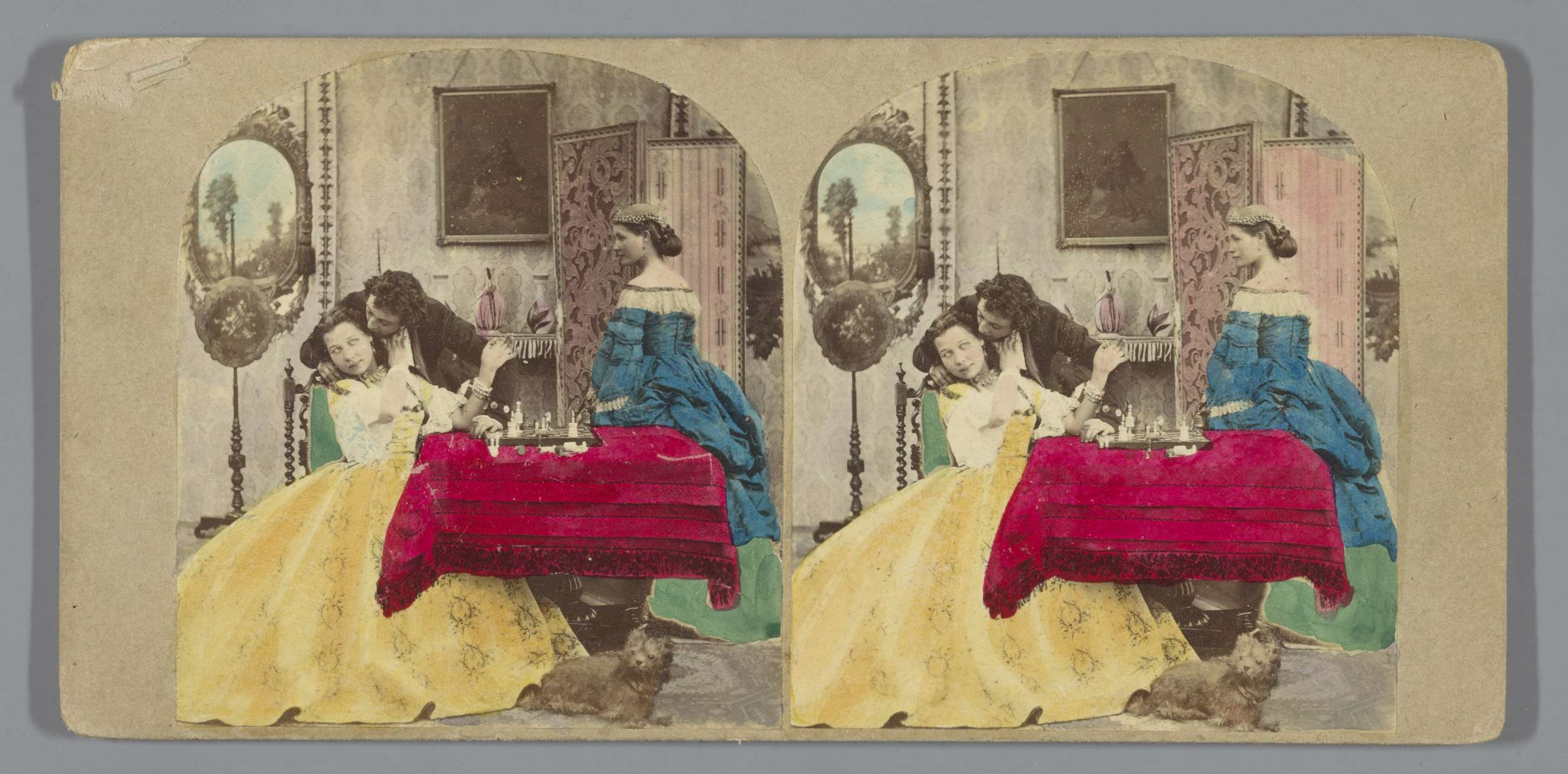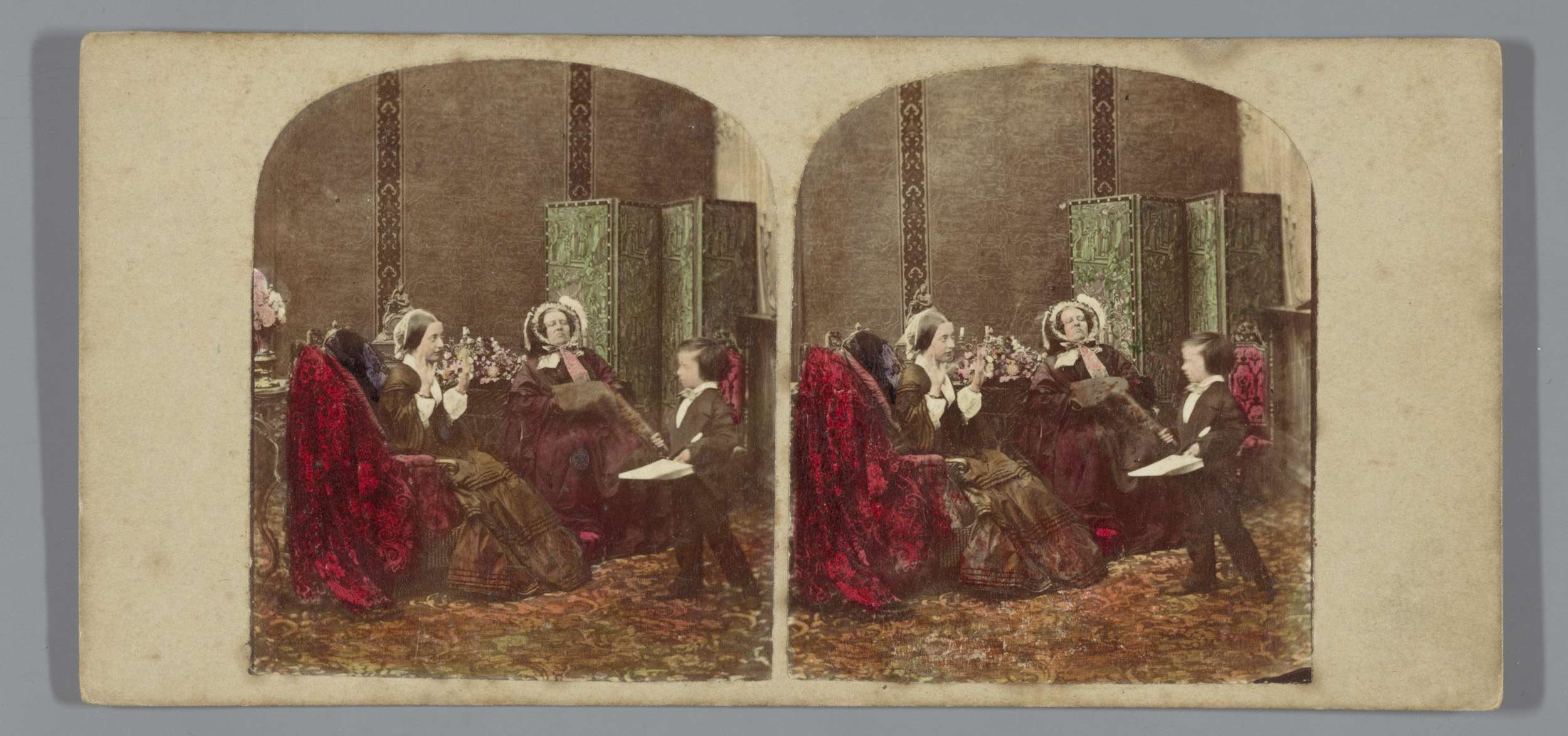 Tafereel in een huiskamer met mogelijk een stereosco...