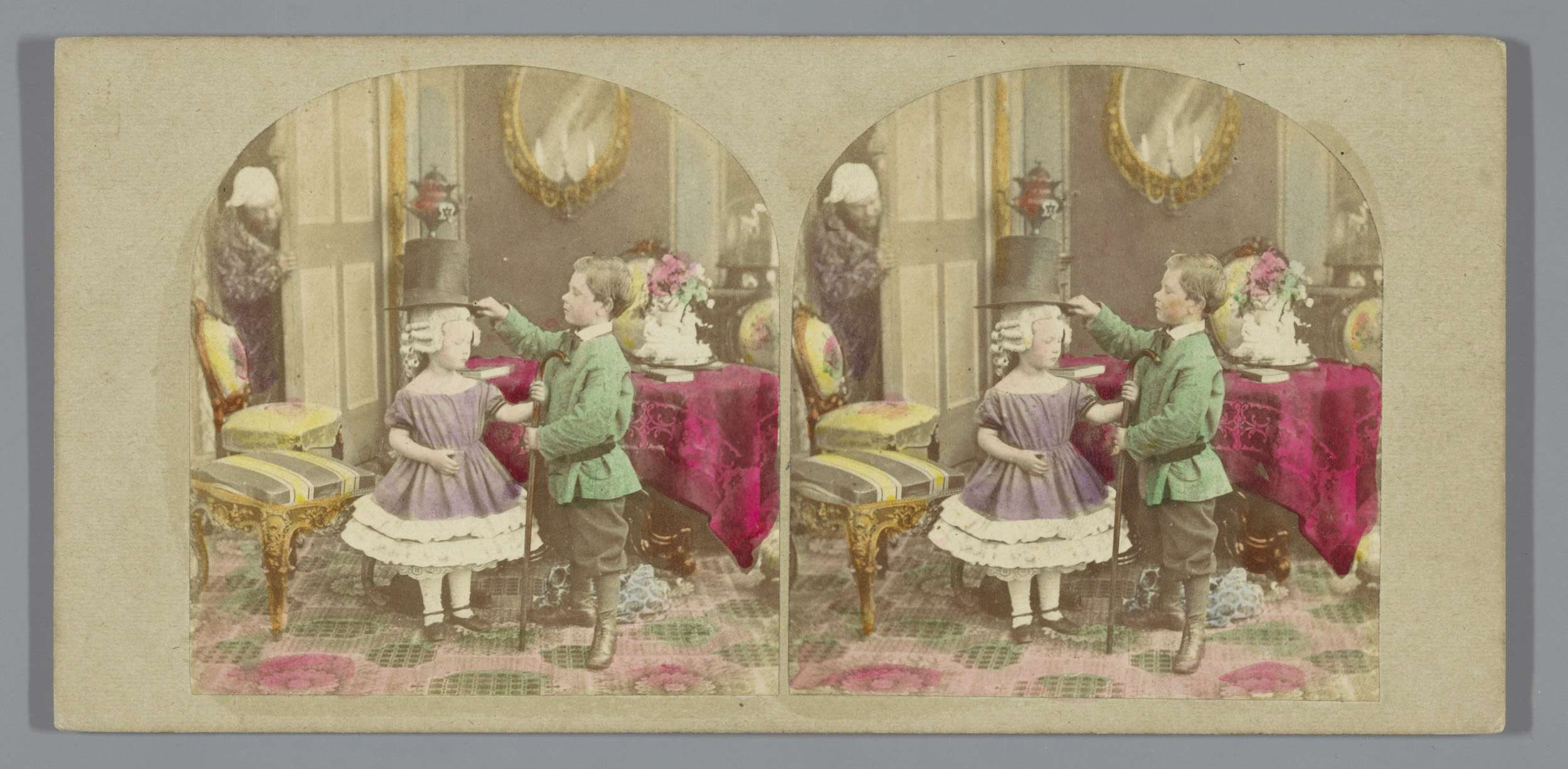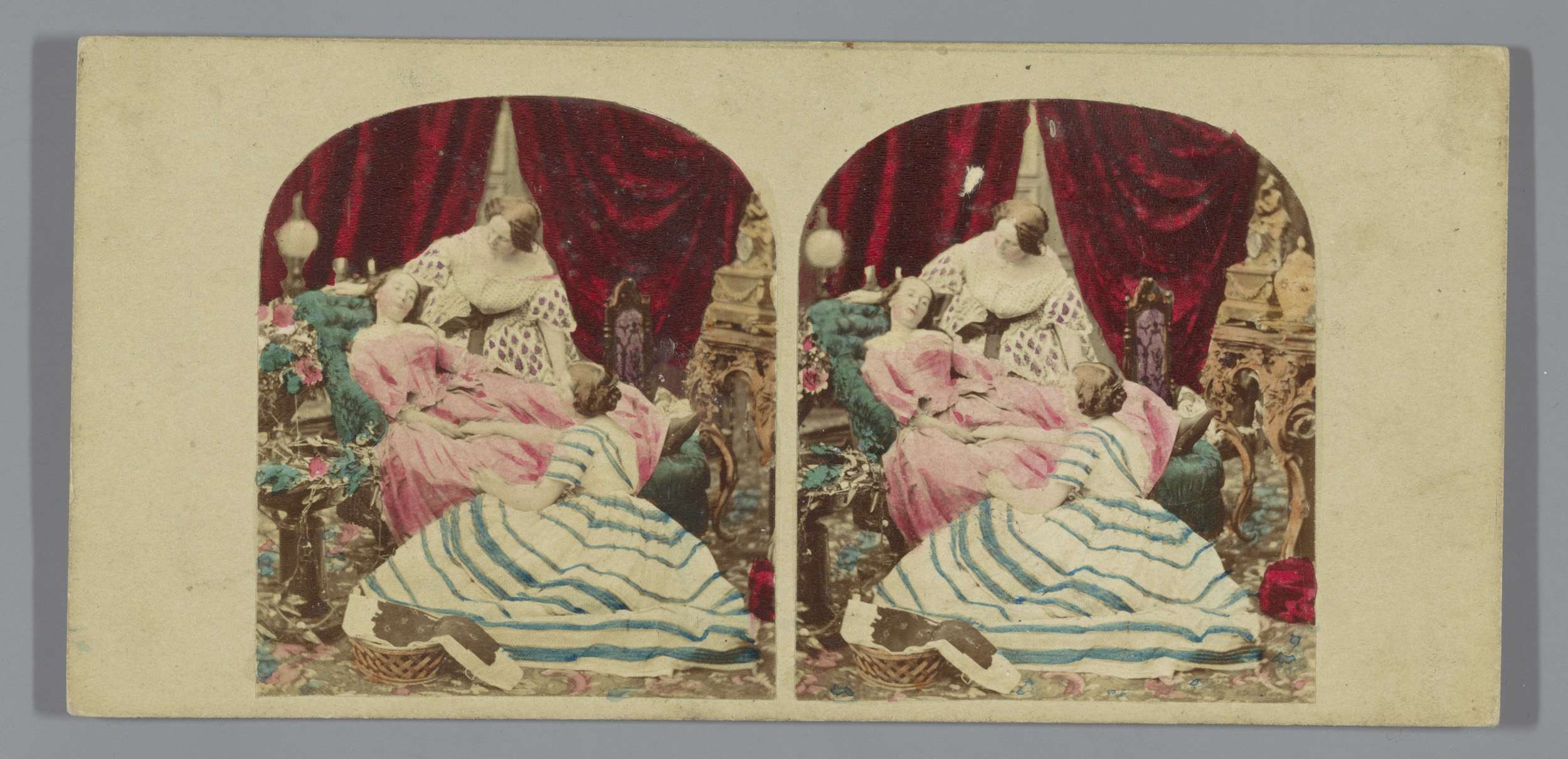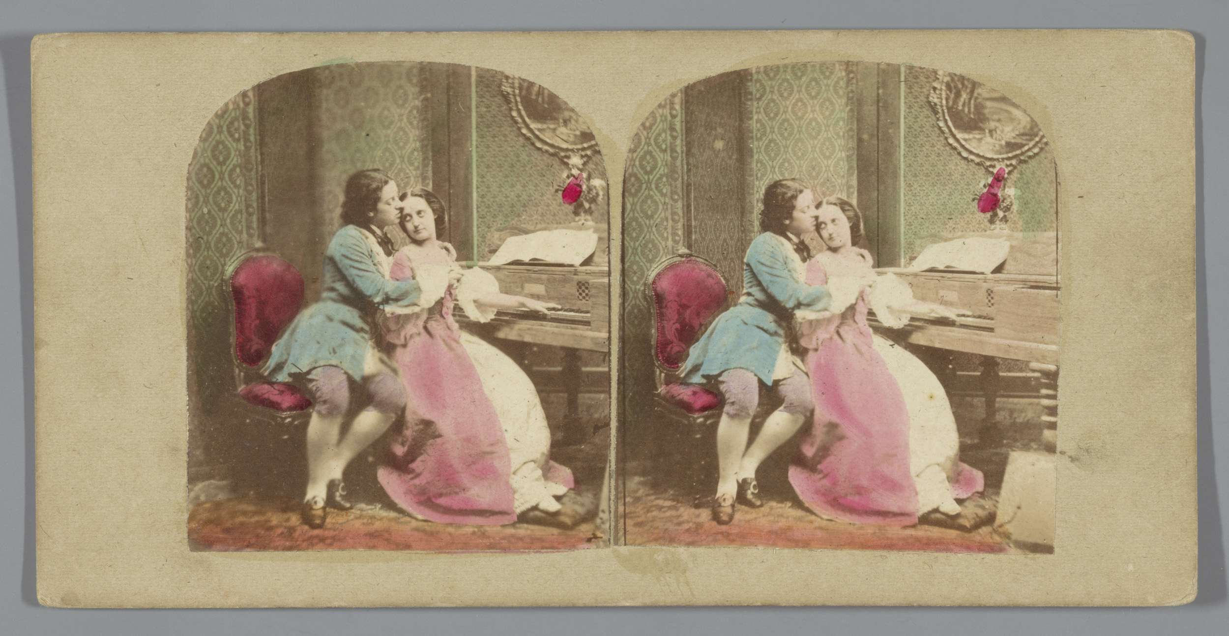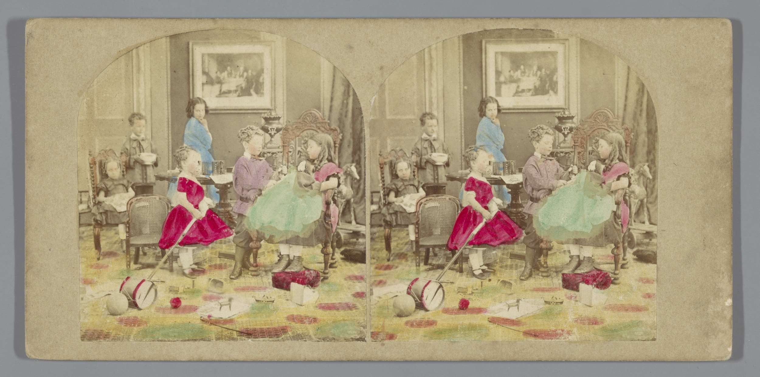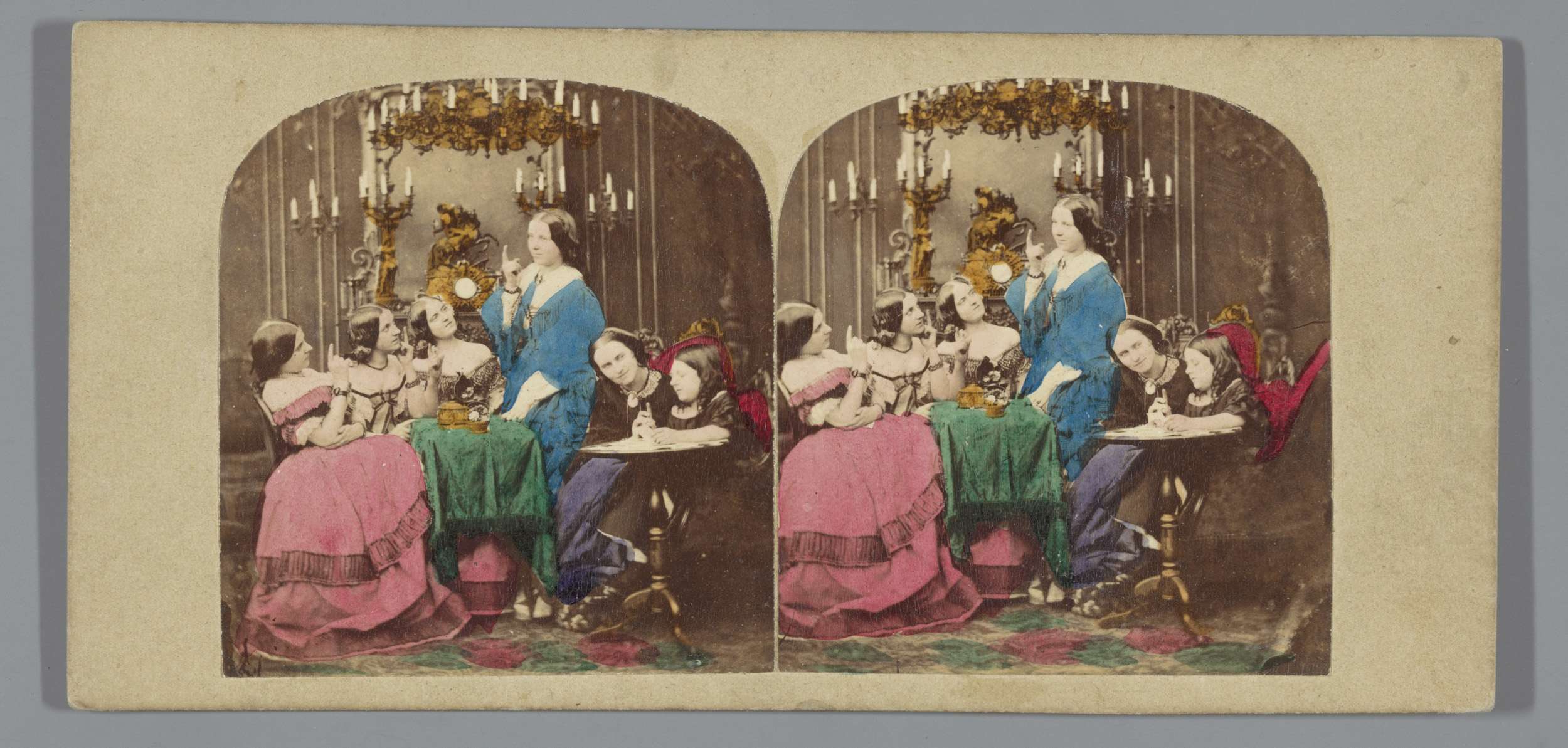 Tafereel in een huiskamer met mogelijk een stereosco...