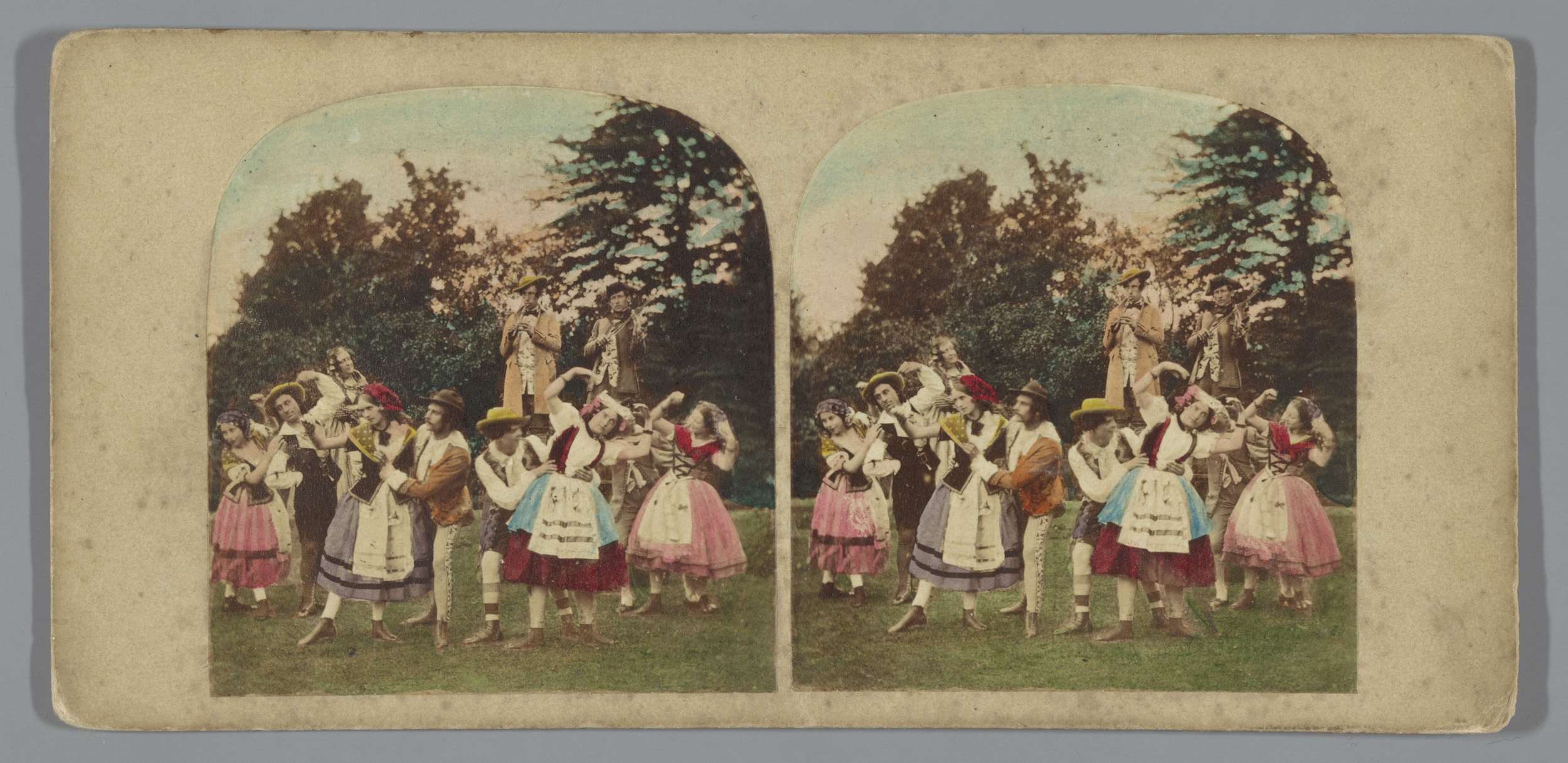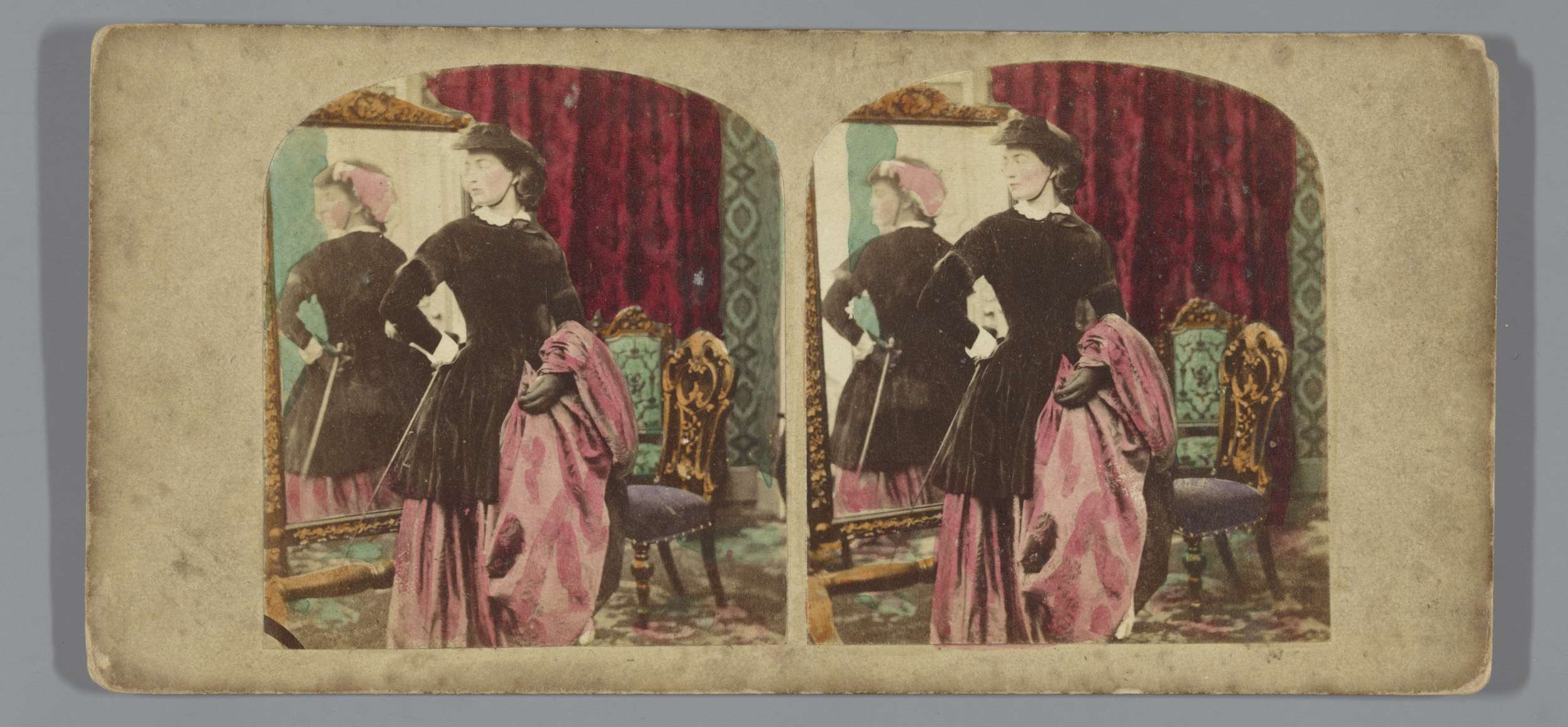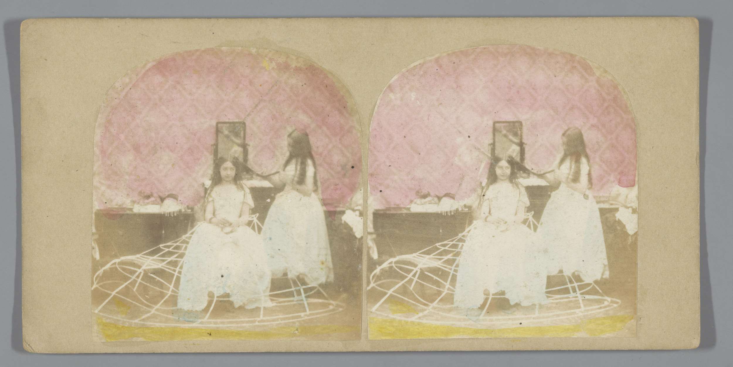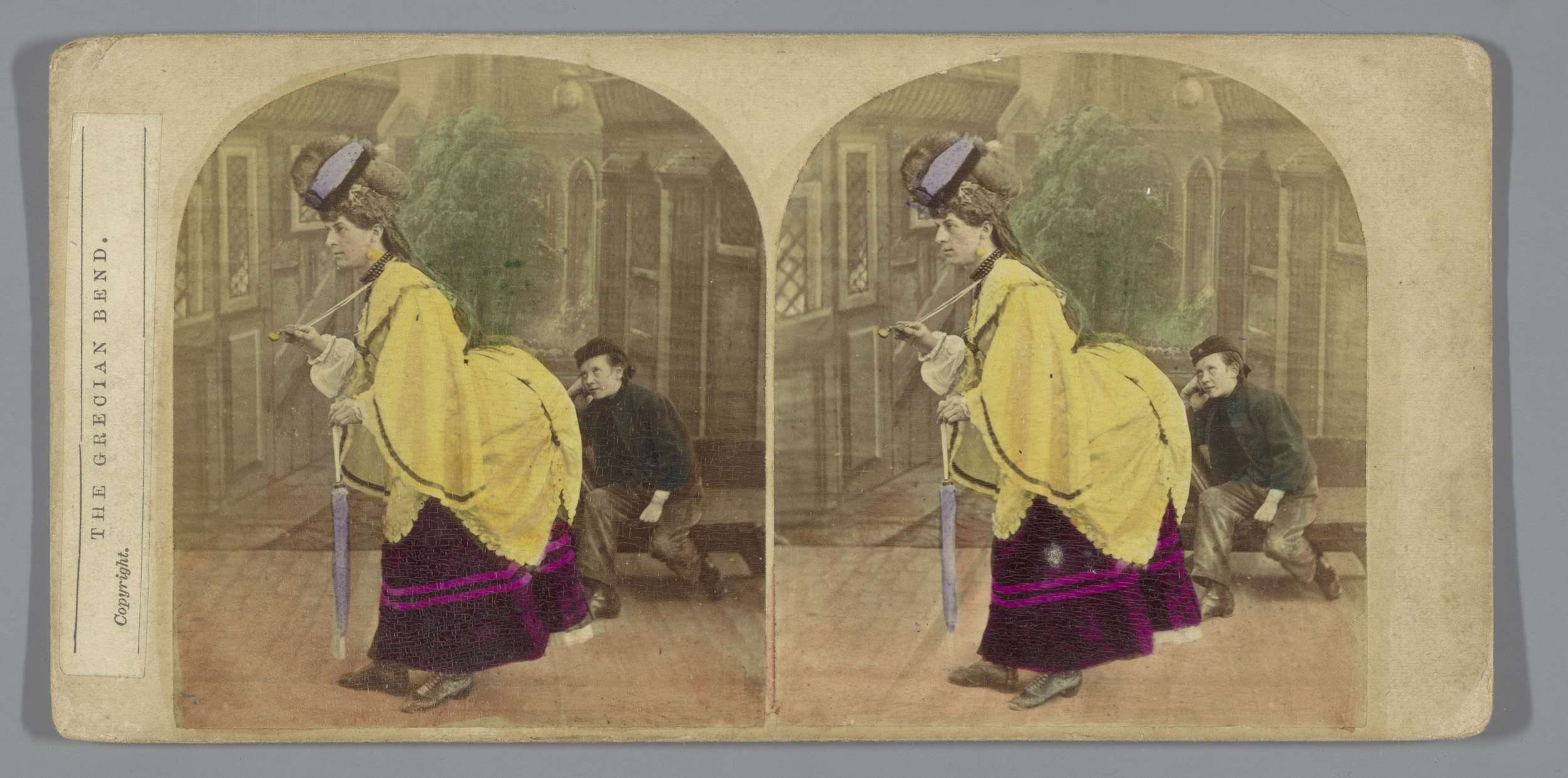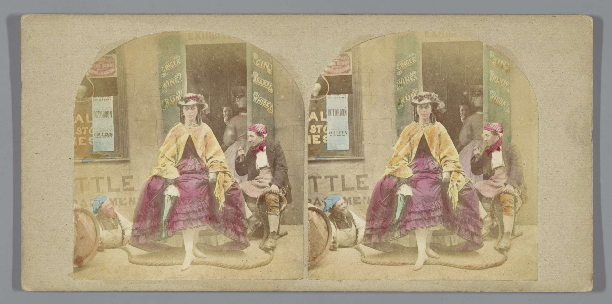 Vrouw in een hoepelrok stapt over een touw dat op de...