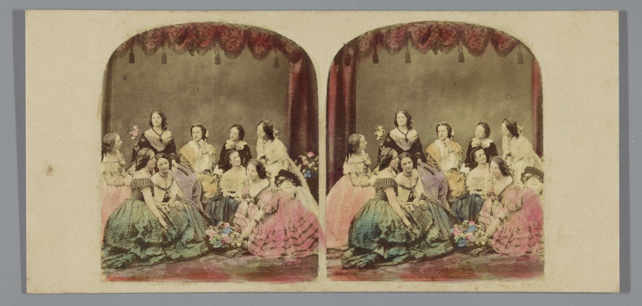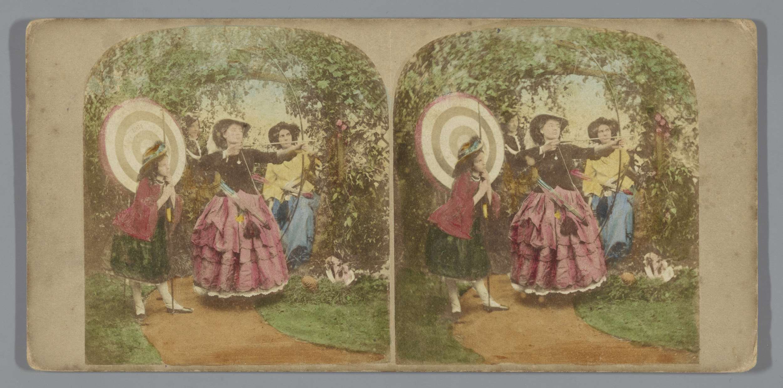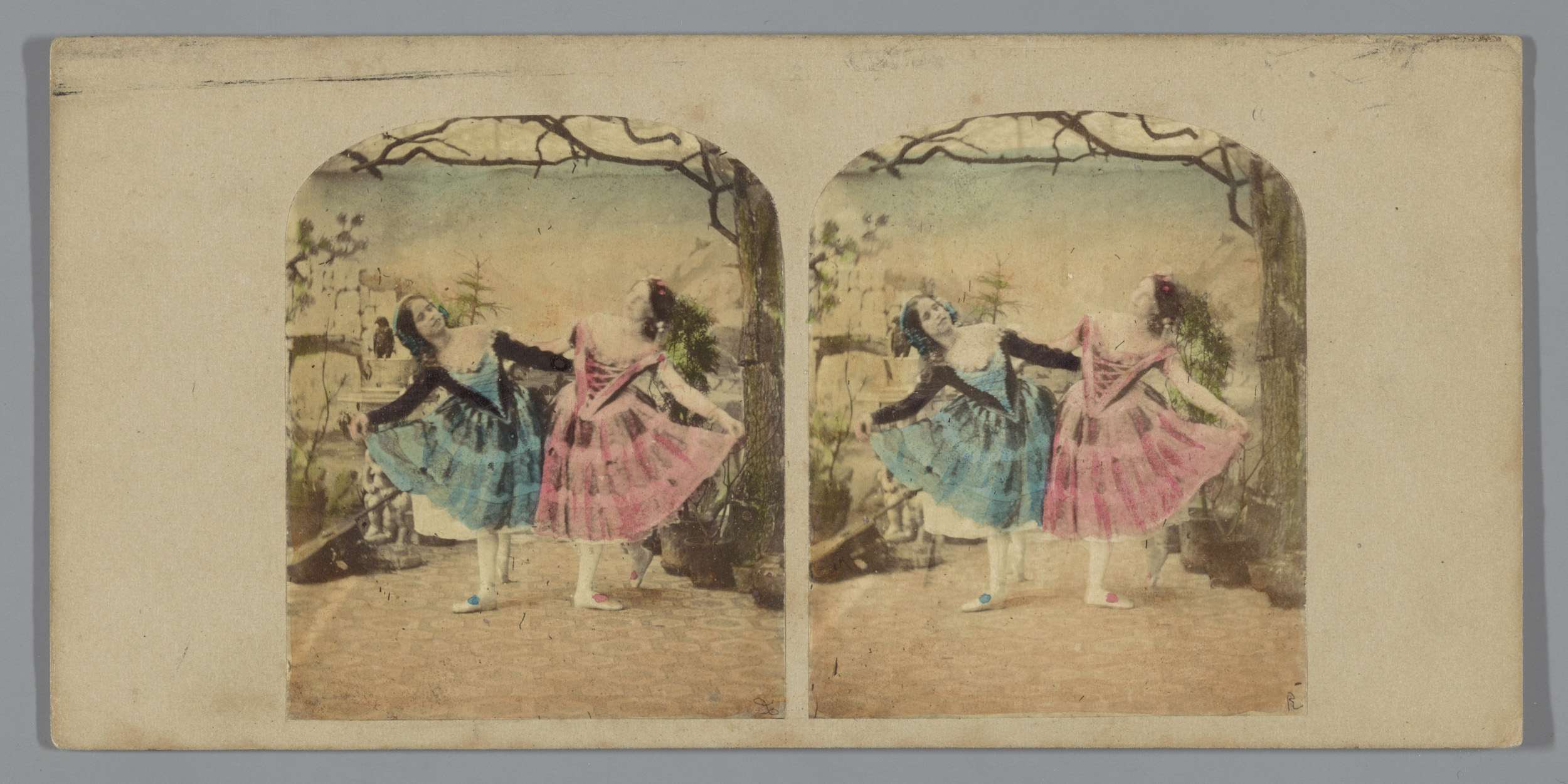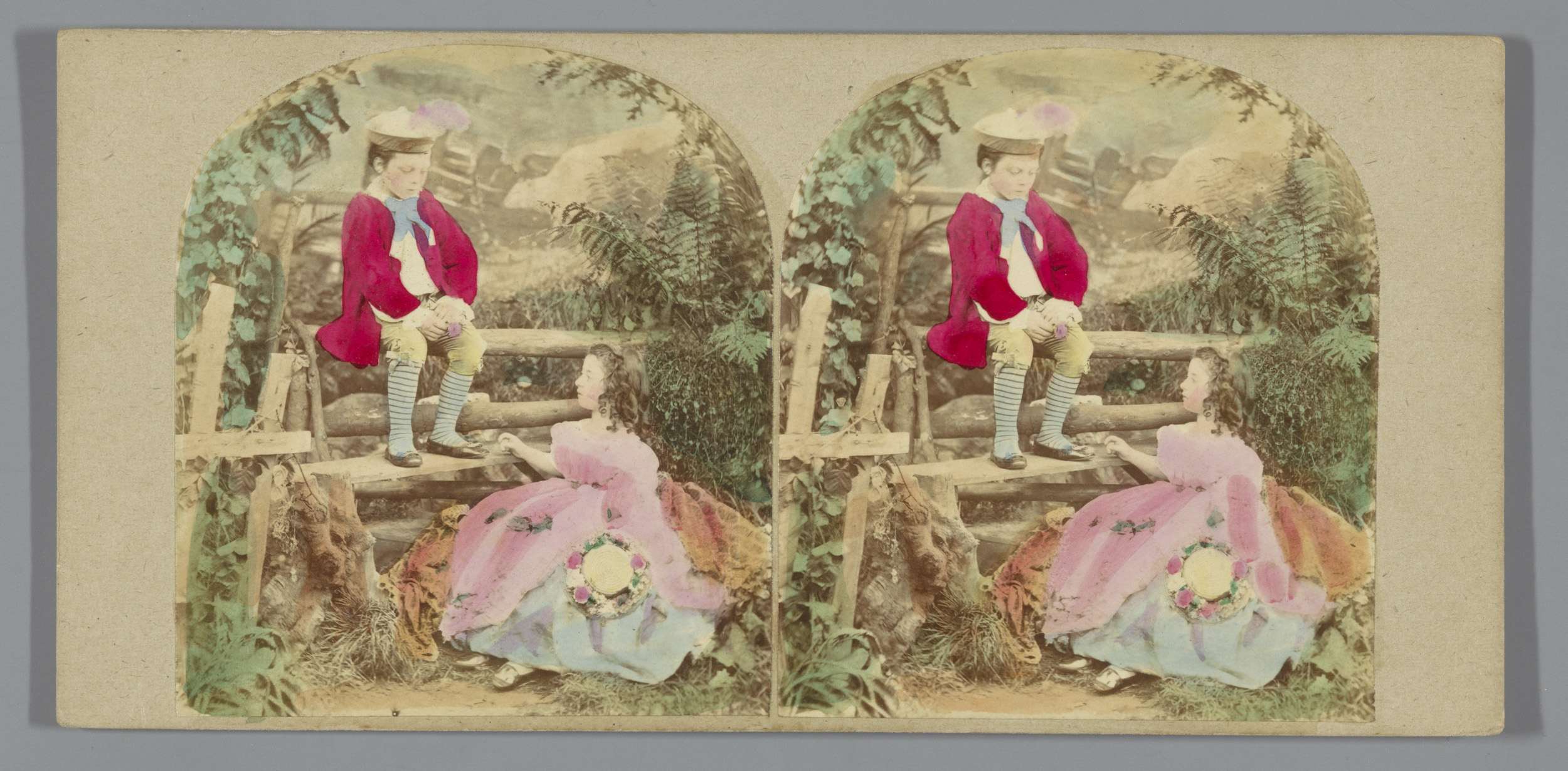 Vrouw in een hoepelrok stapt over een touw dat op de...