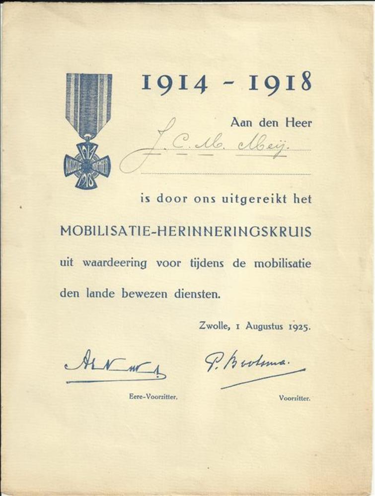 Certificaat 1914 - 1918. Mobilisatie-Herinneringskru...