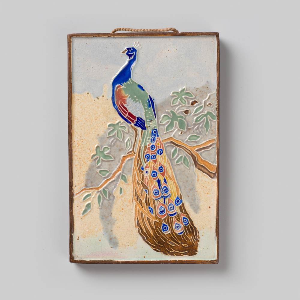 Tegel in cloisonné-techniek, voorstellende: Pauw, ve...