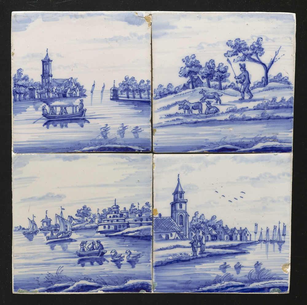 Tegelveld in tinglazuur, voorstellende een landschap...