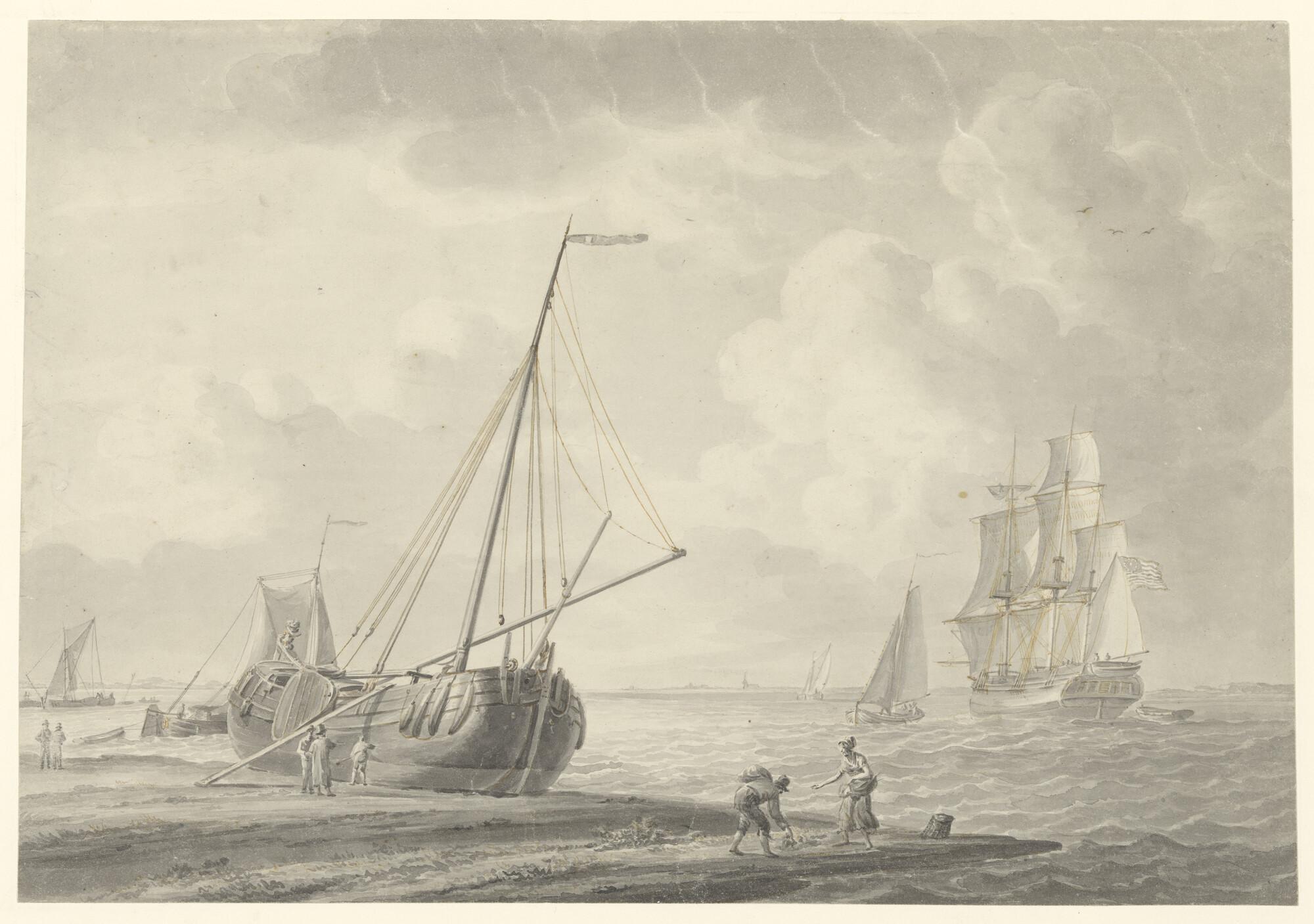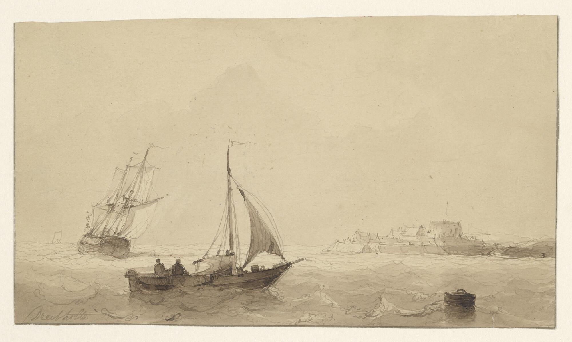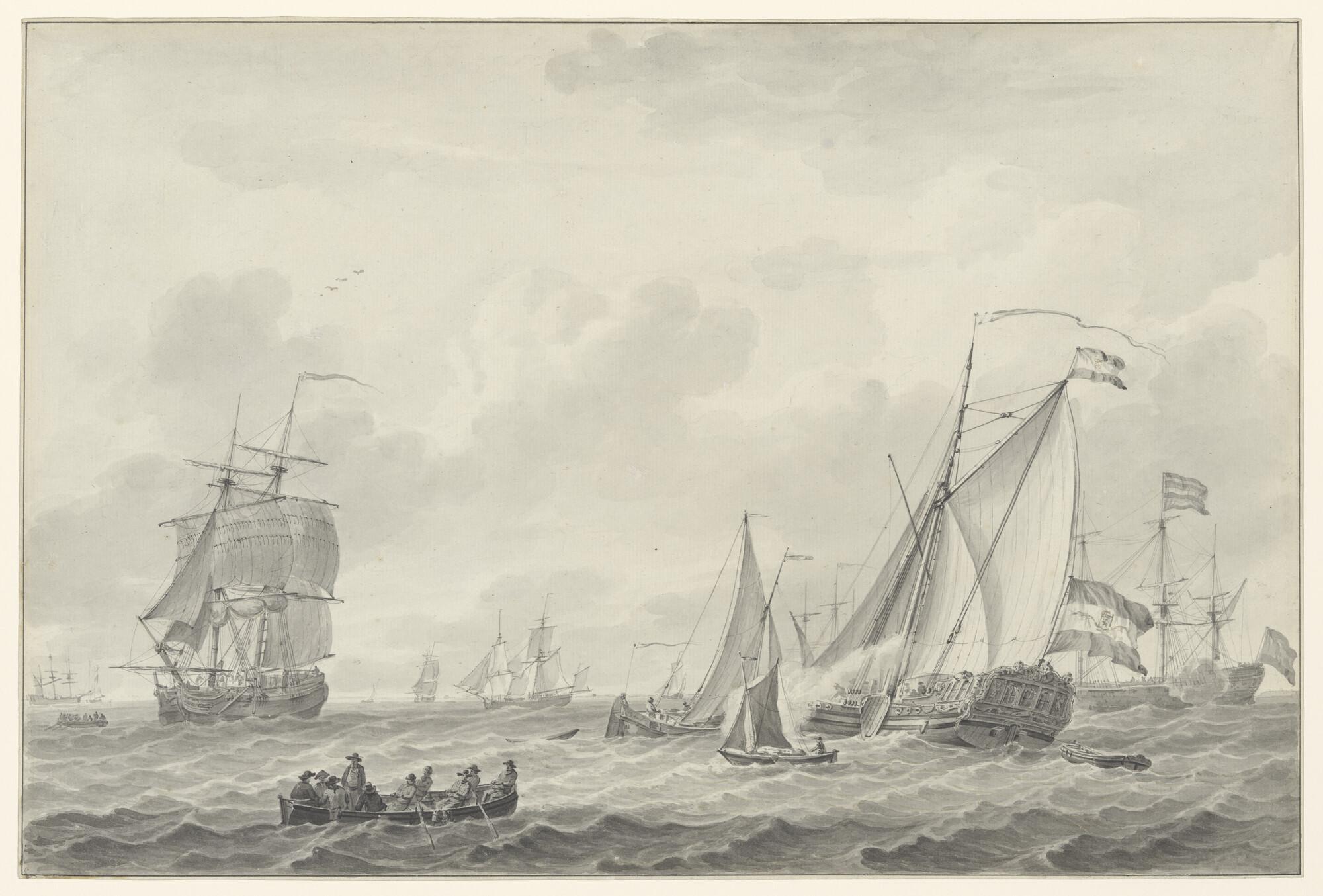 Het oorlogsschip Dordrecht en andere schepen onder zeil