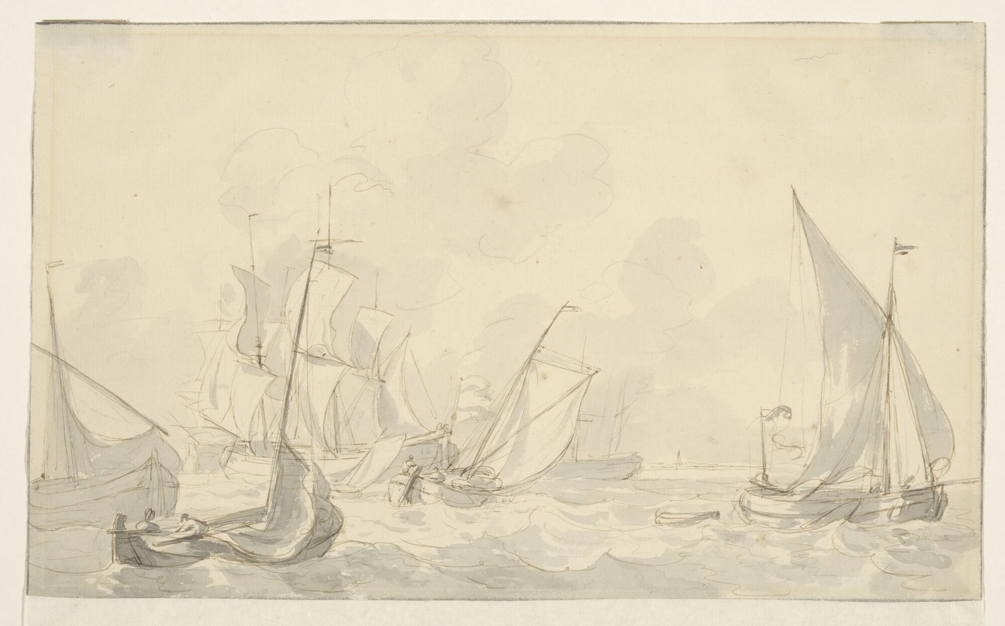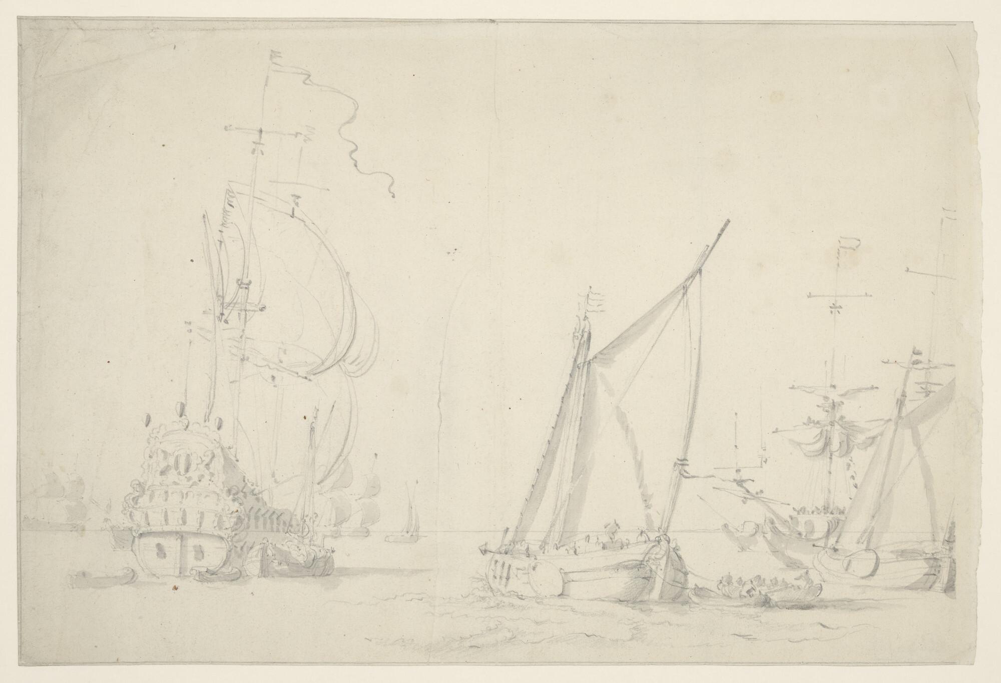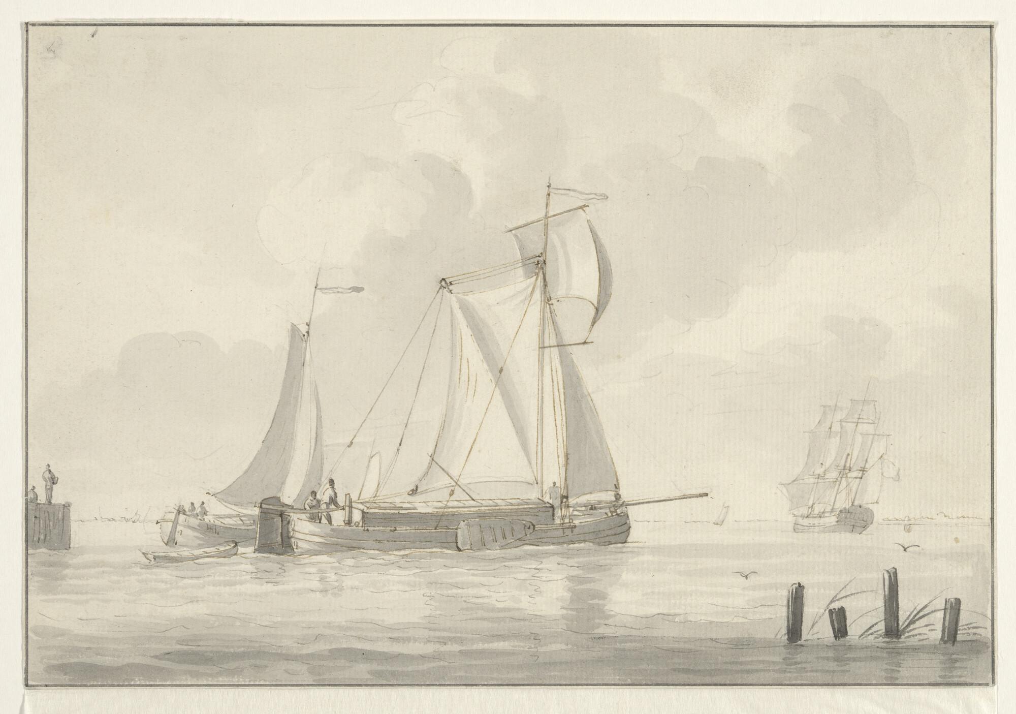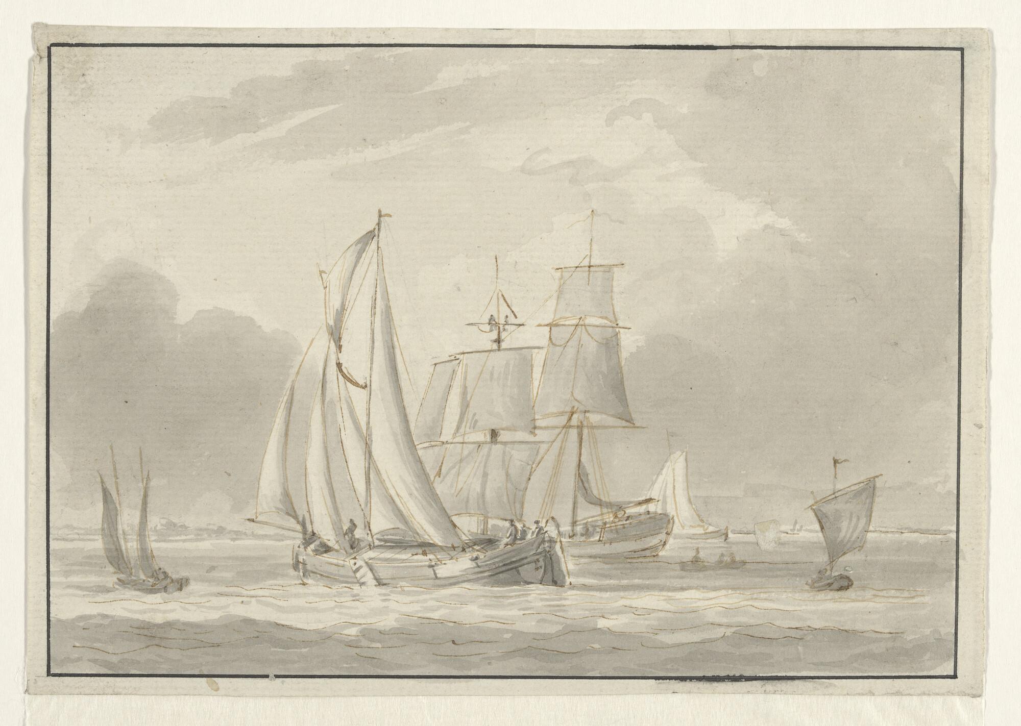 Een spiegelpaviljoenjacht en andere schepen op een rede