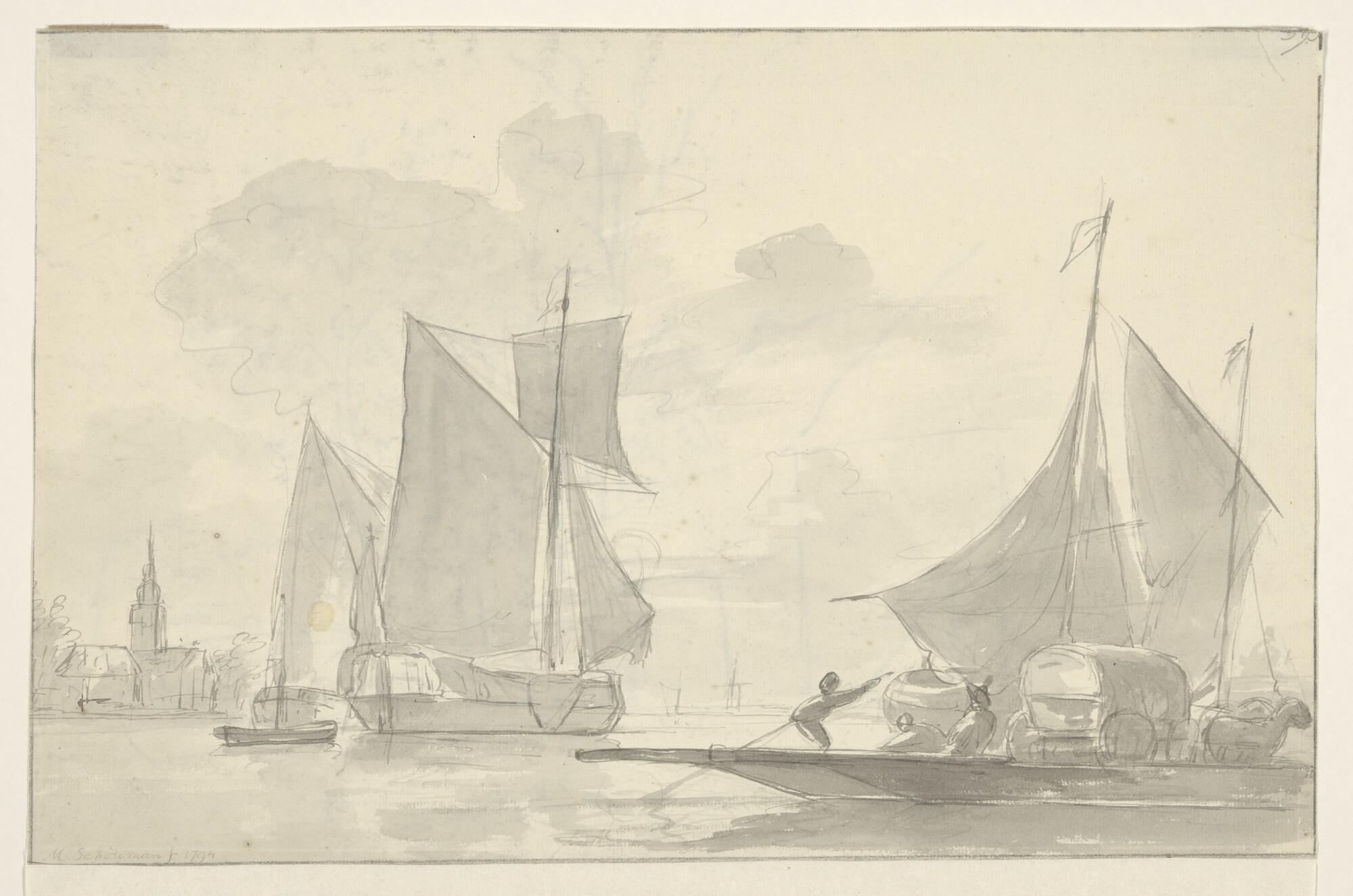 Een praam een haven uitvarend