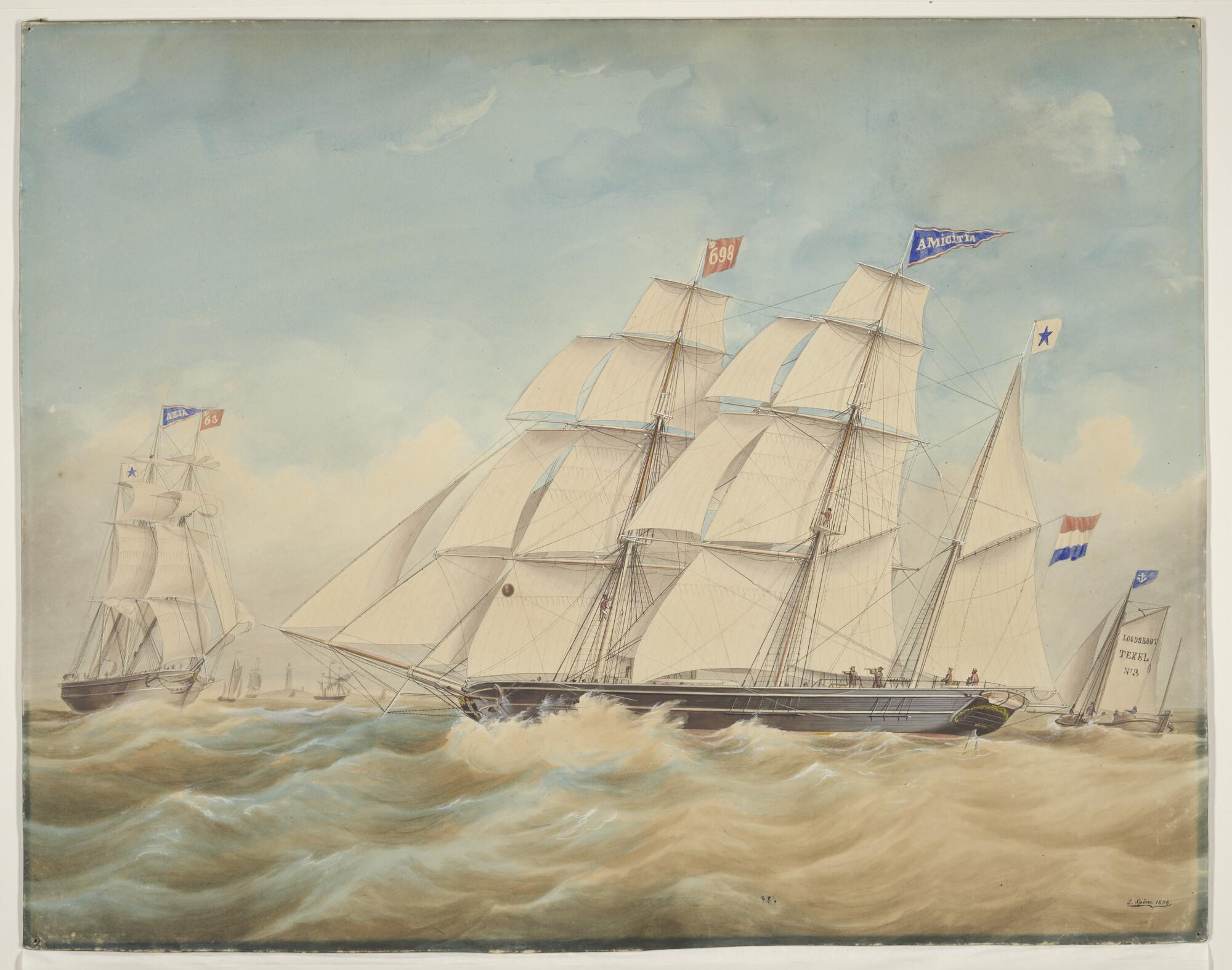 De barkschepen Amicitia en Azia in het zeegat van Texel