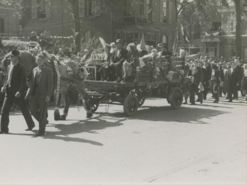 Bevrijdingsoptocht Nijmegen, 14 mei 1945; versierde ...