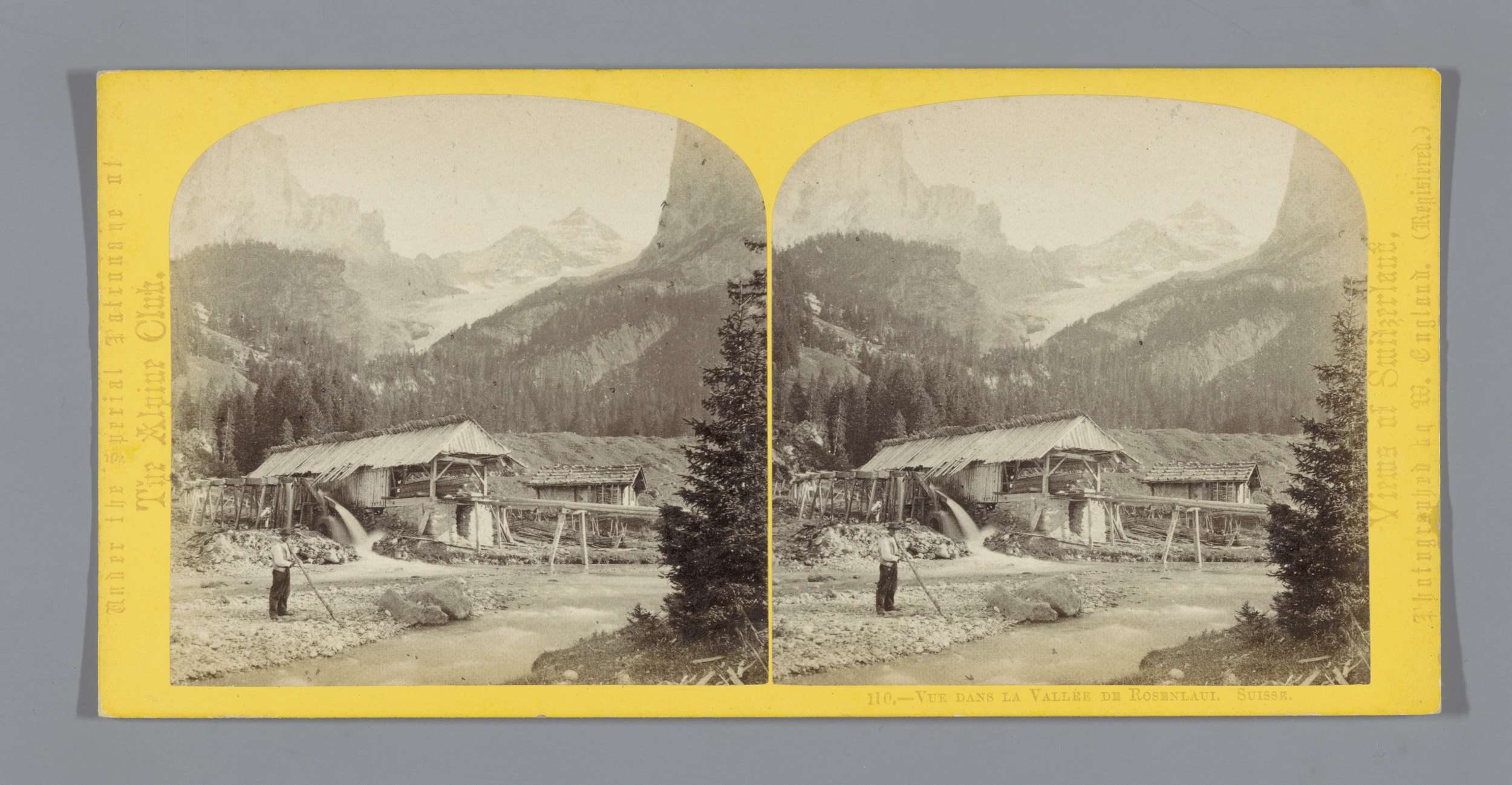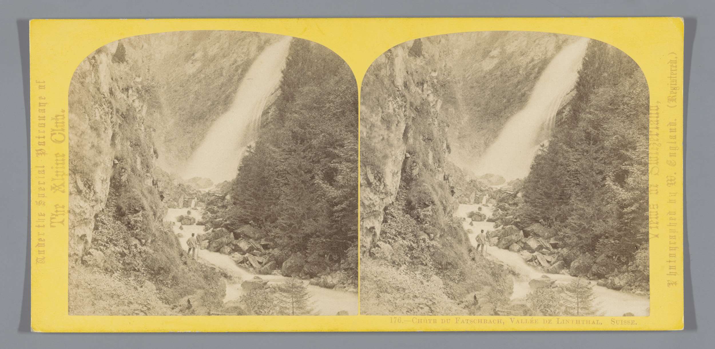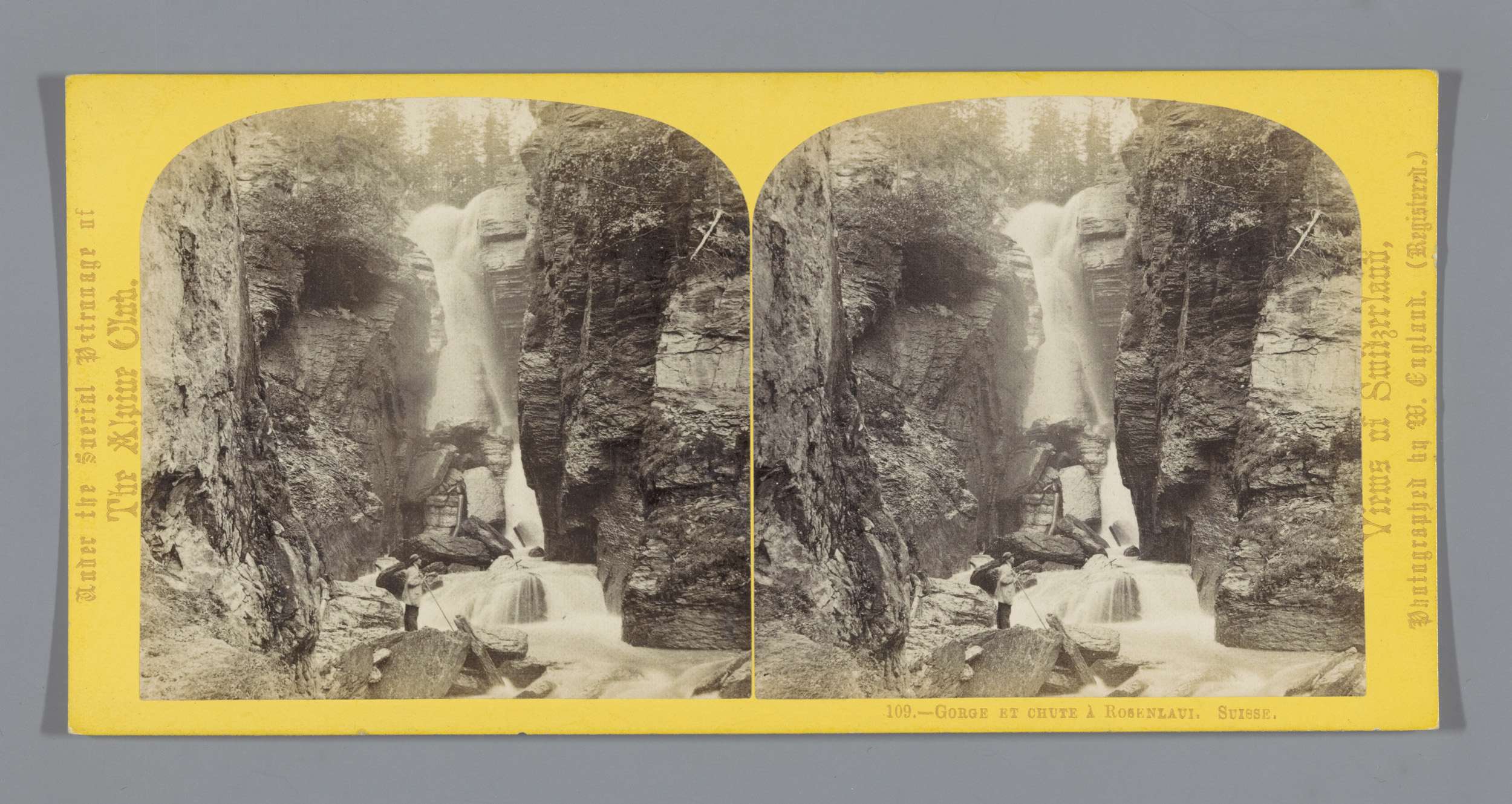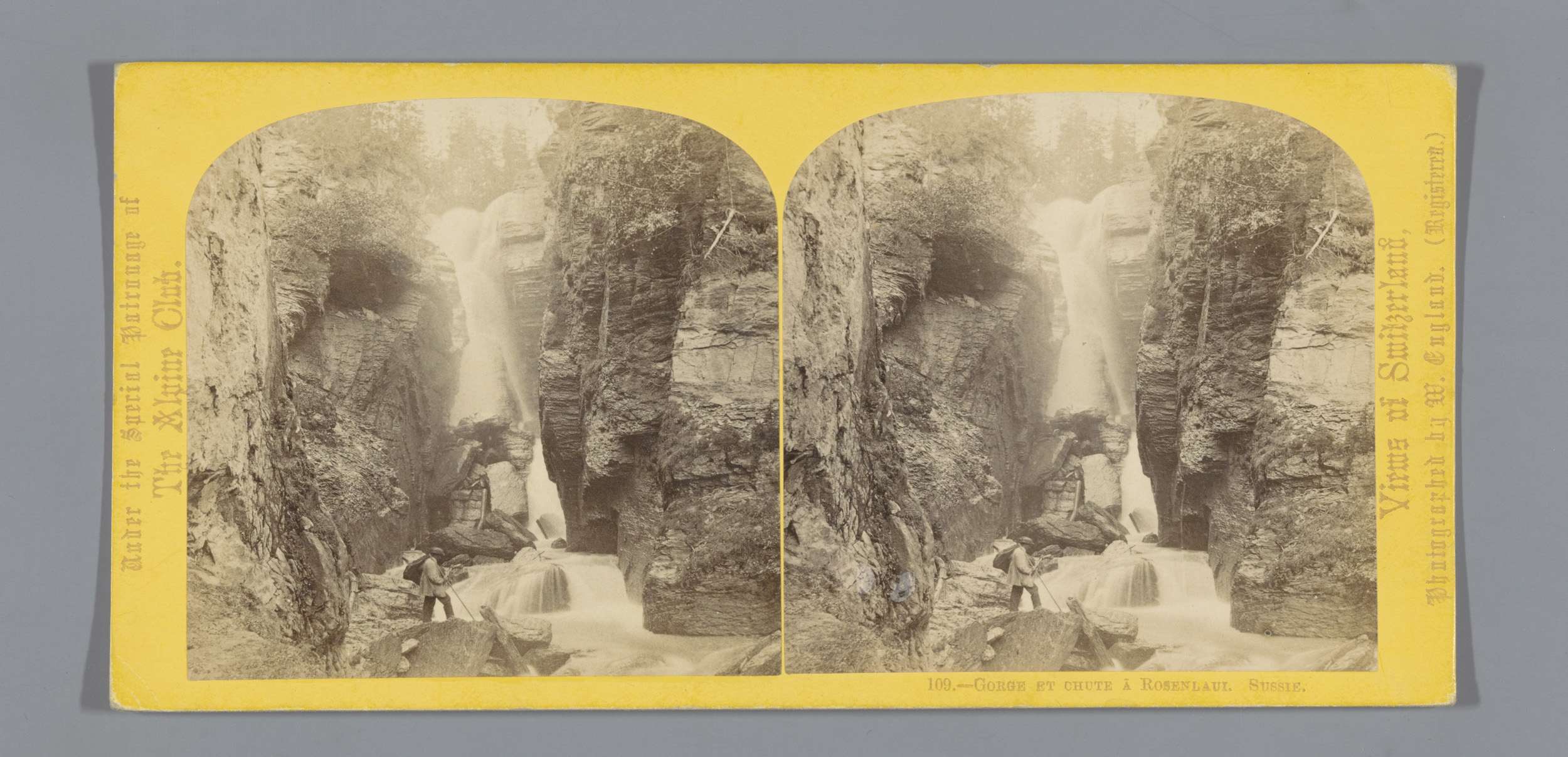 Gezicht op een waterval in een kloof nabij Rosenlaui