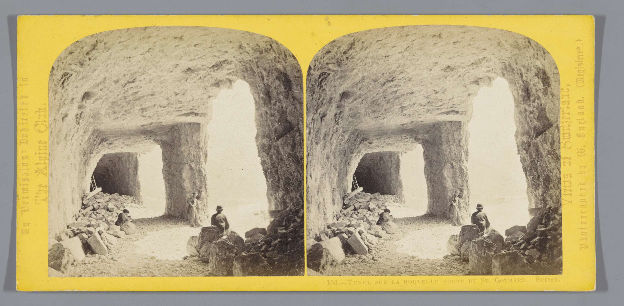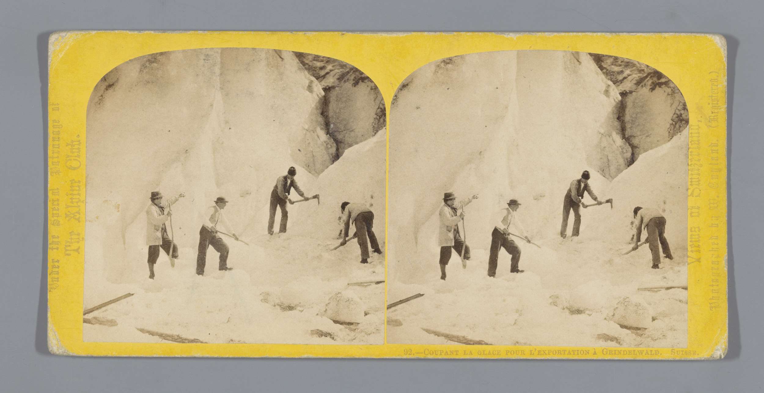 Vier mannen met pikhouwelen op een gletsjer nabij Gr...