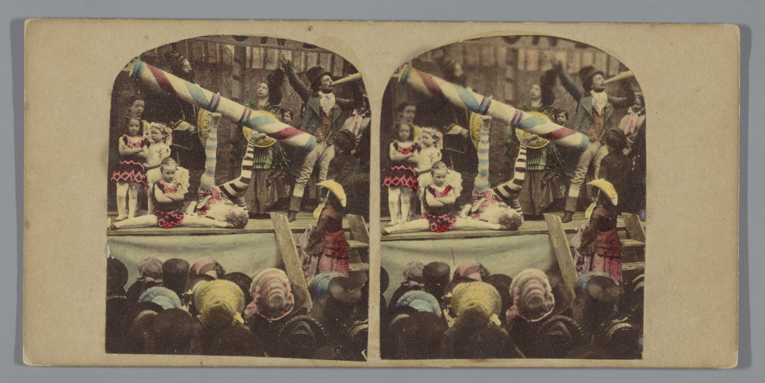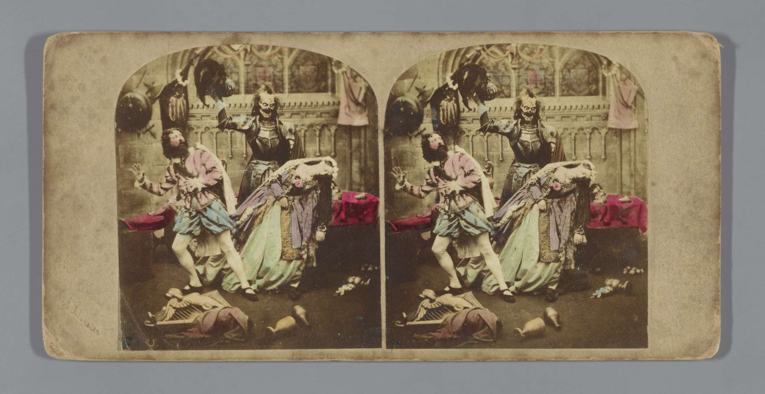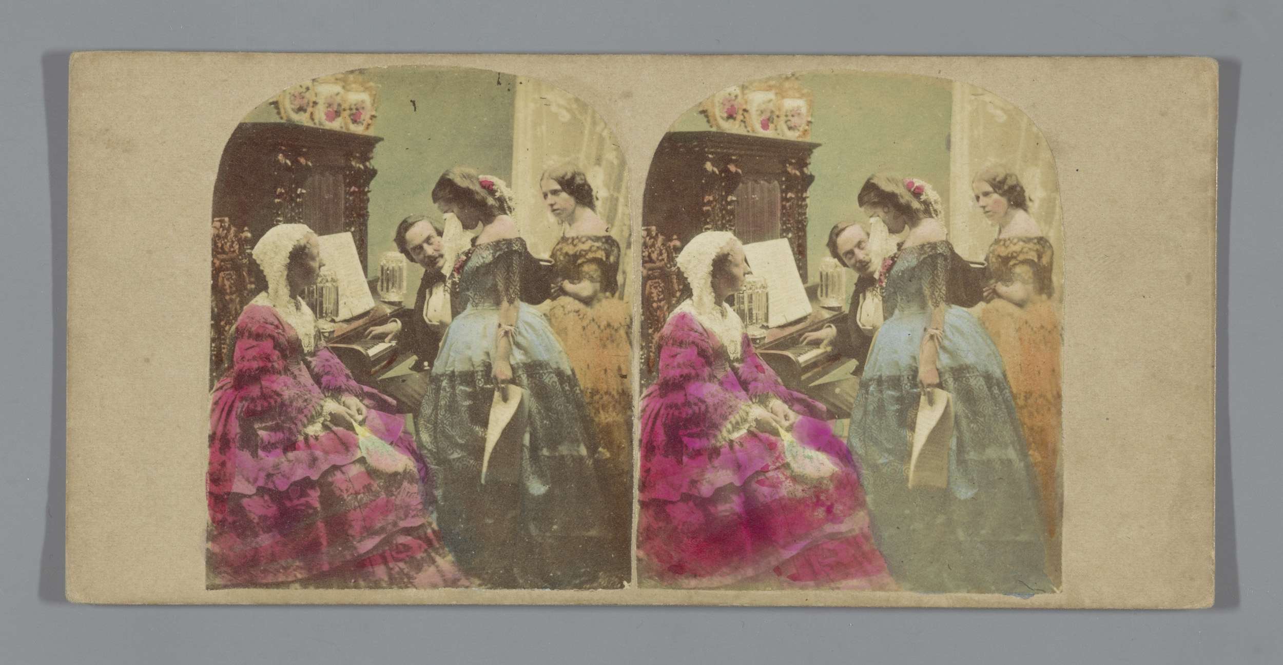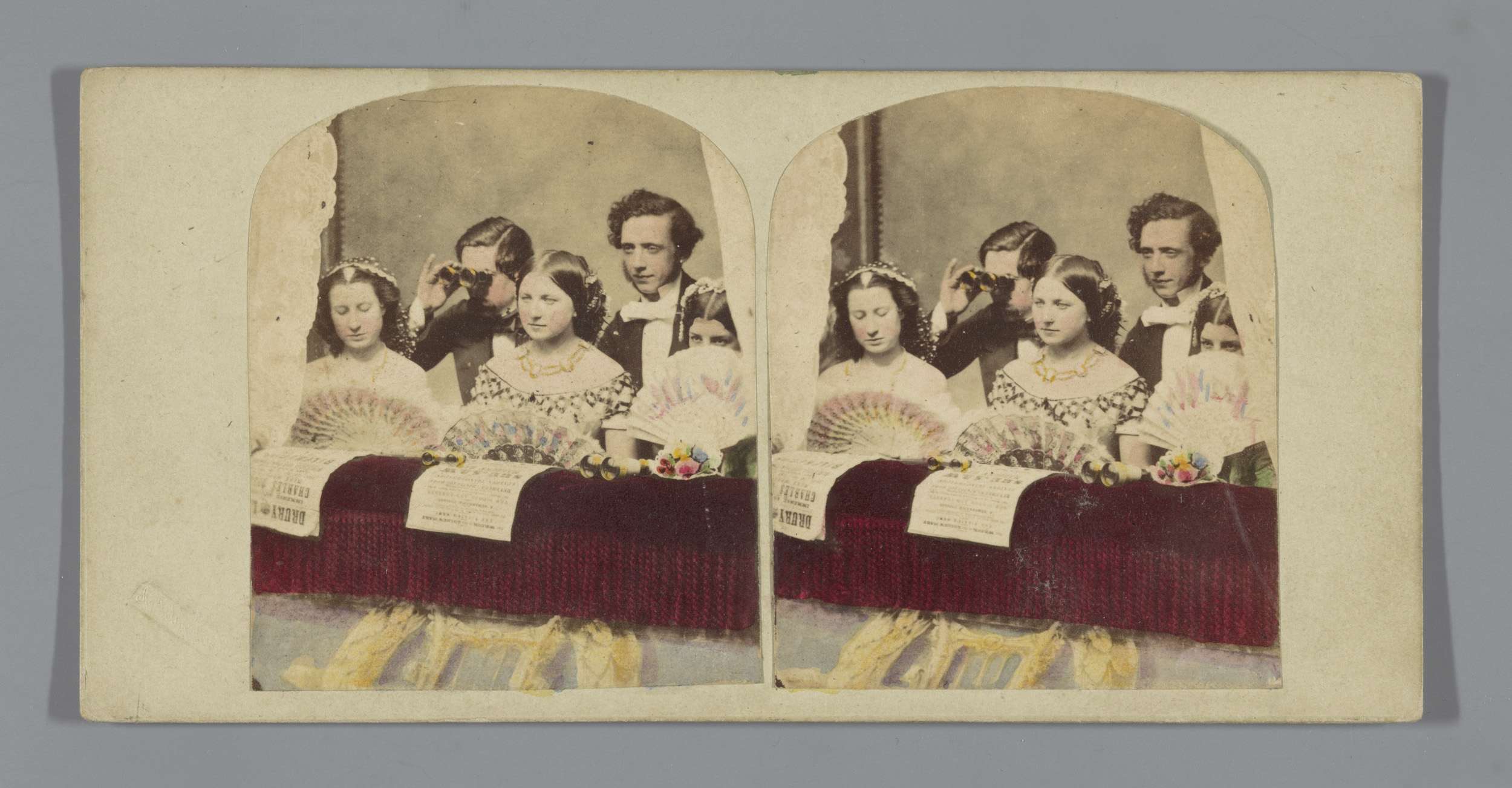 Tafereel in een theater: drie vrouwen en twee mannen...