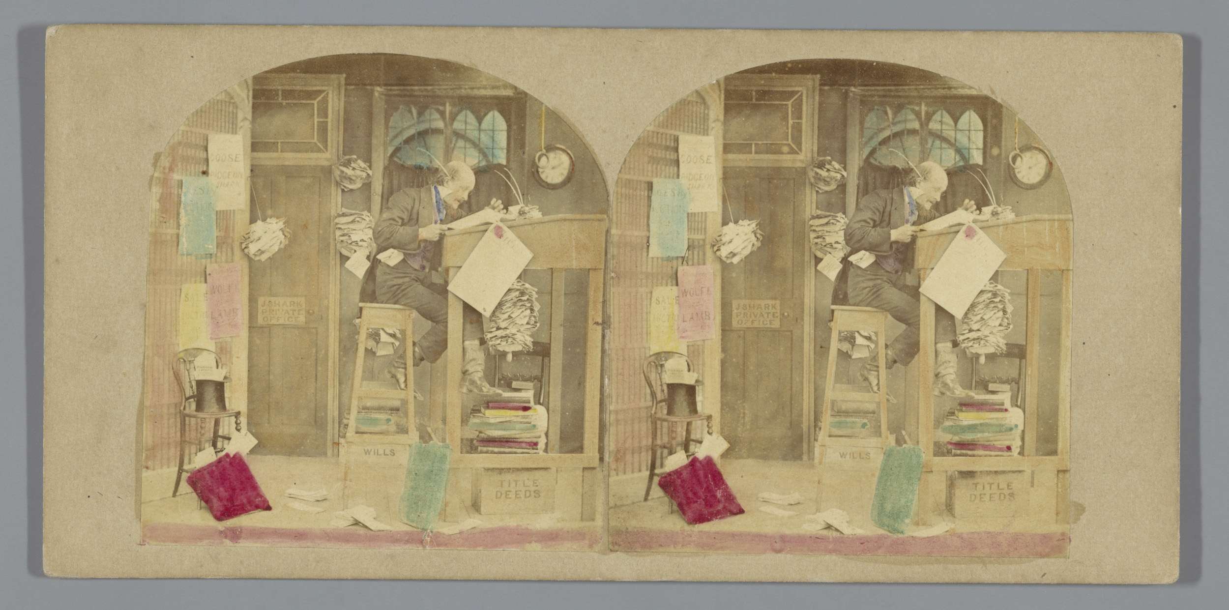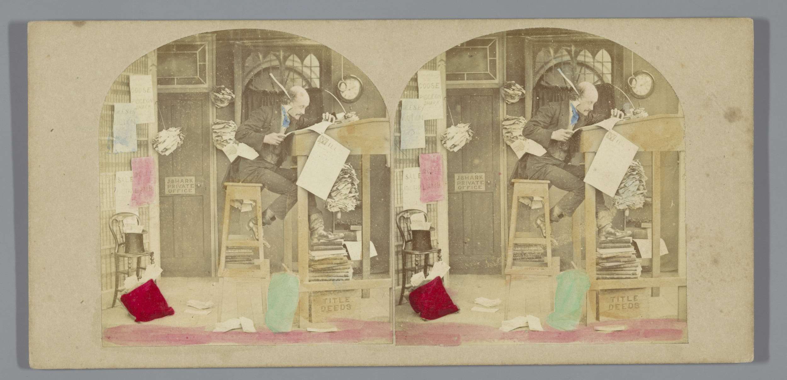 John Quill, klerk van Robert Shark, zittend op een h...