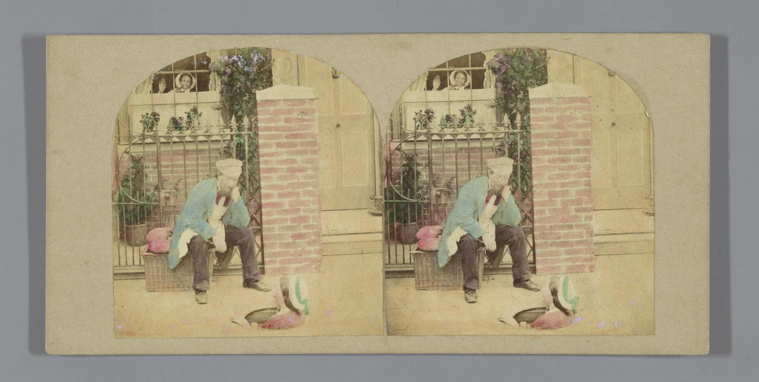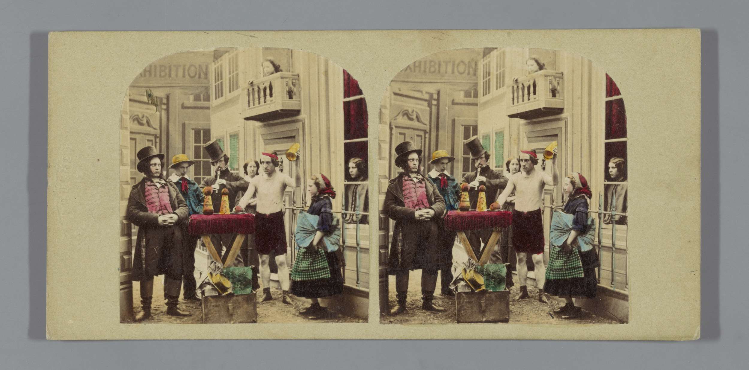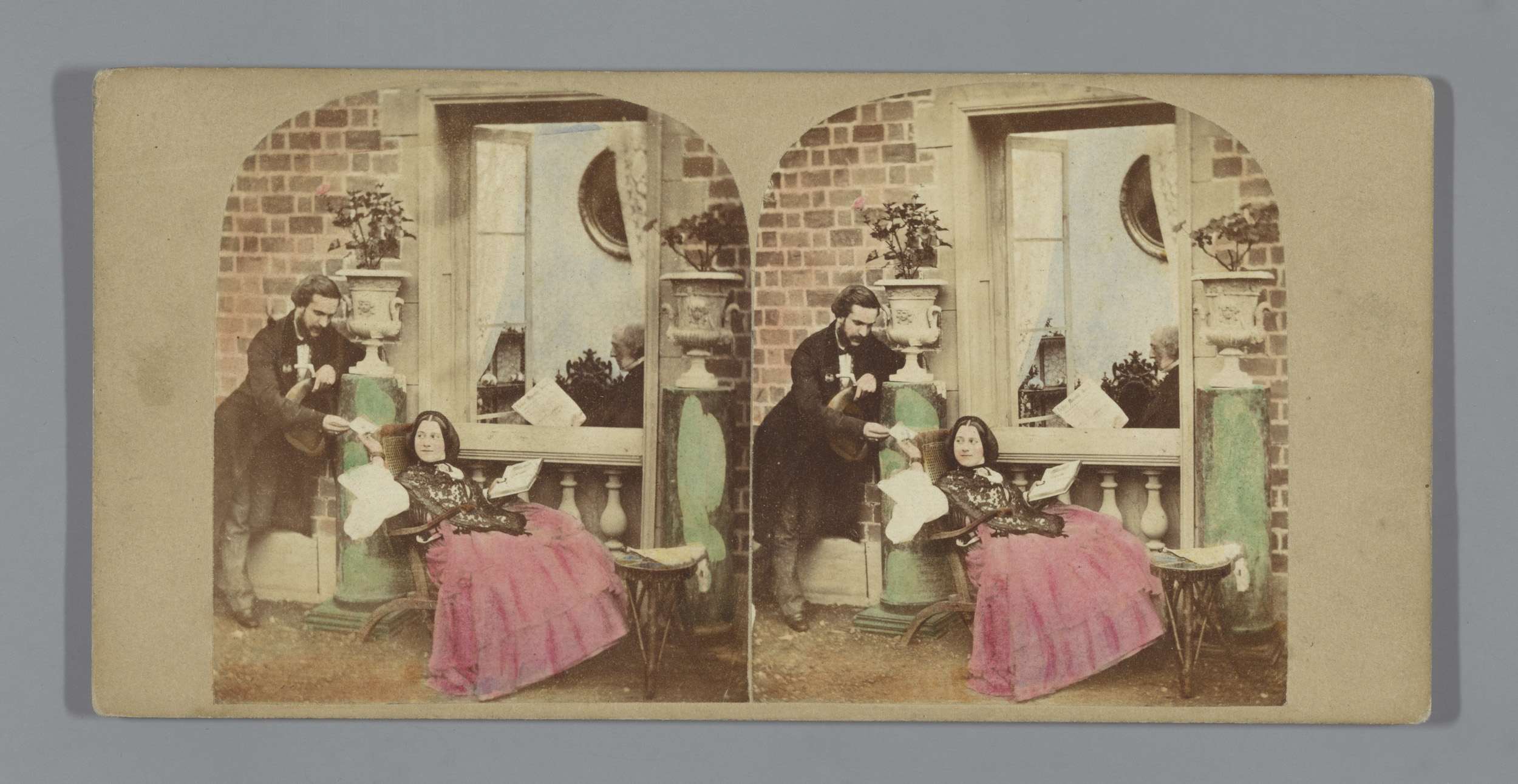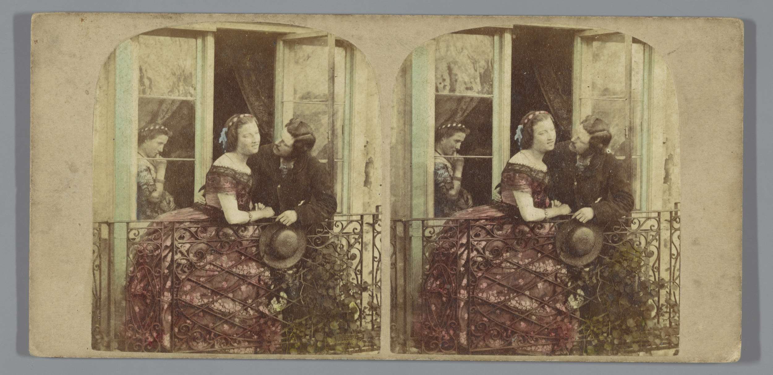 Man en vrouw op een balkon en een tweede vrouw achte...