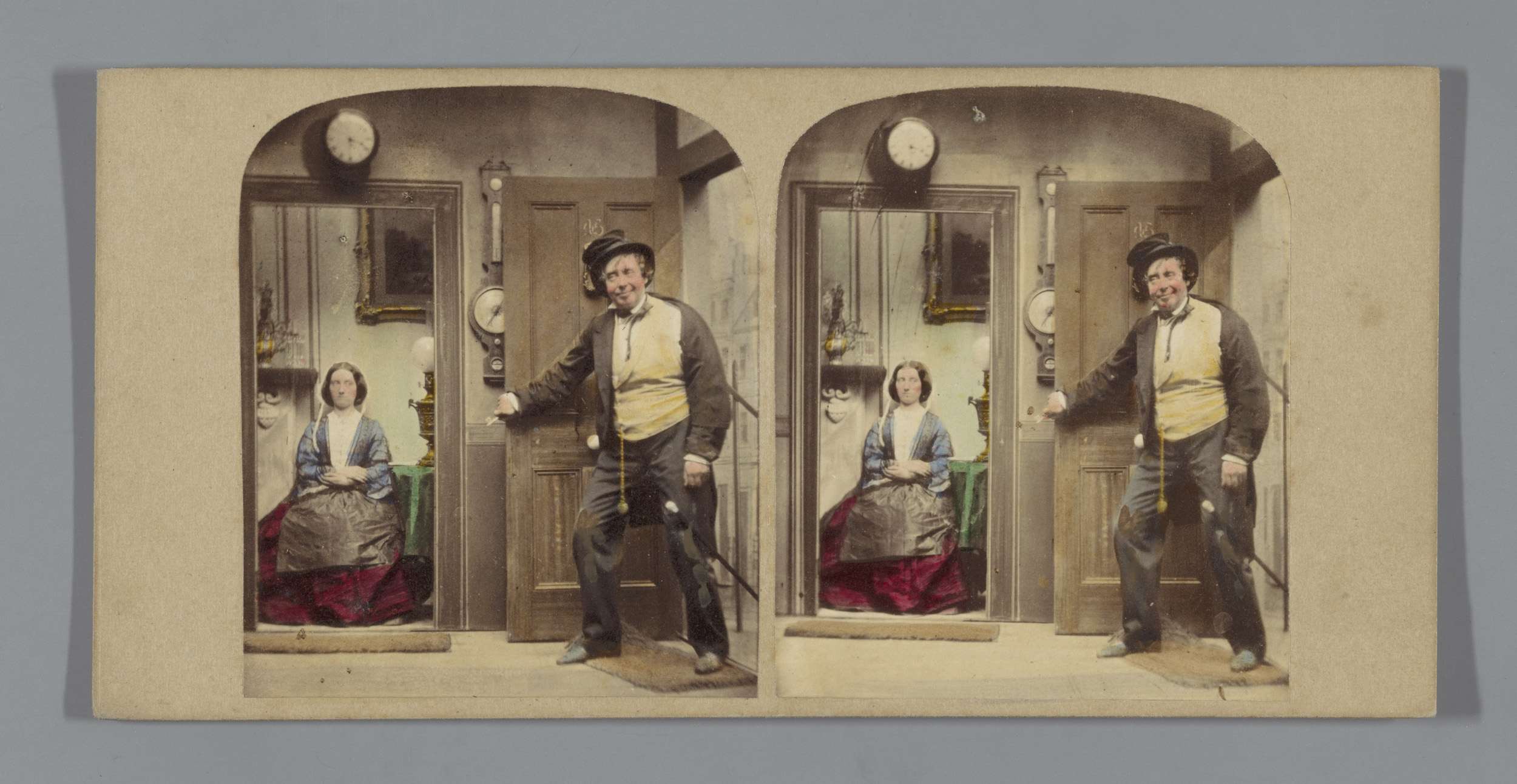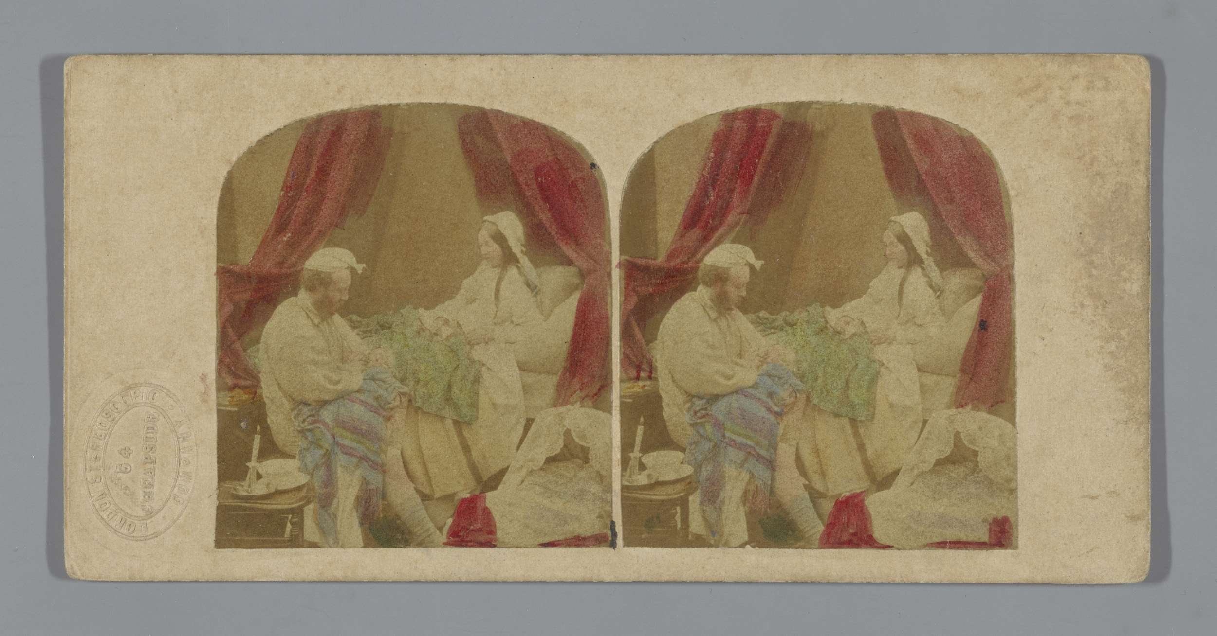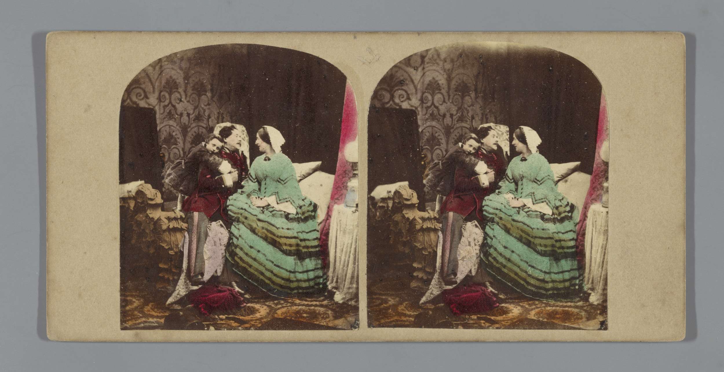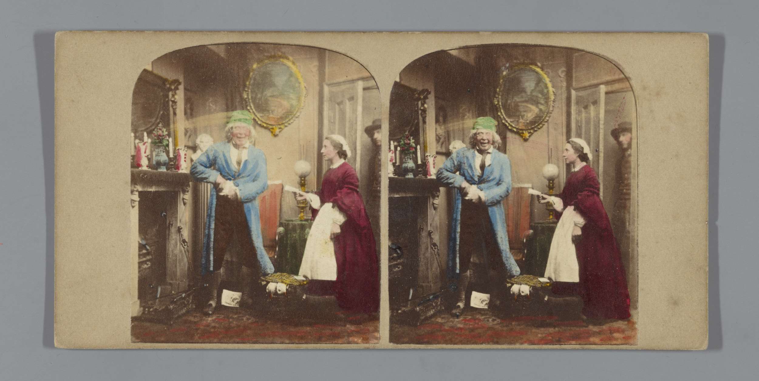 Ochtendtafereel met een vrouw in bed, een man geeft ...