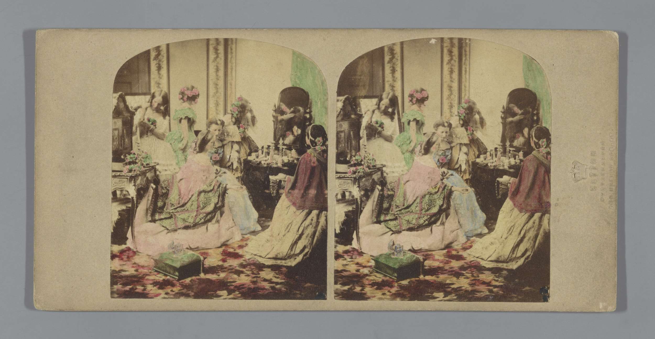 Zes vrouwen rond een kaptafel