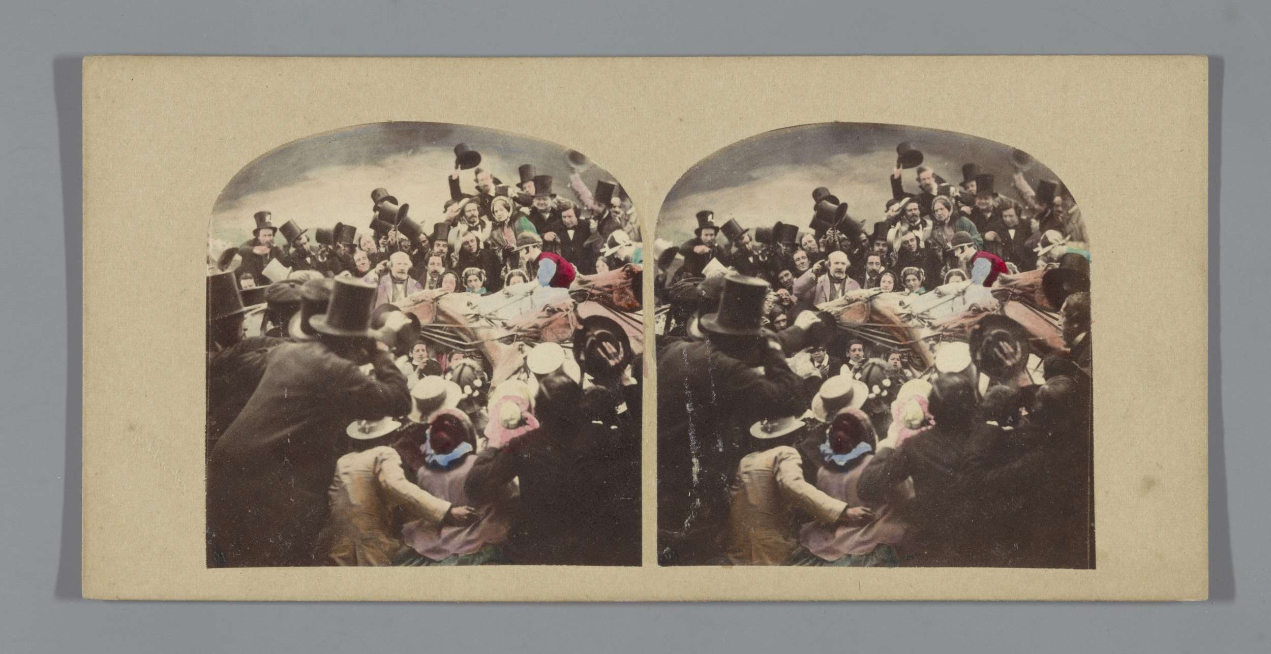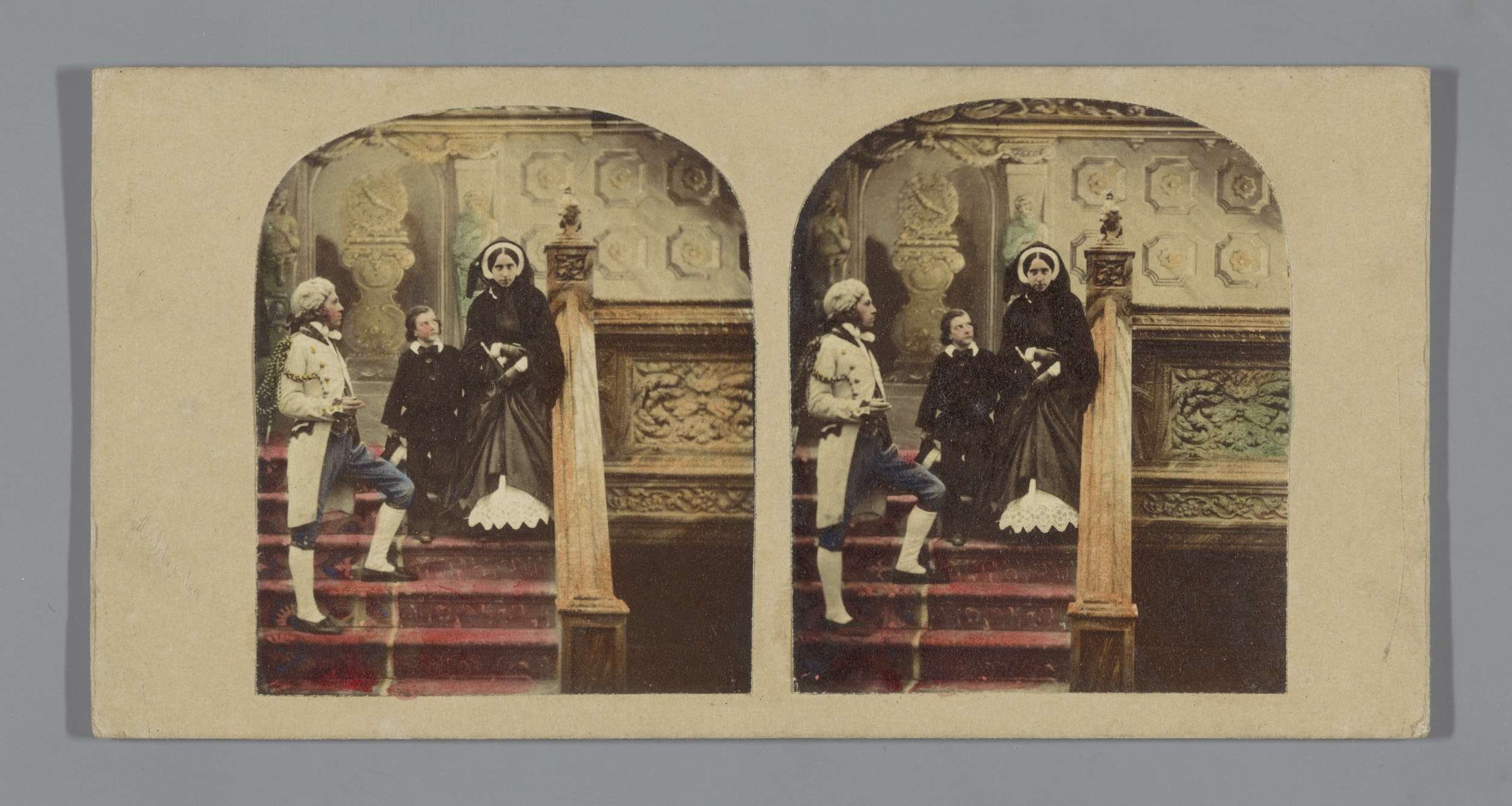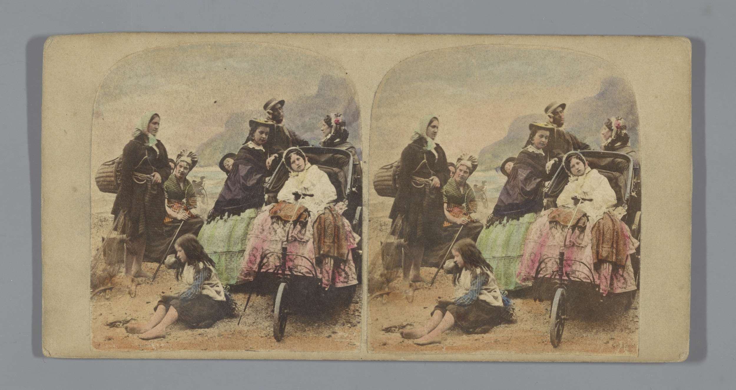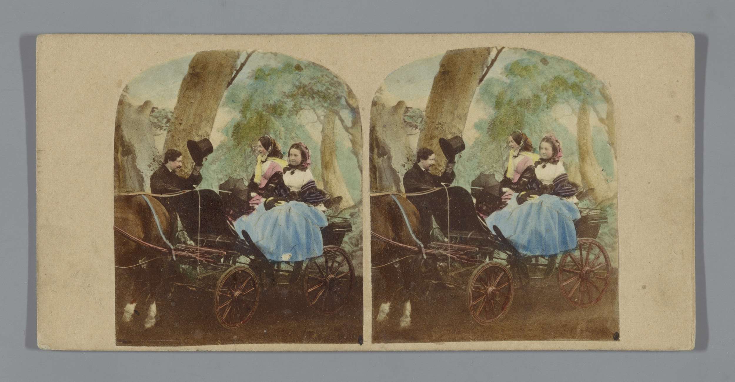 Een man en twee vrouwen in een open koets