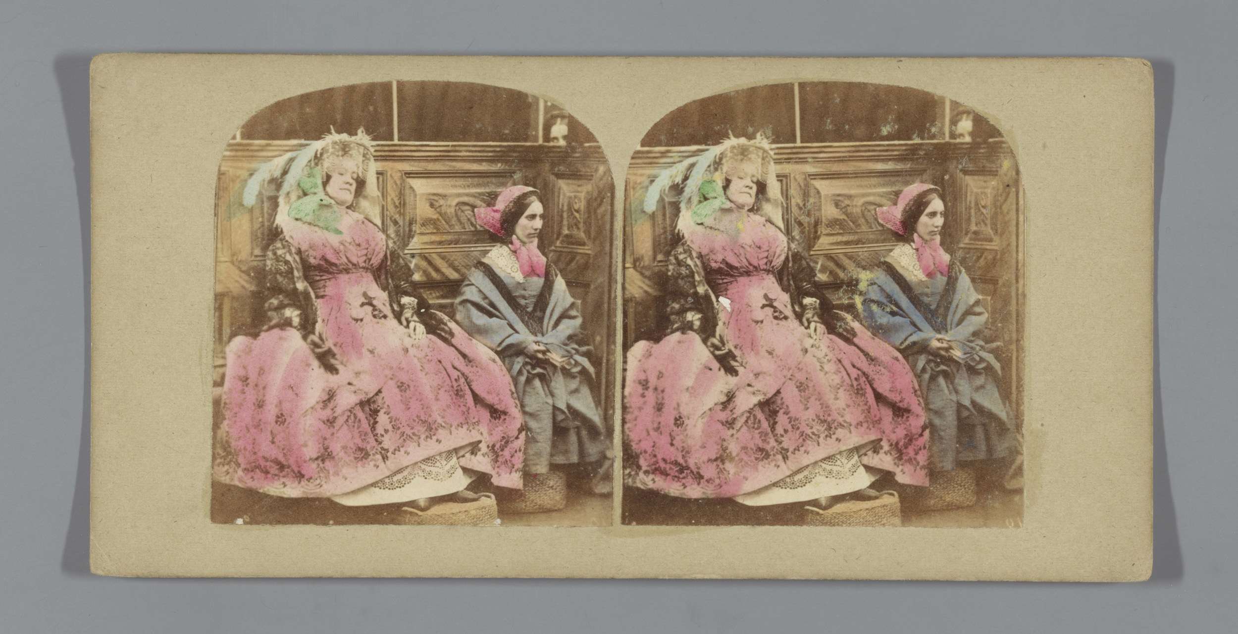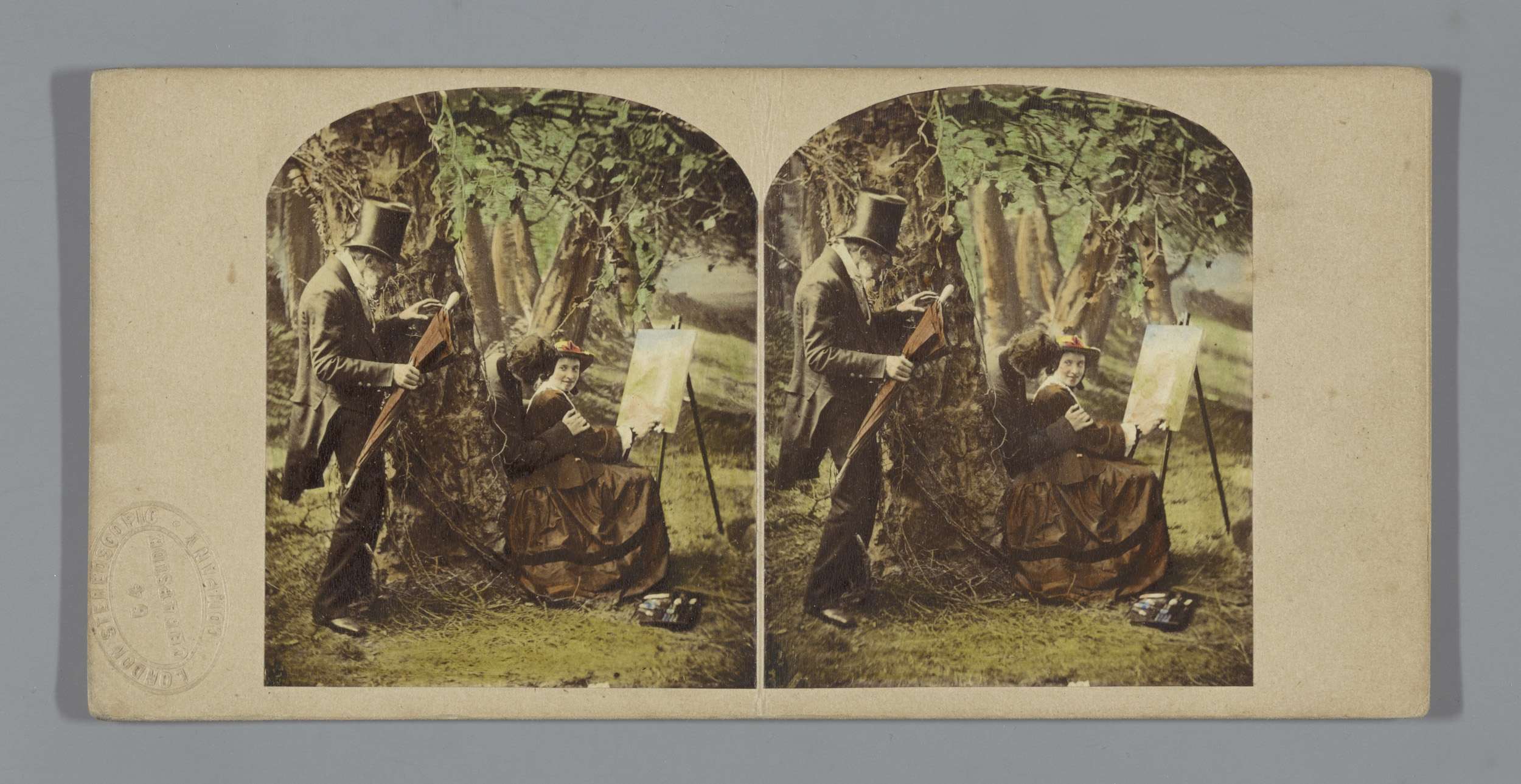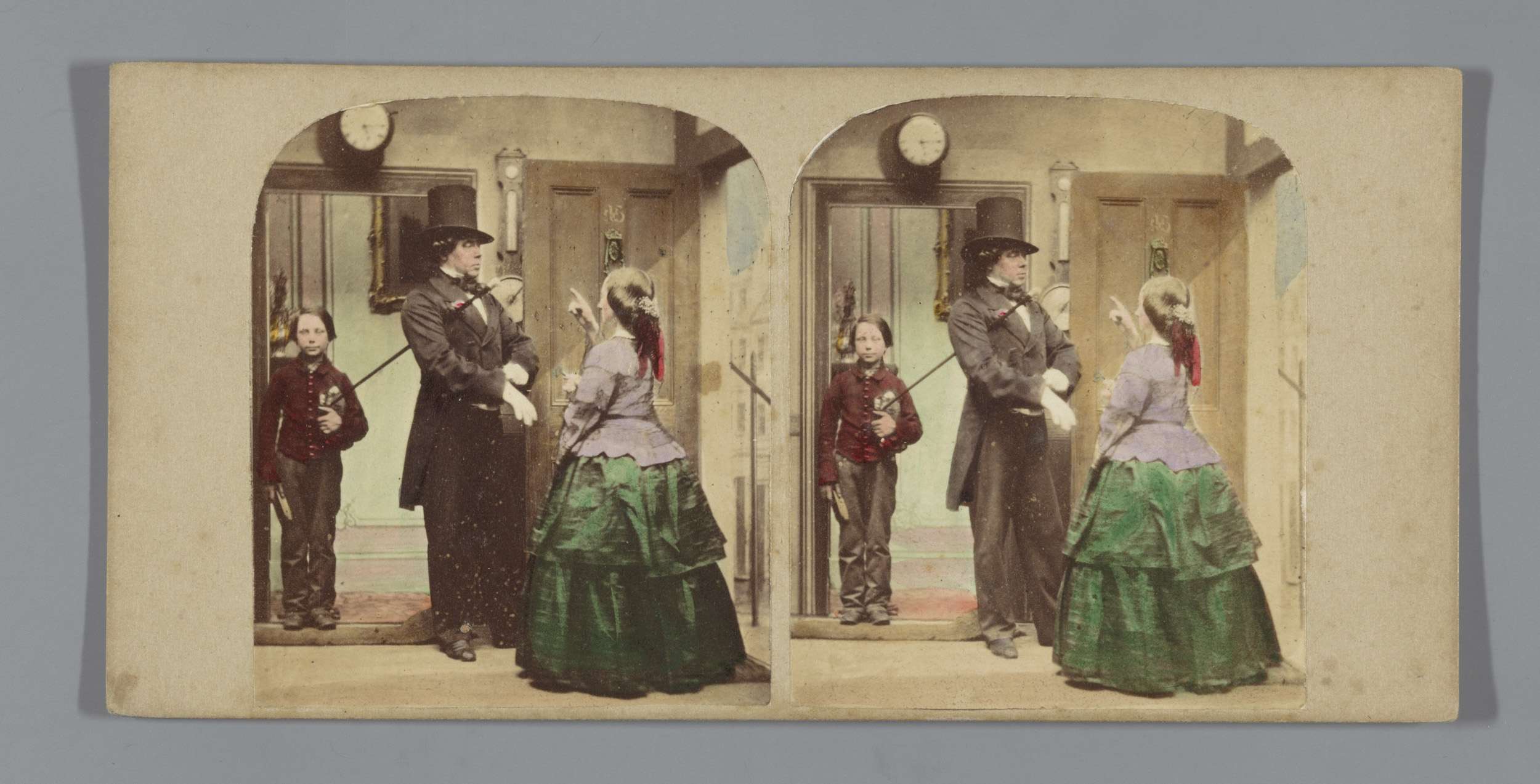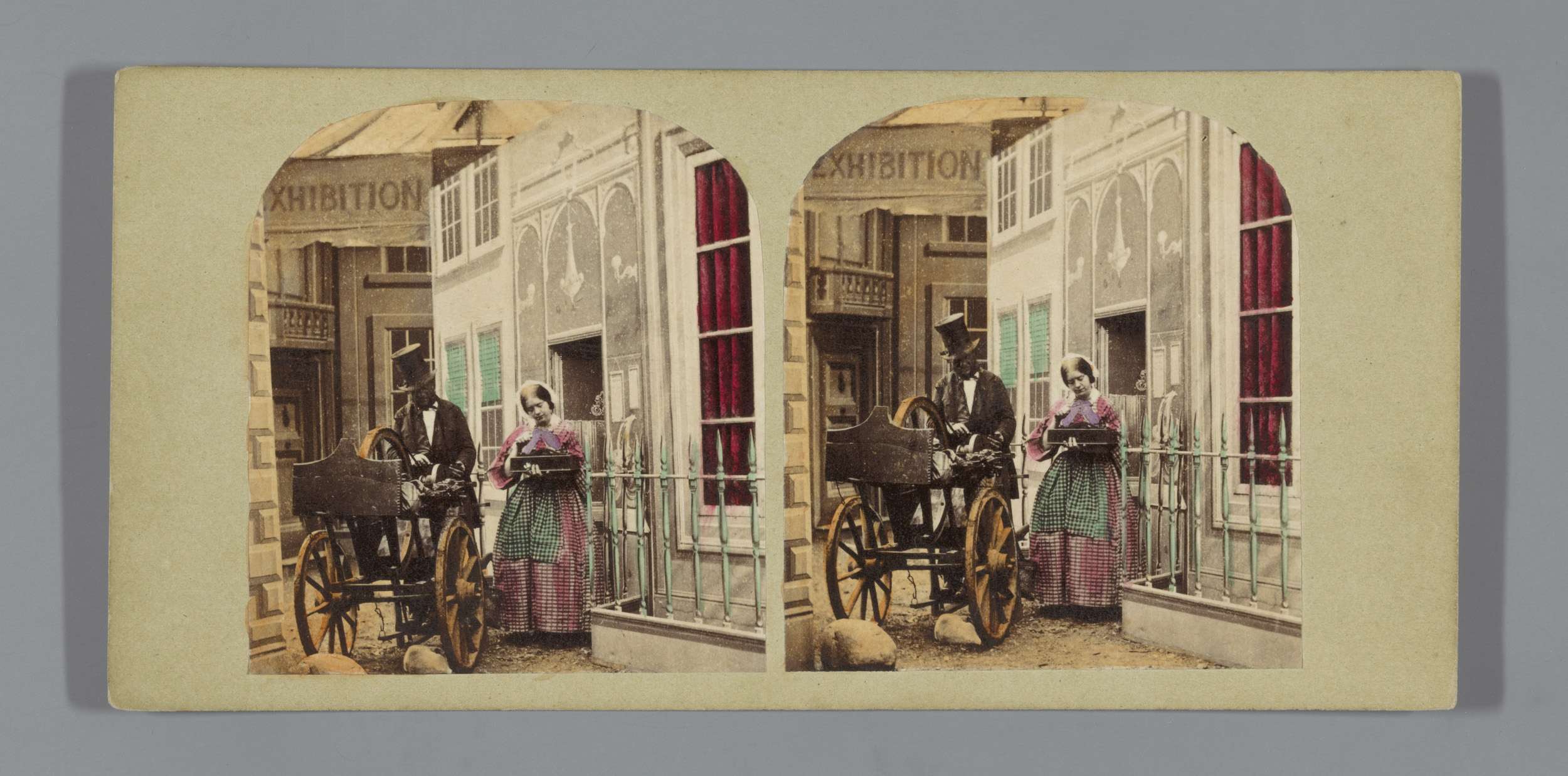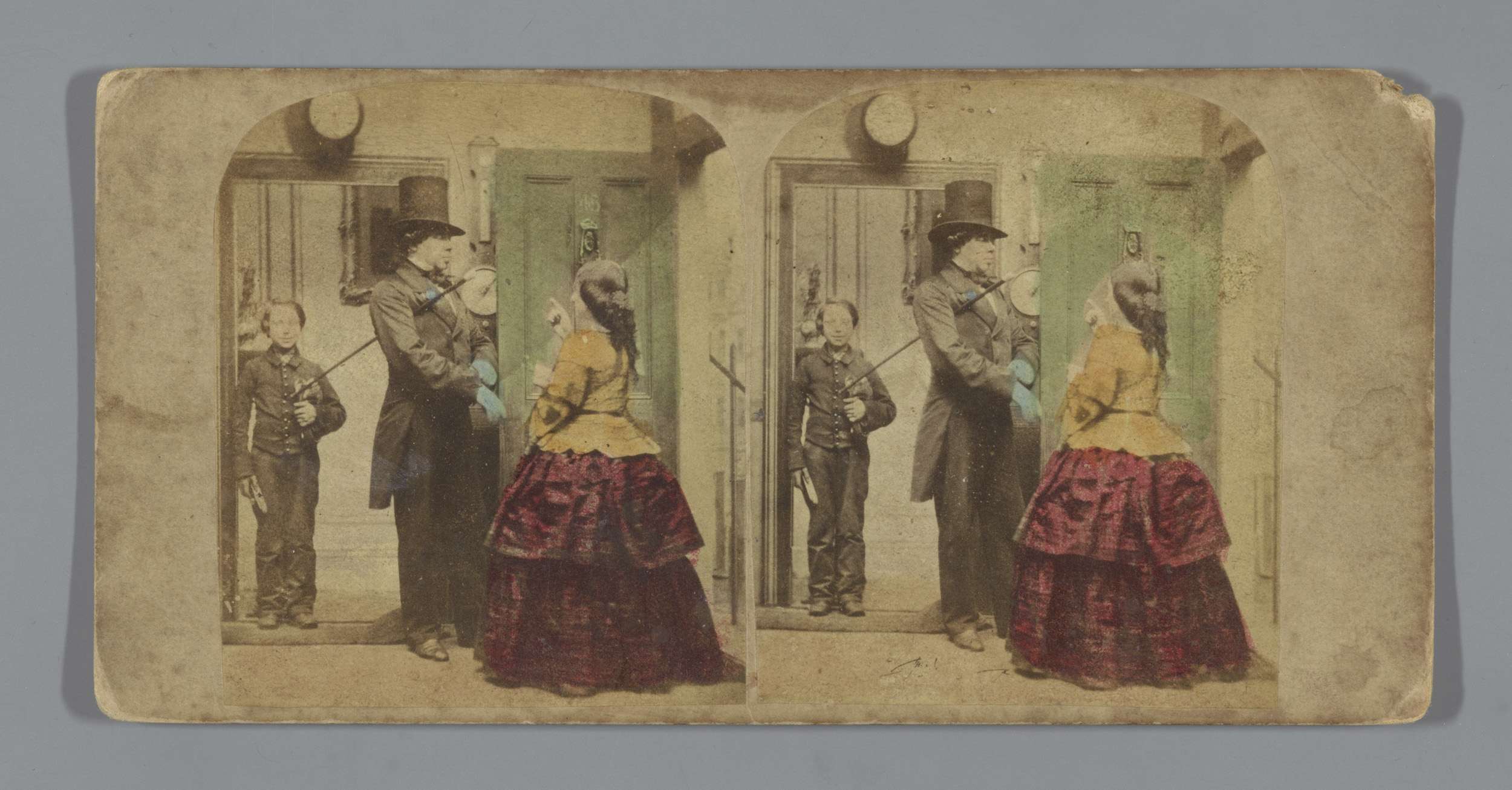 Een man en twee vrouwen in een open koets