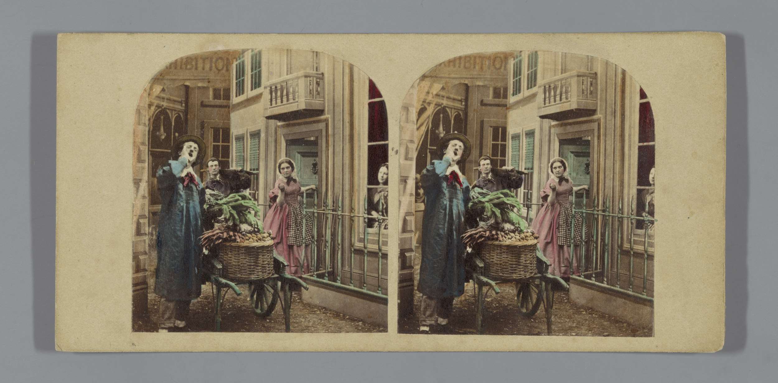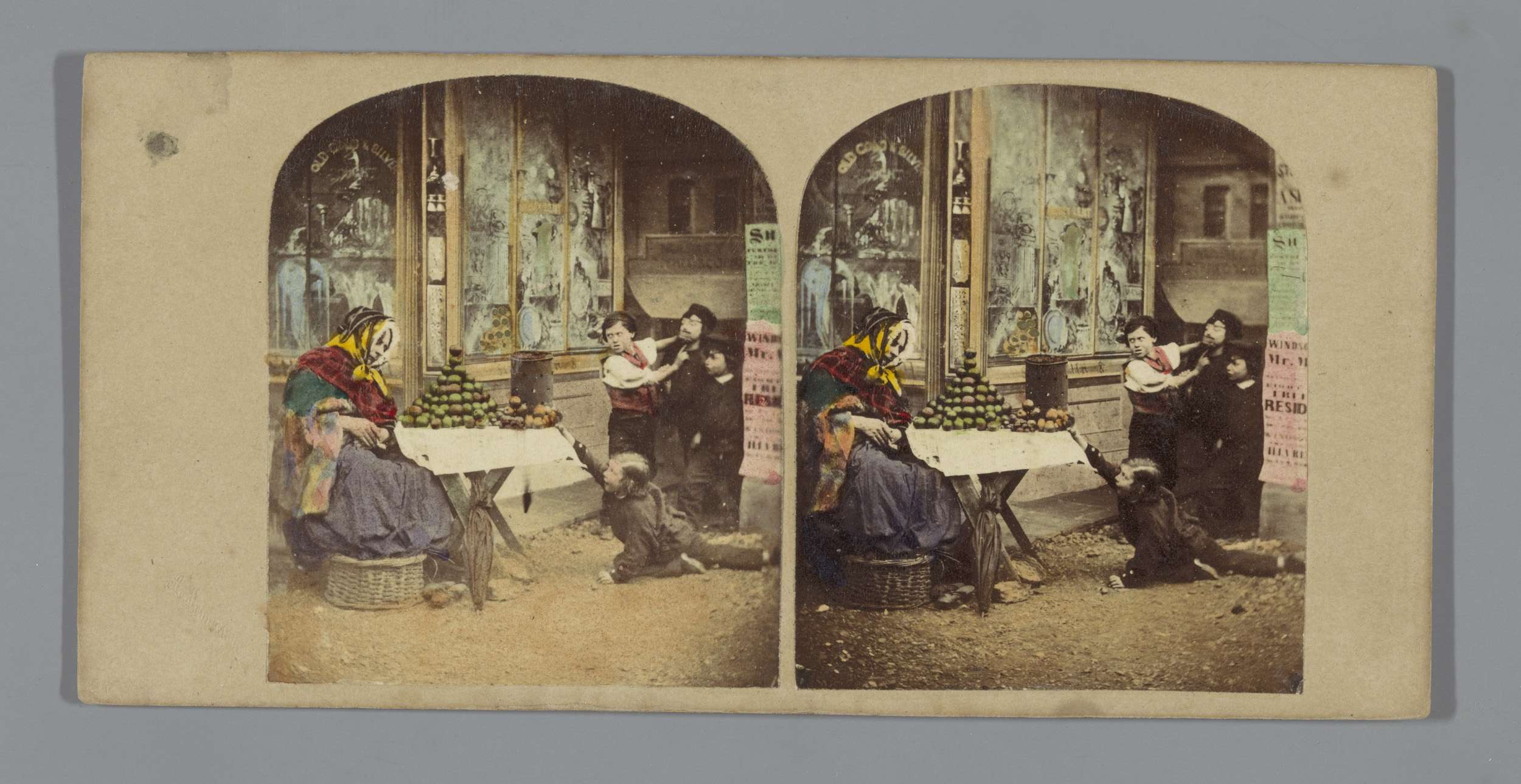 Tafereel op straat: jongens stelen fruit bij een koo...