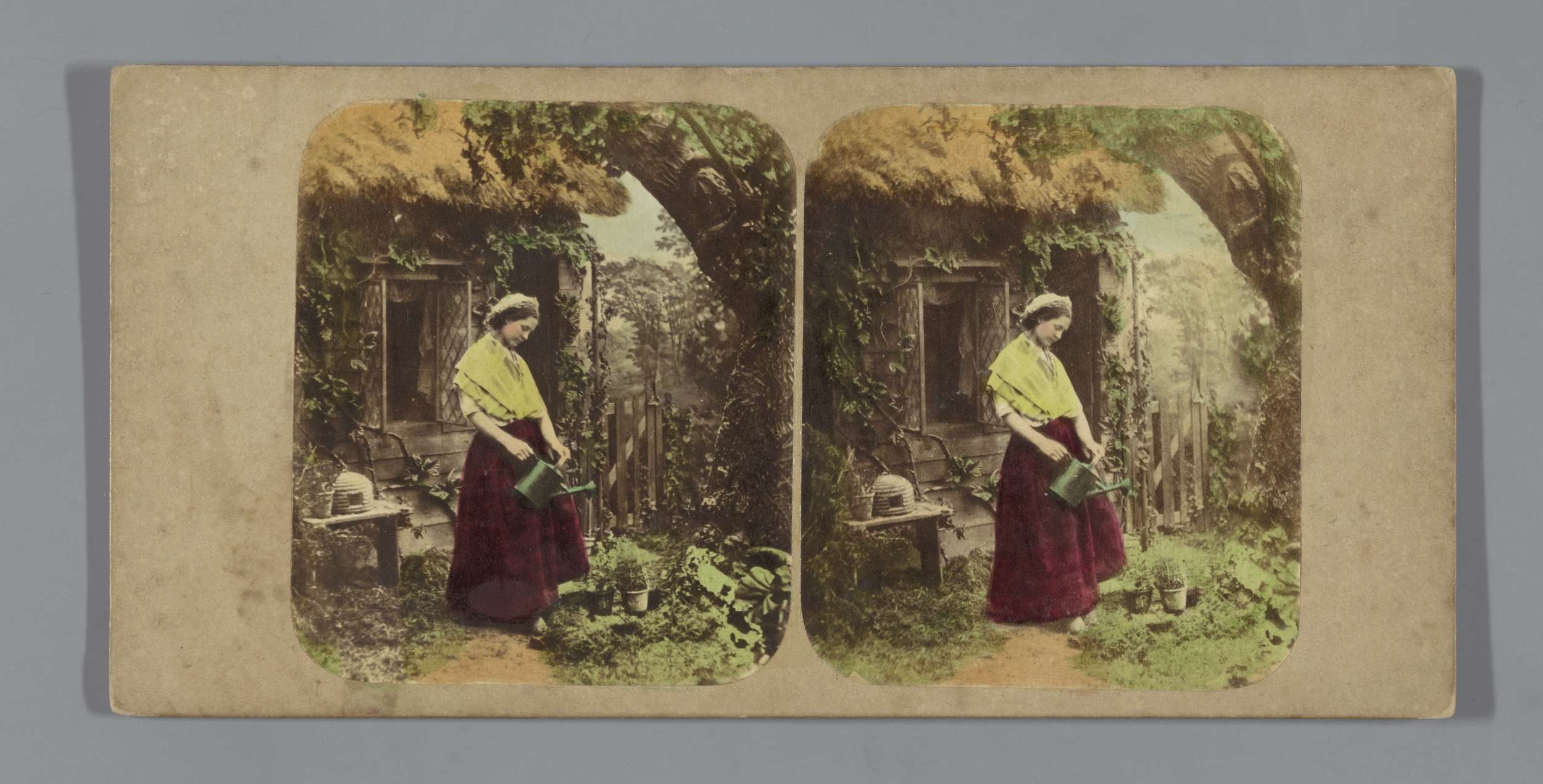Vrouw begiet planten voor een cottage