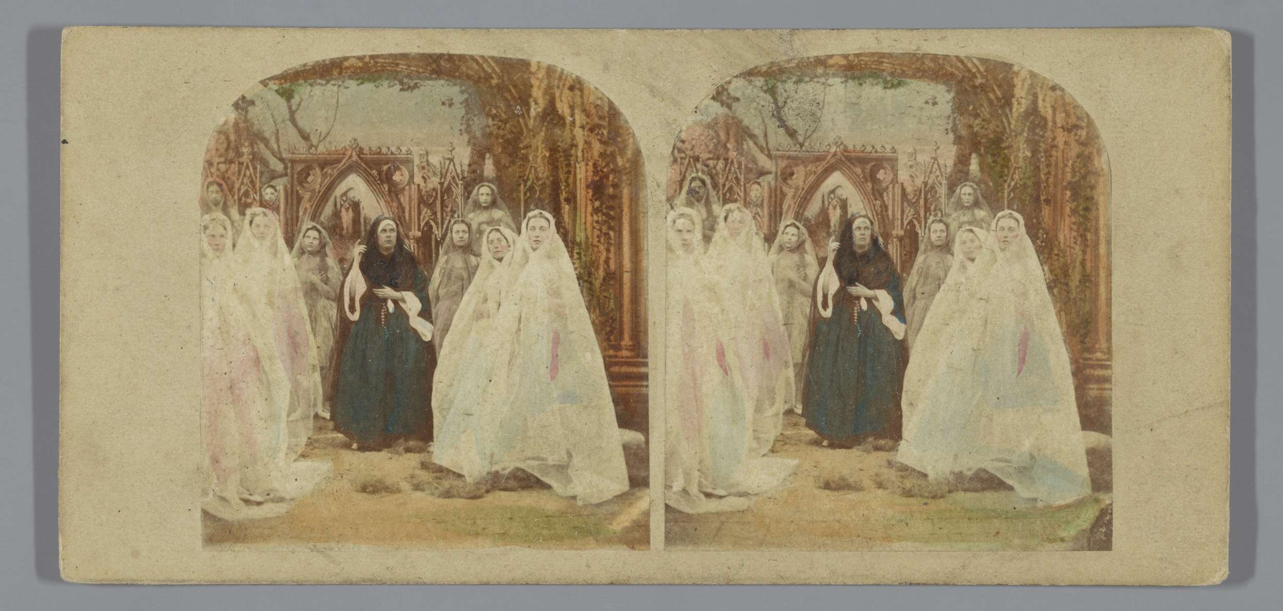 Biddende nonnen in een kerkruïne
