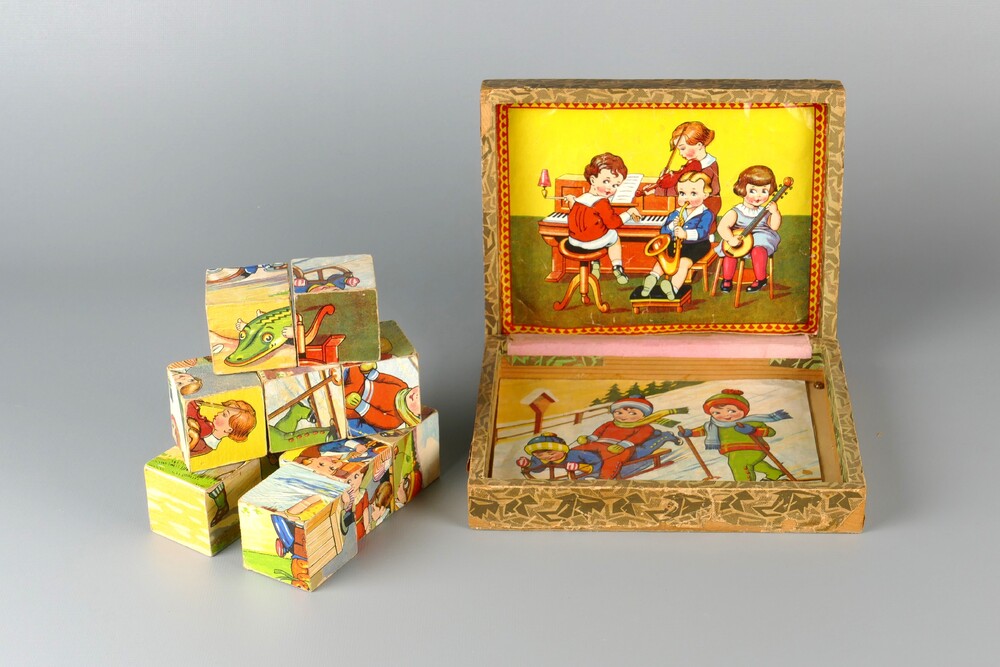 blokkendoos, hout met afbeelding van 2 kinderen op m...