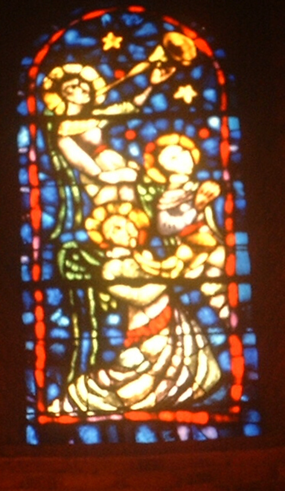 Engelen verwelkomen Maria ,glasraam van de Stadskerk...