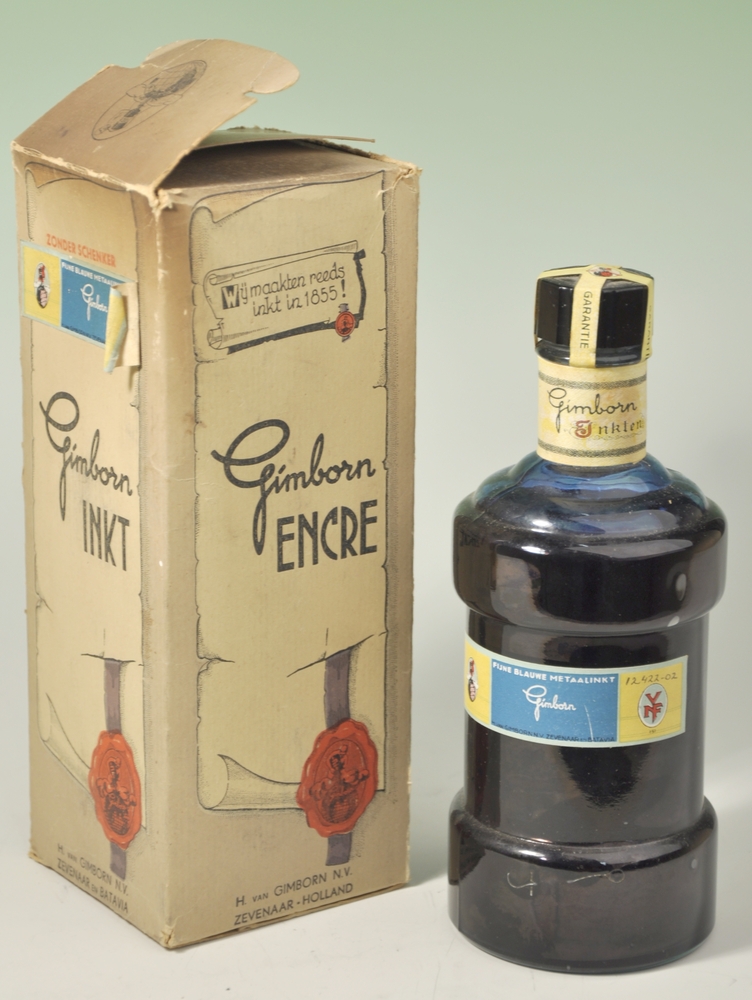 Doos van karton waarin een glazen fles met fijne bla...