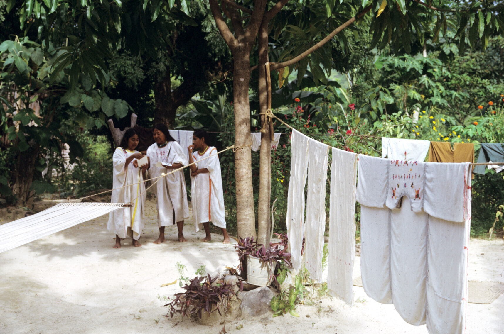 vrouwen in lokale dracht bij waslijn met kleding