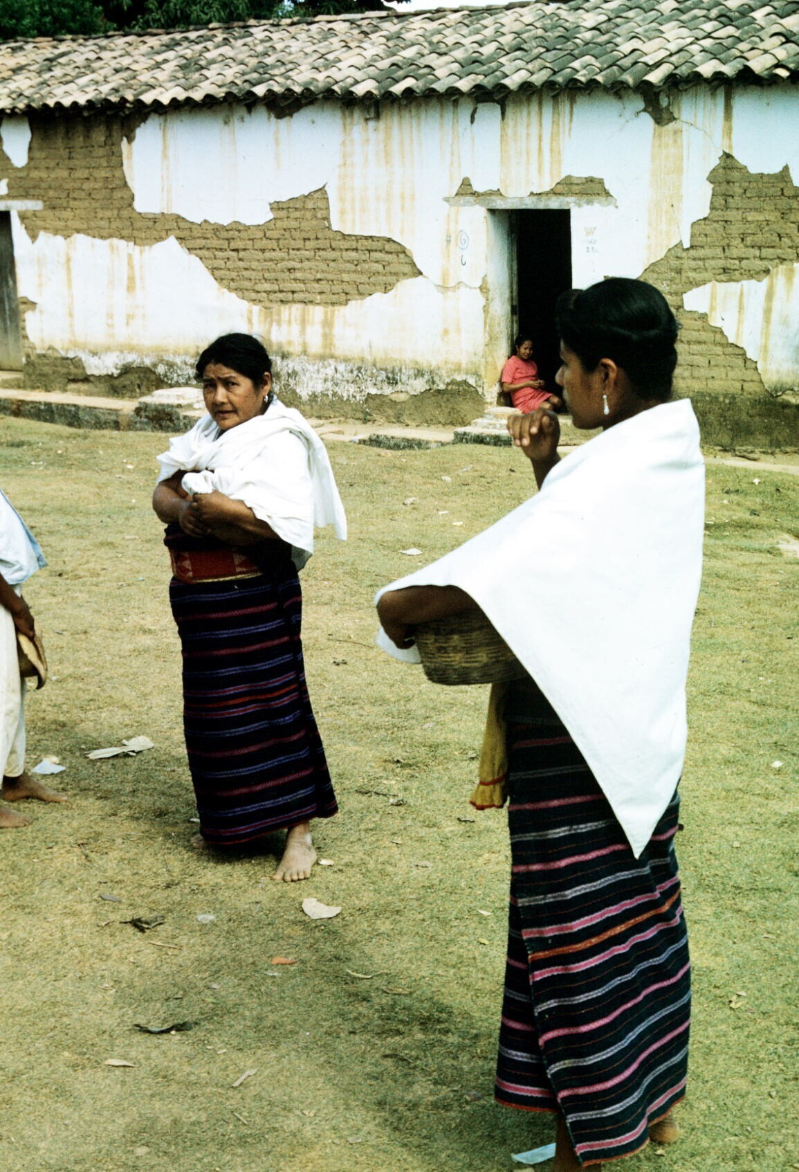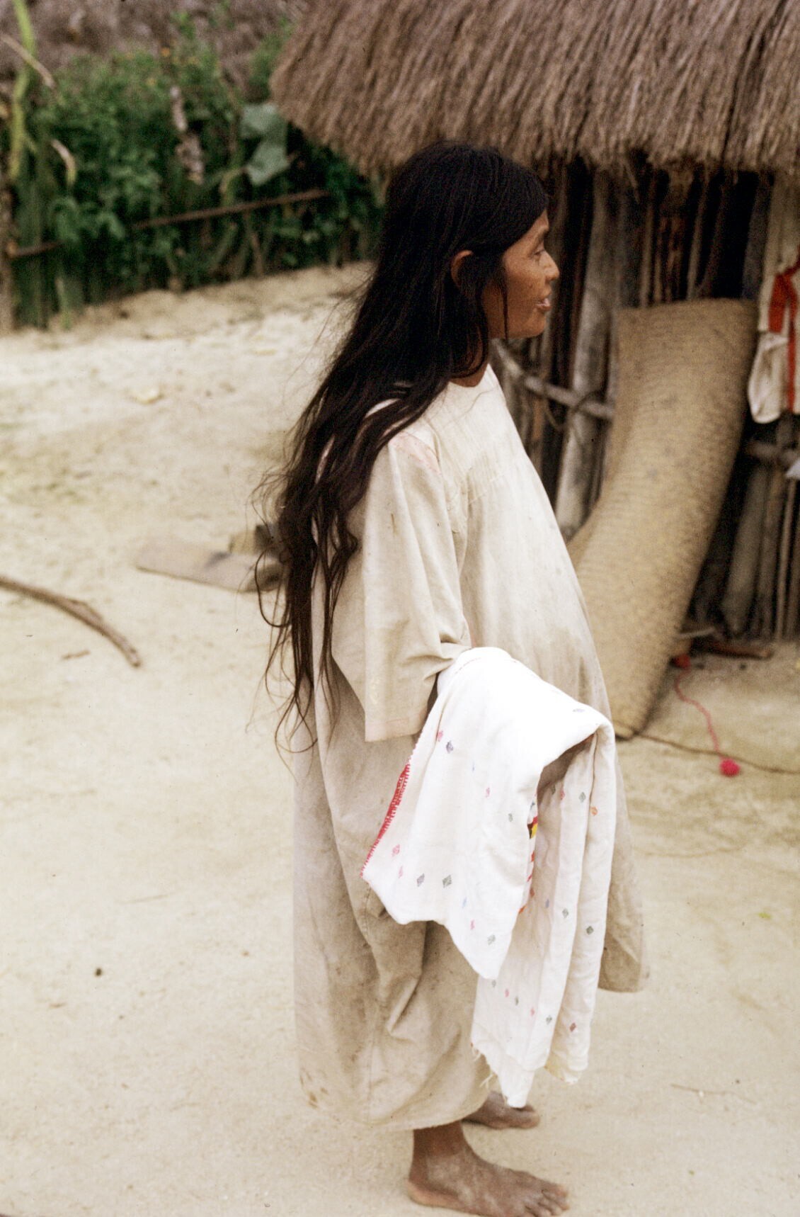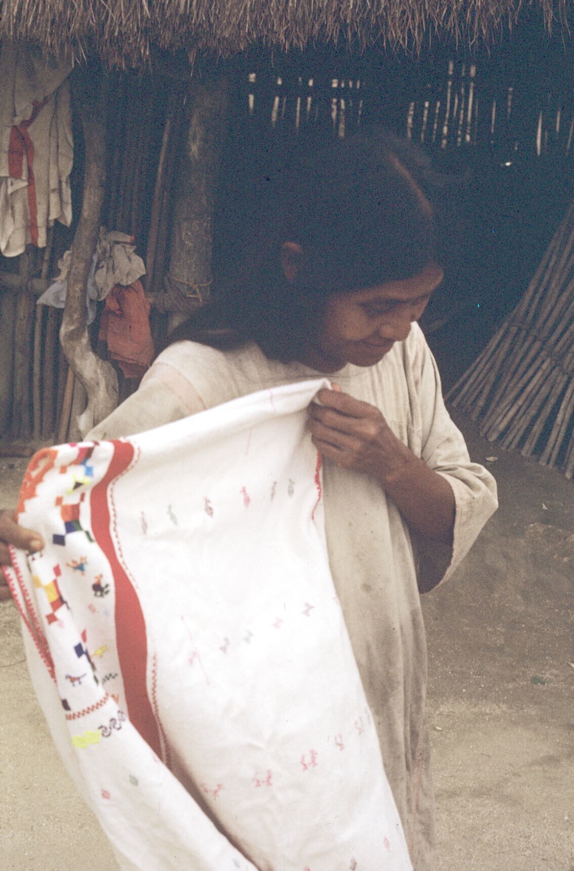 vrouw met opgevouwen huipil over arm