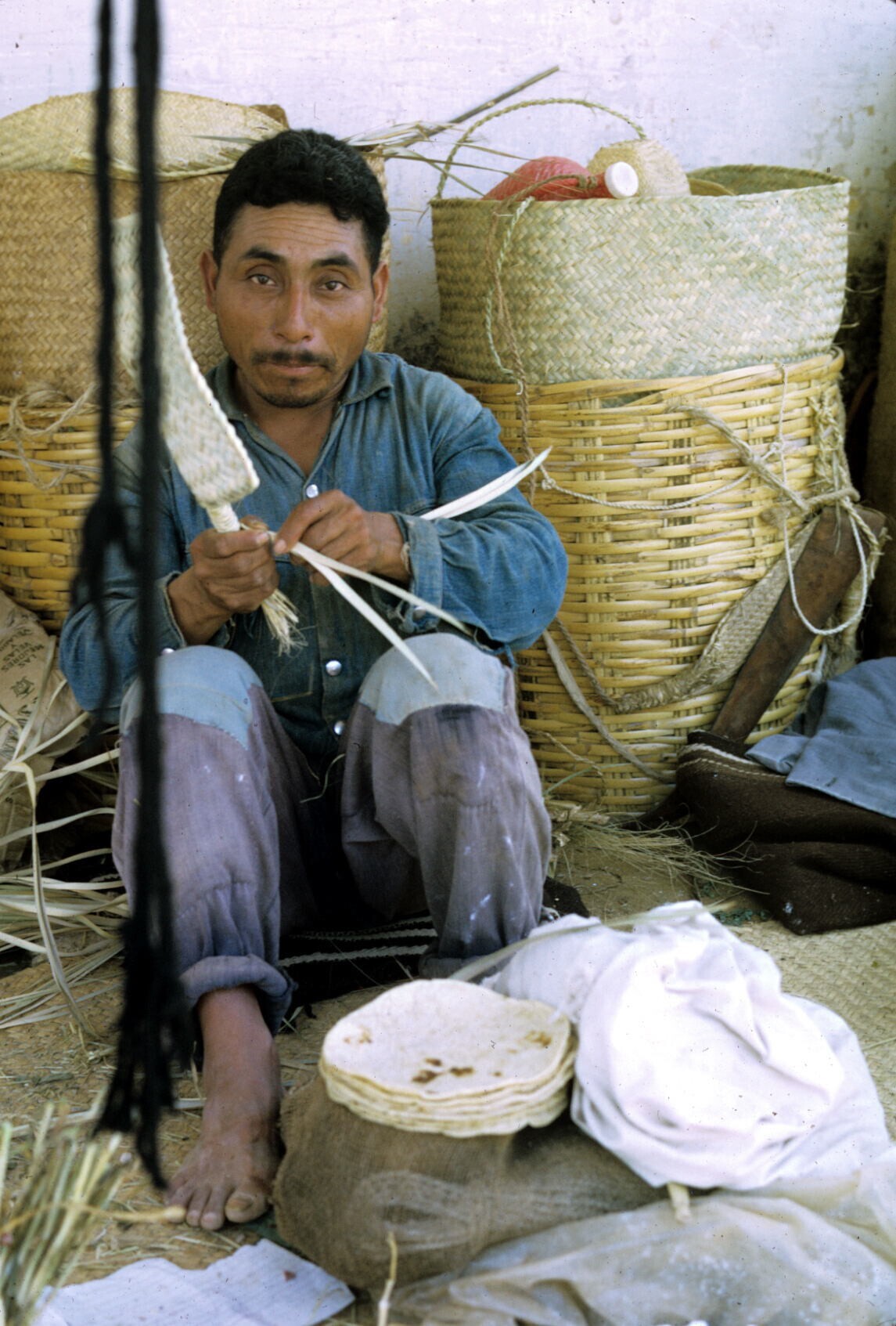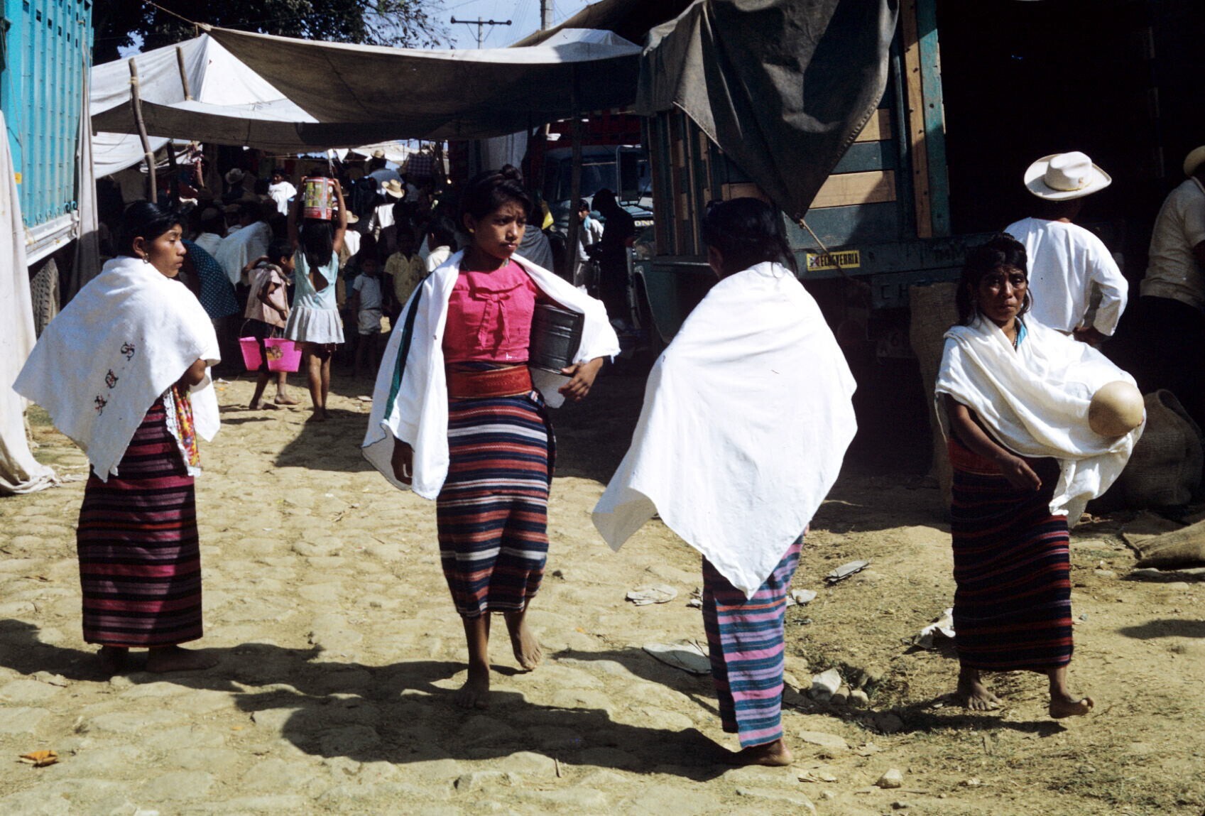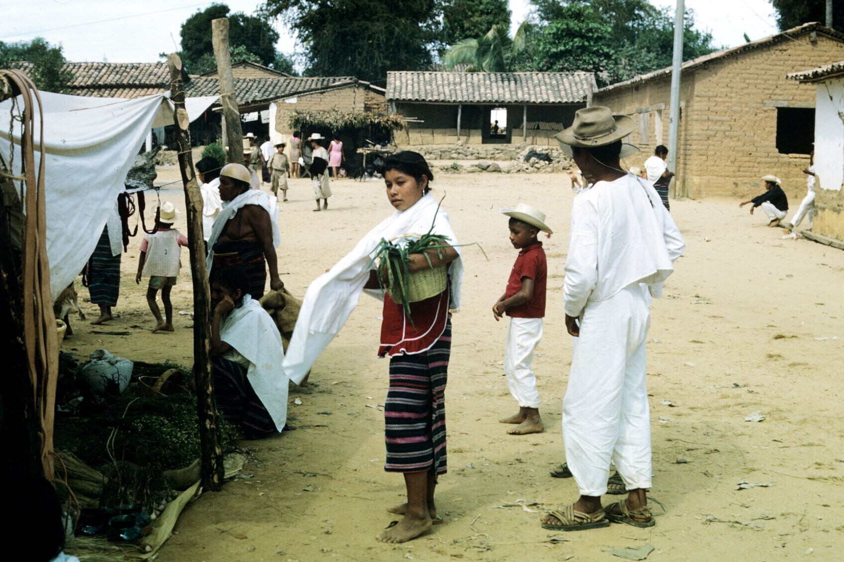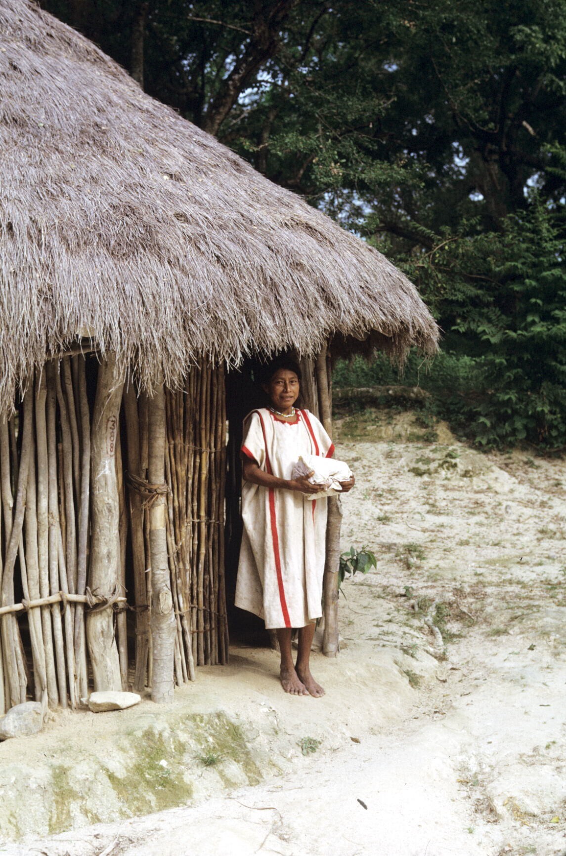 vrouw met opgevouwen huipil over arm