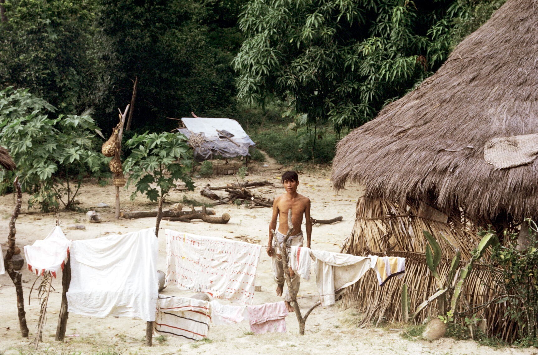 man bij choza (hut) met waslijn