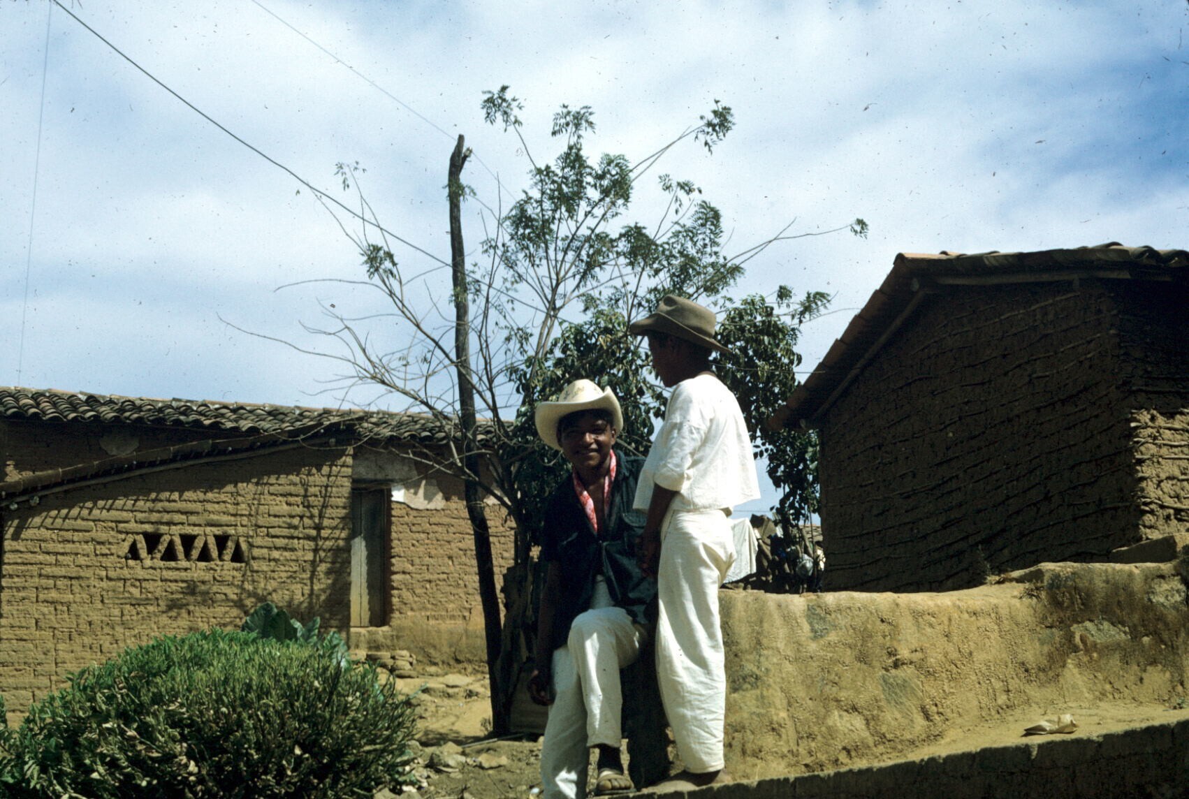 dorpsstraat: man en jongen bij huizen van adobe