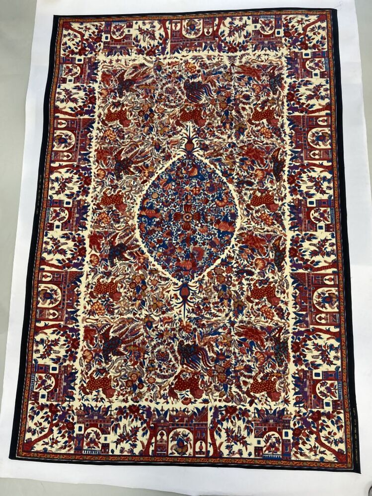 Vloerkleed met rode grond, blauwe rand met palmetten