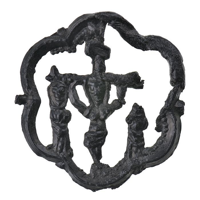 Tinnen insigne Golgotha, Christus aan het kruis gefl...
