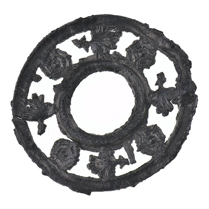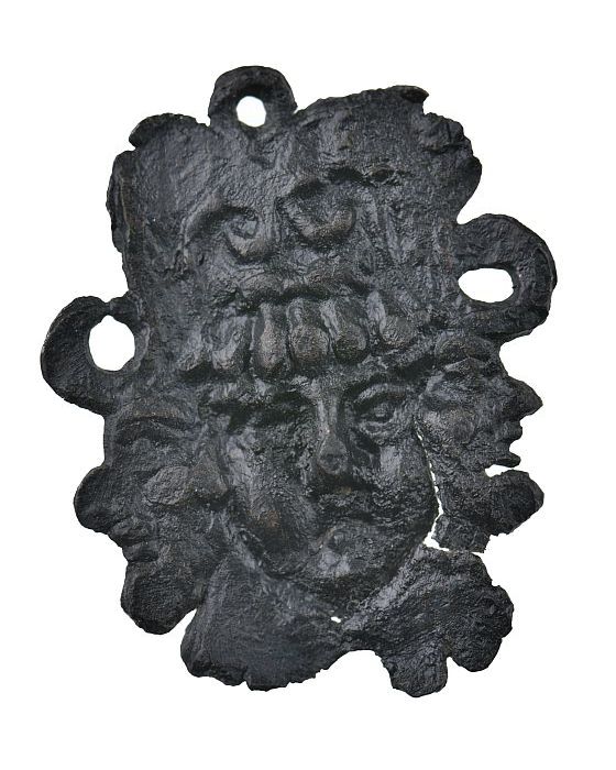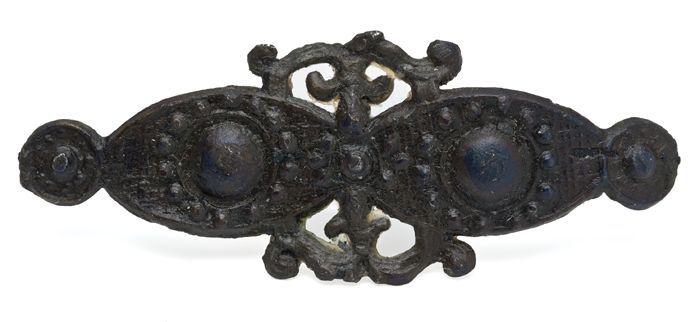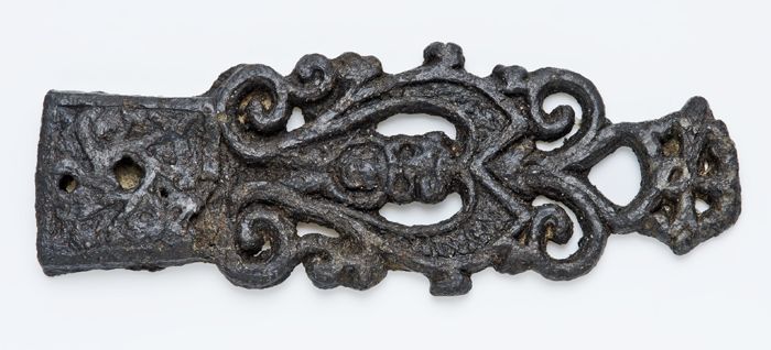 Tinnen riemtong met leeuwenkop en opengewerkte krullen