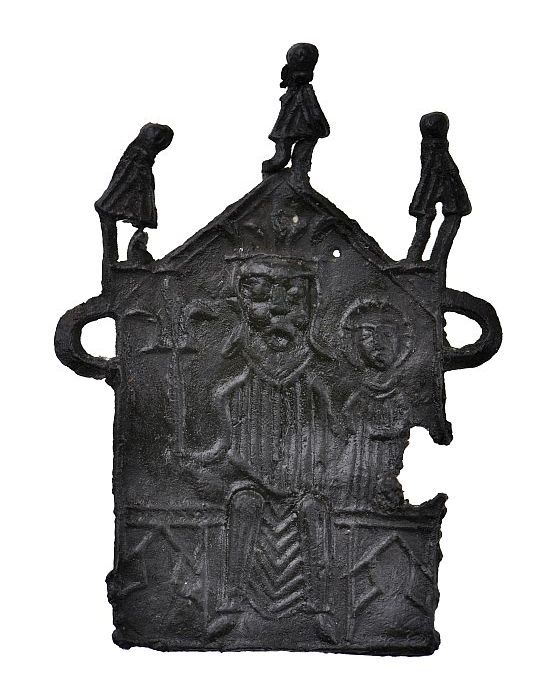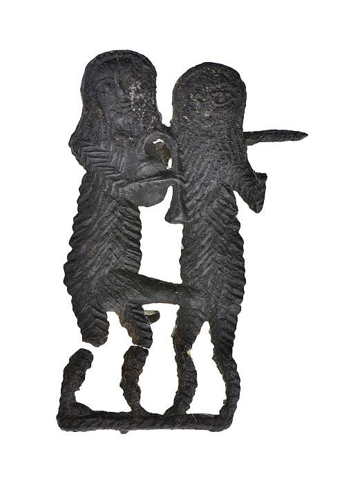 Tinnen insigne, copulerend paar op wan met twee hang...