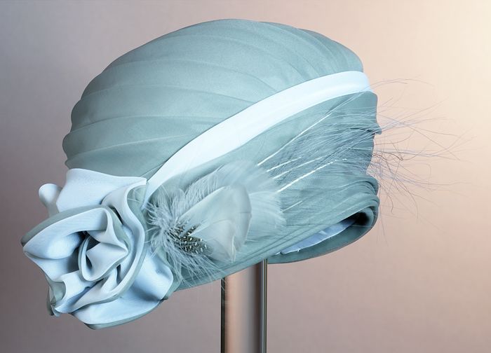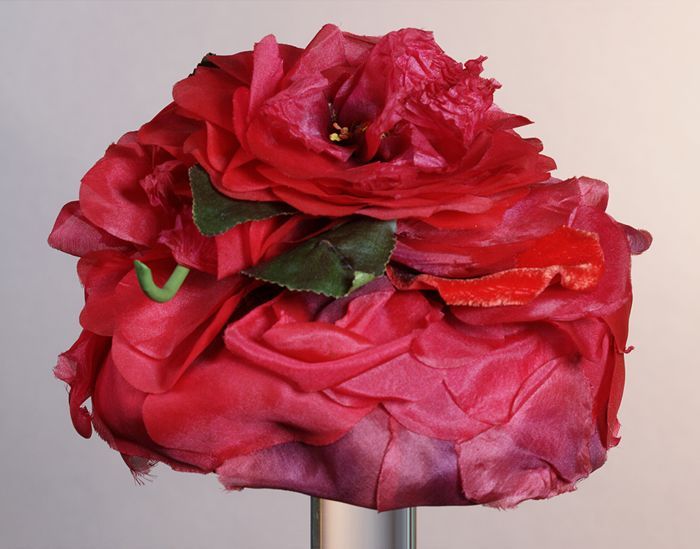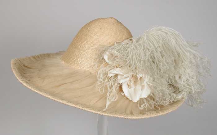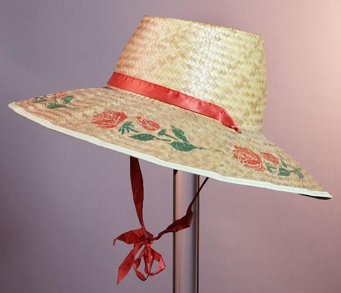Dameshoed, bandstro, hoge bol en brede rand, met roz...