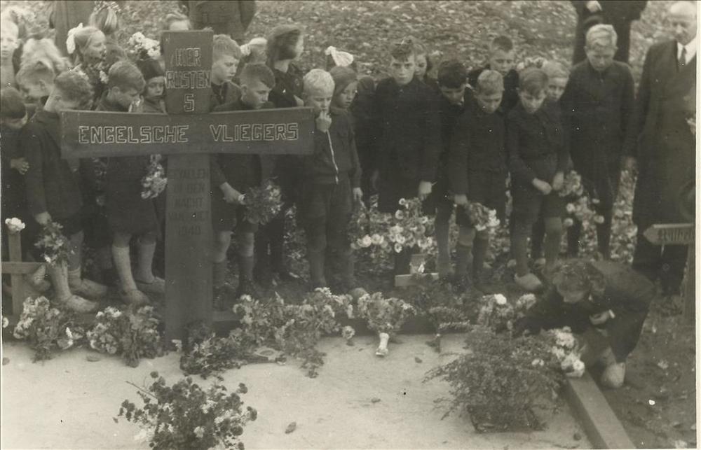 kinderen en volwassen bij graf vijf Engelse vliegers
