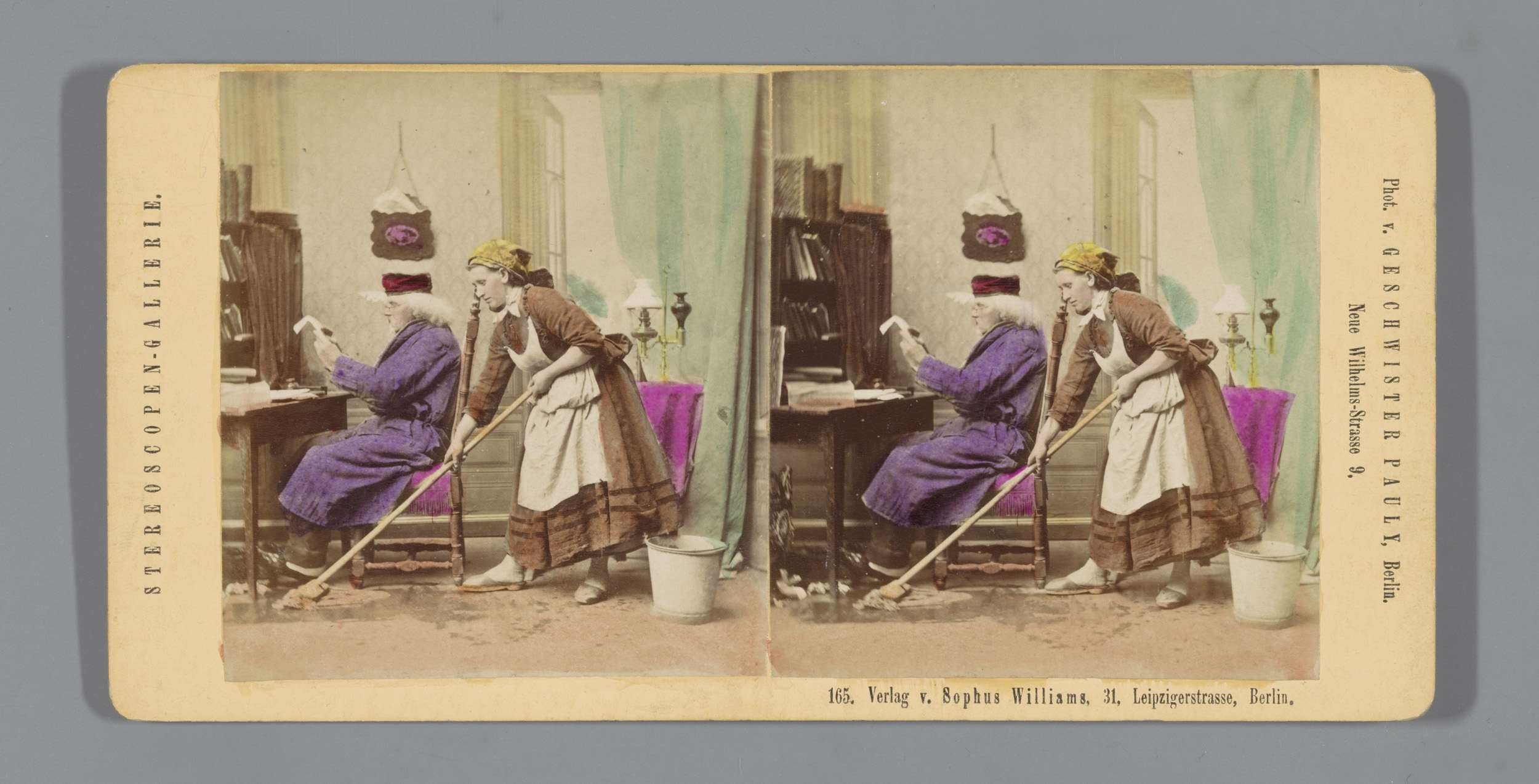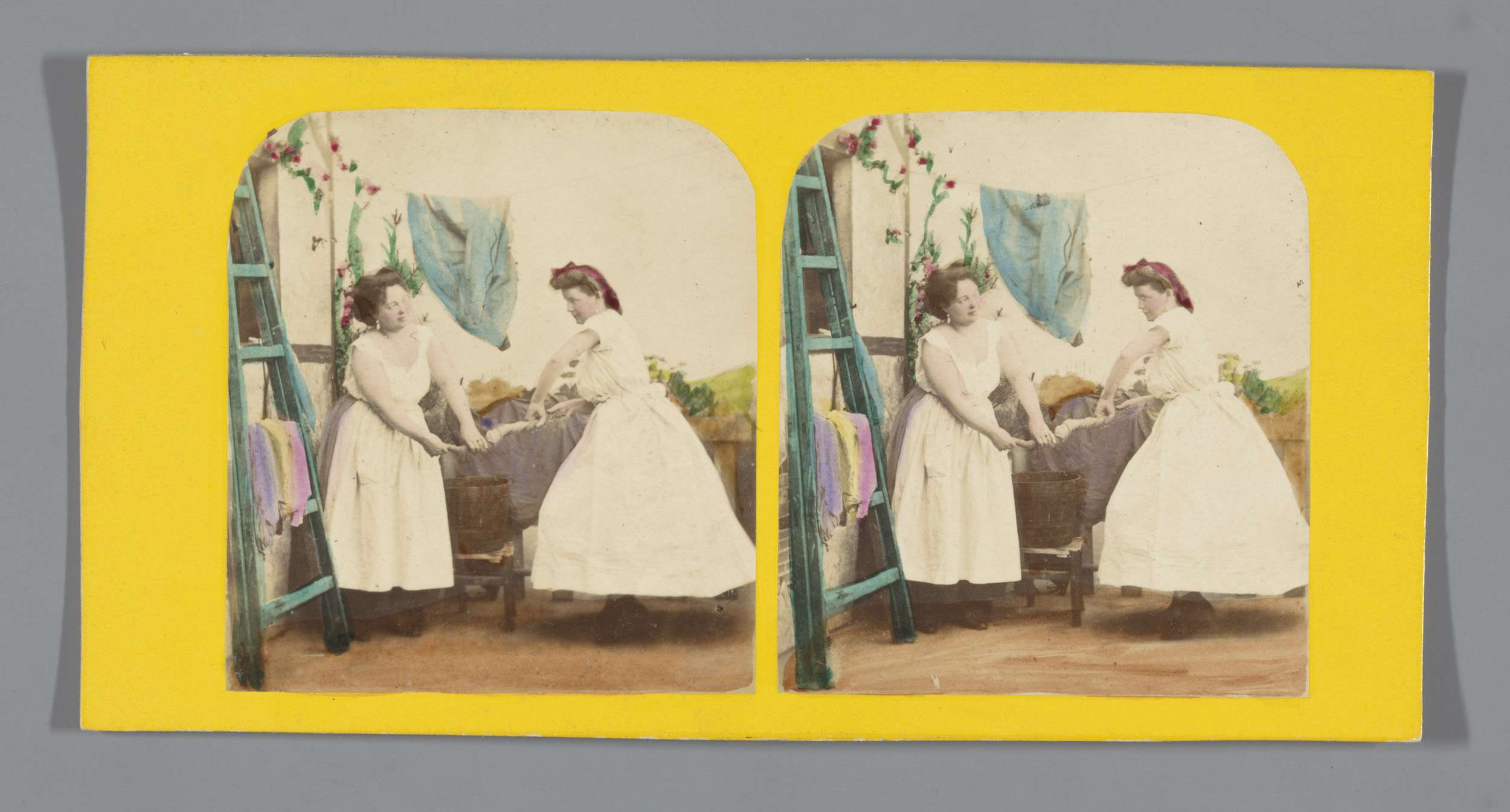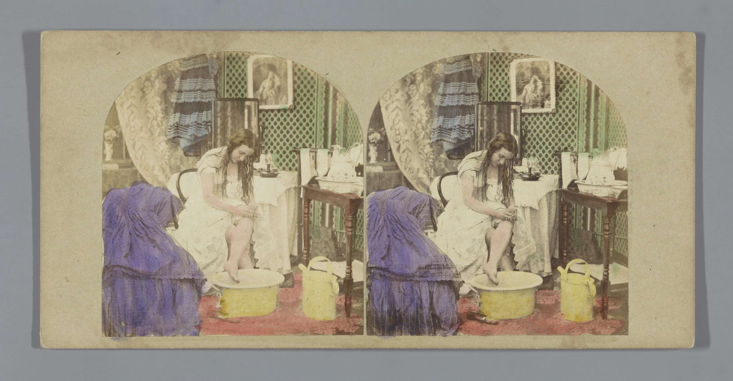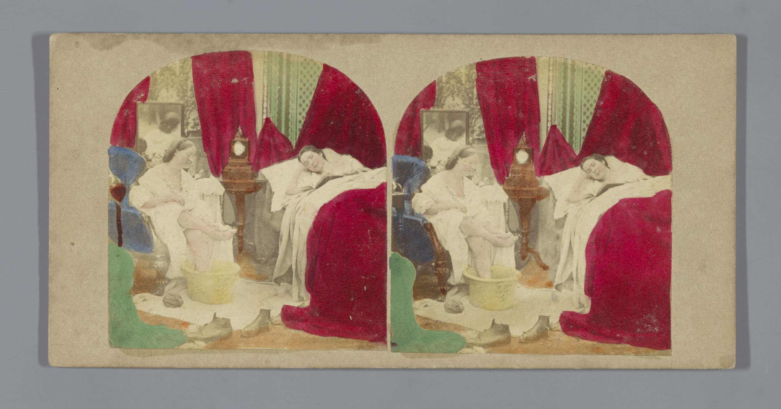 Tafereel met een wassende vrouw naast een vrouw in bed