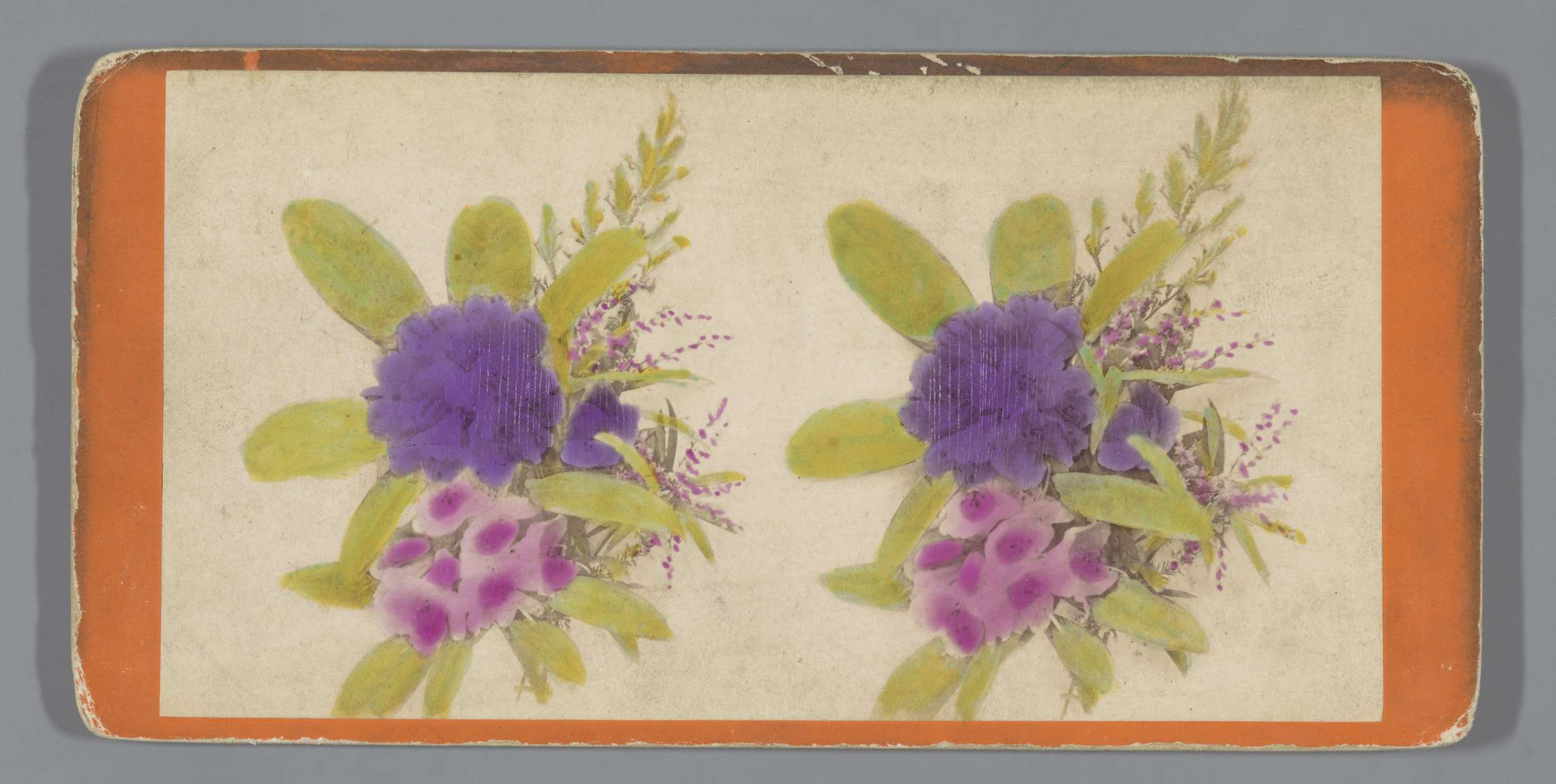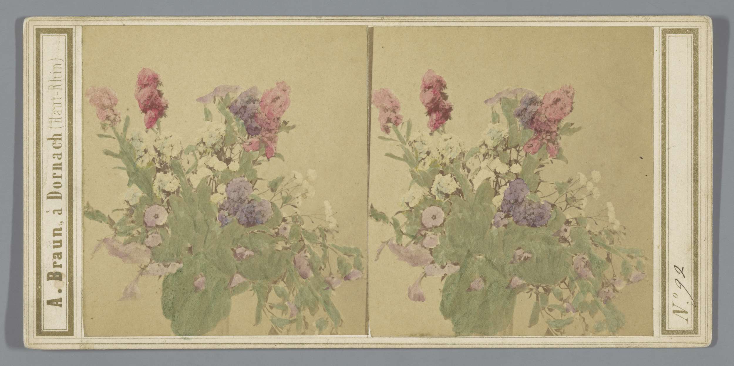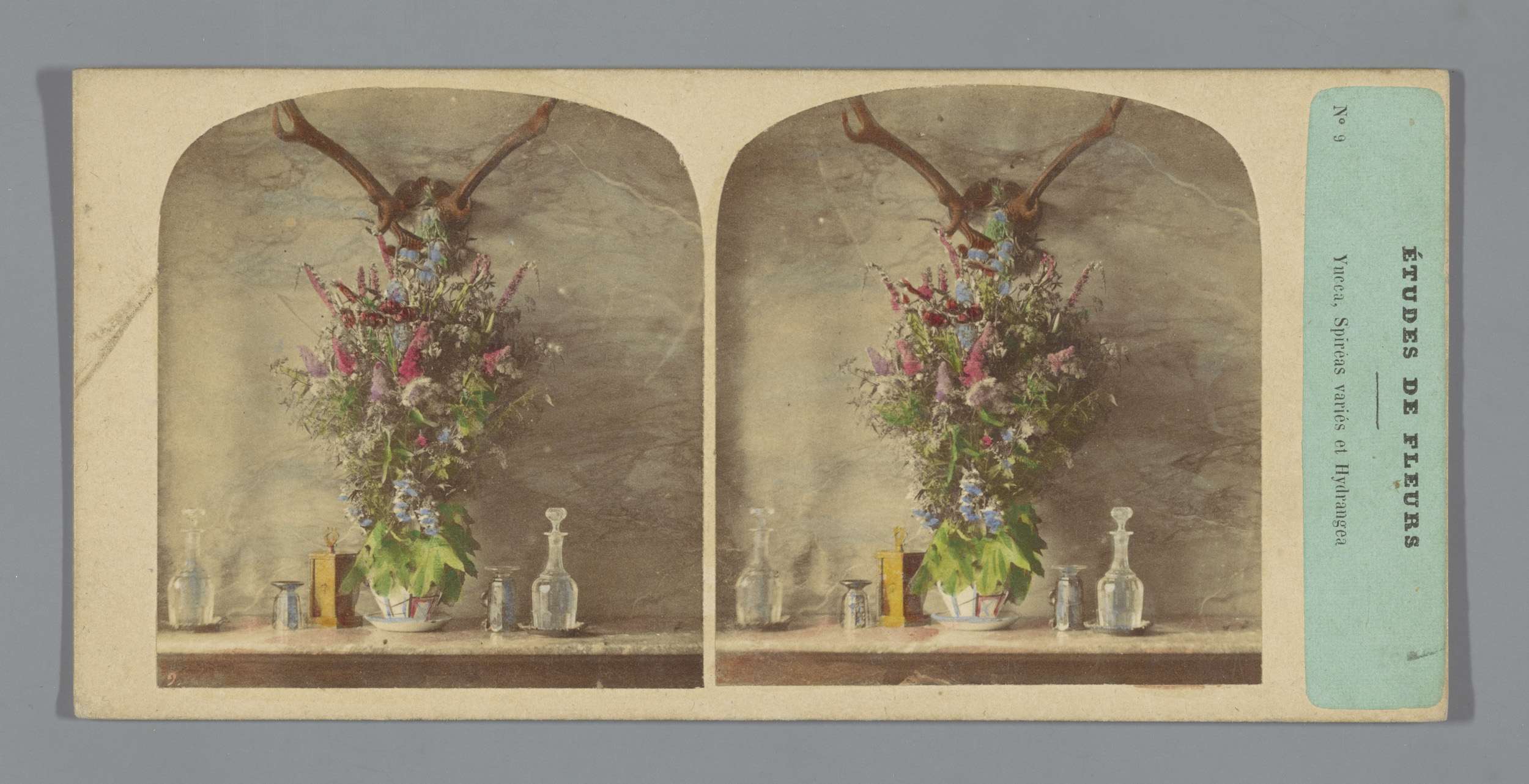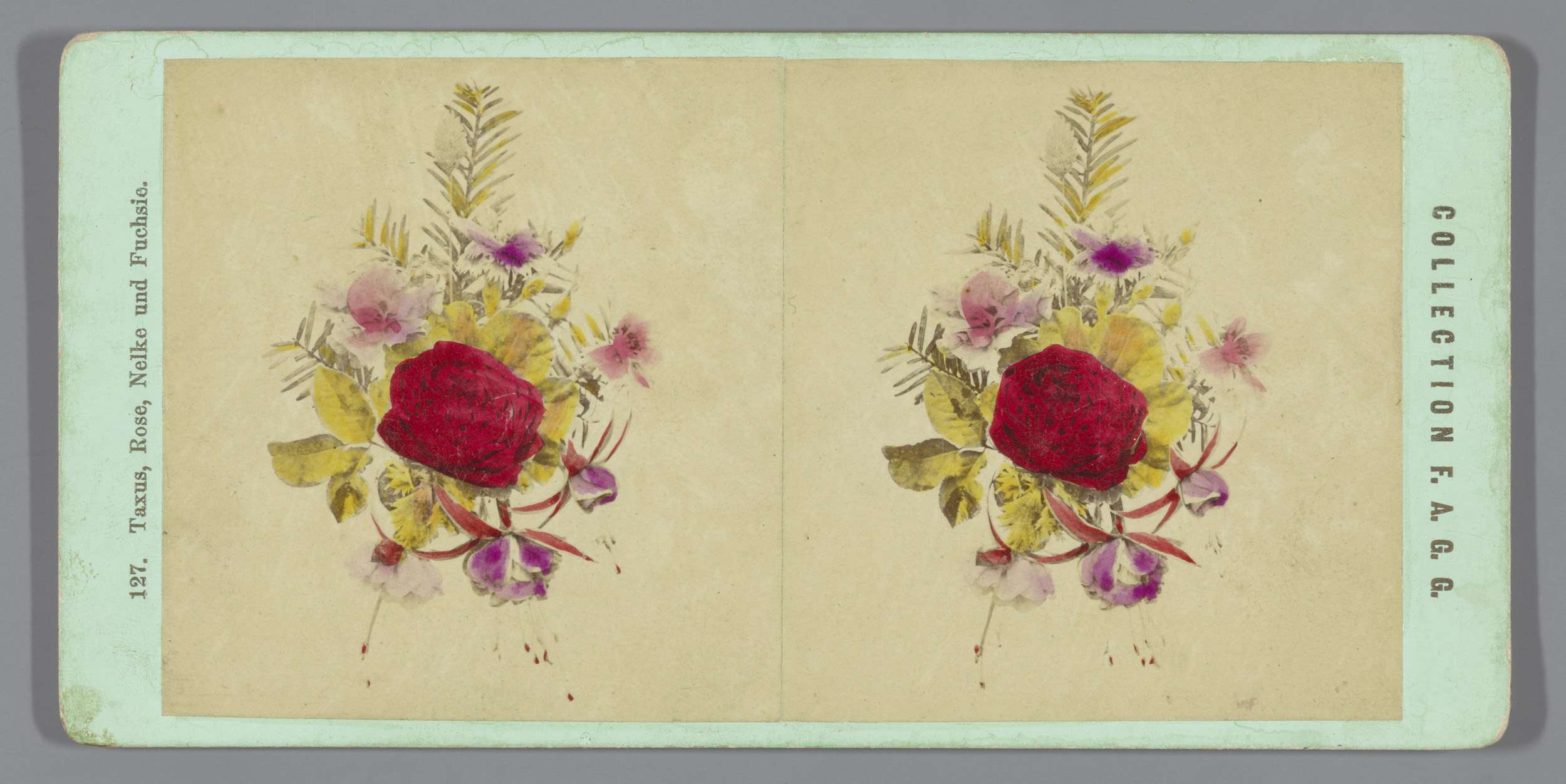 Bloemstilleven met taxus, roos, anjer en fuchsia