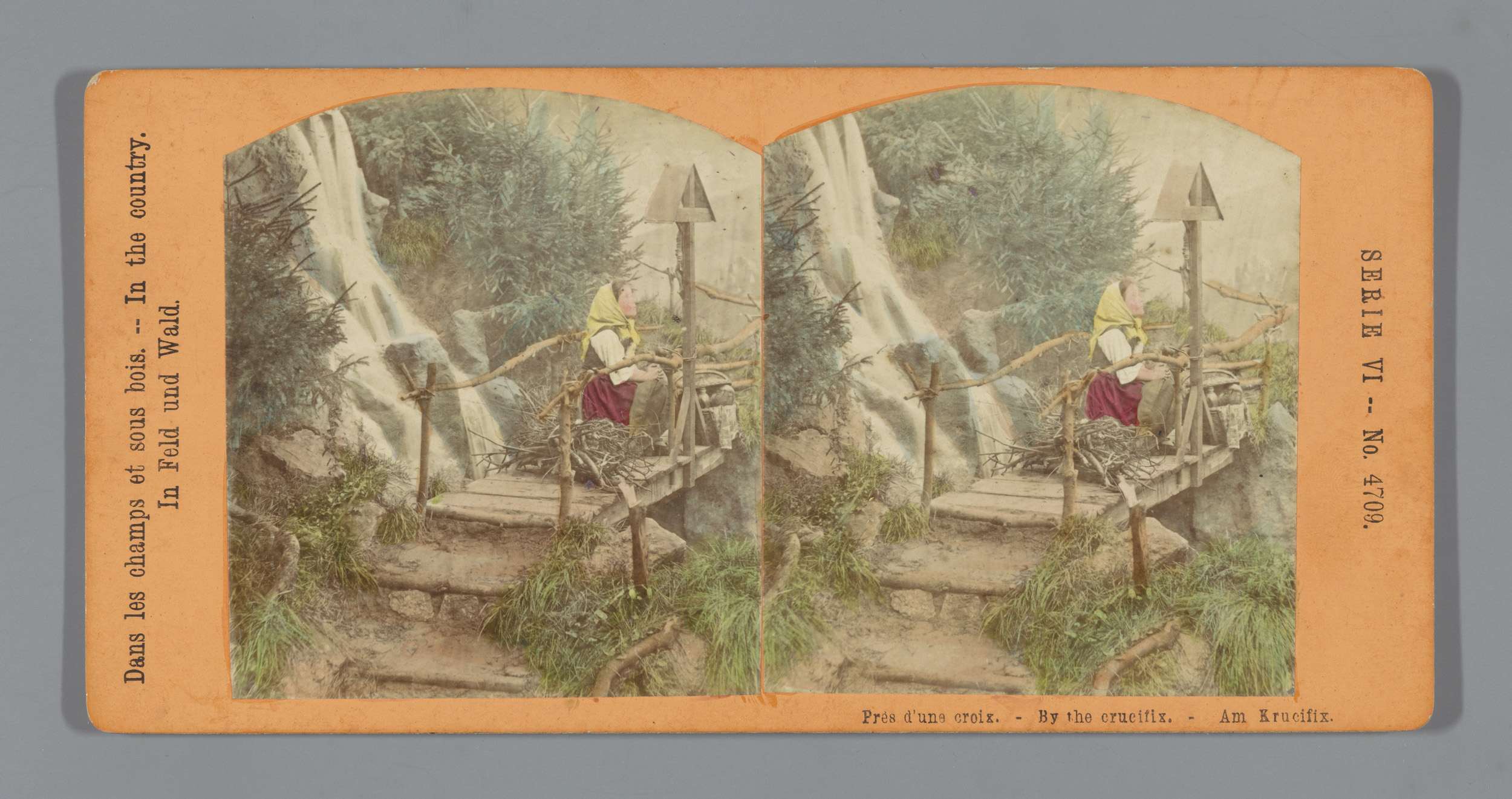 Tafereel met een jonge vrouw hurkend bij een crucifix