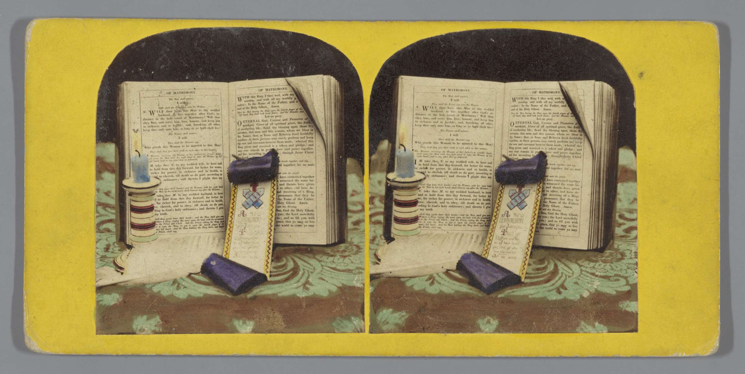 Stilleven met Book of Matrimony, kaars, veerpen en b...