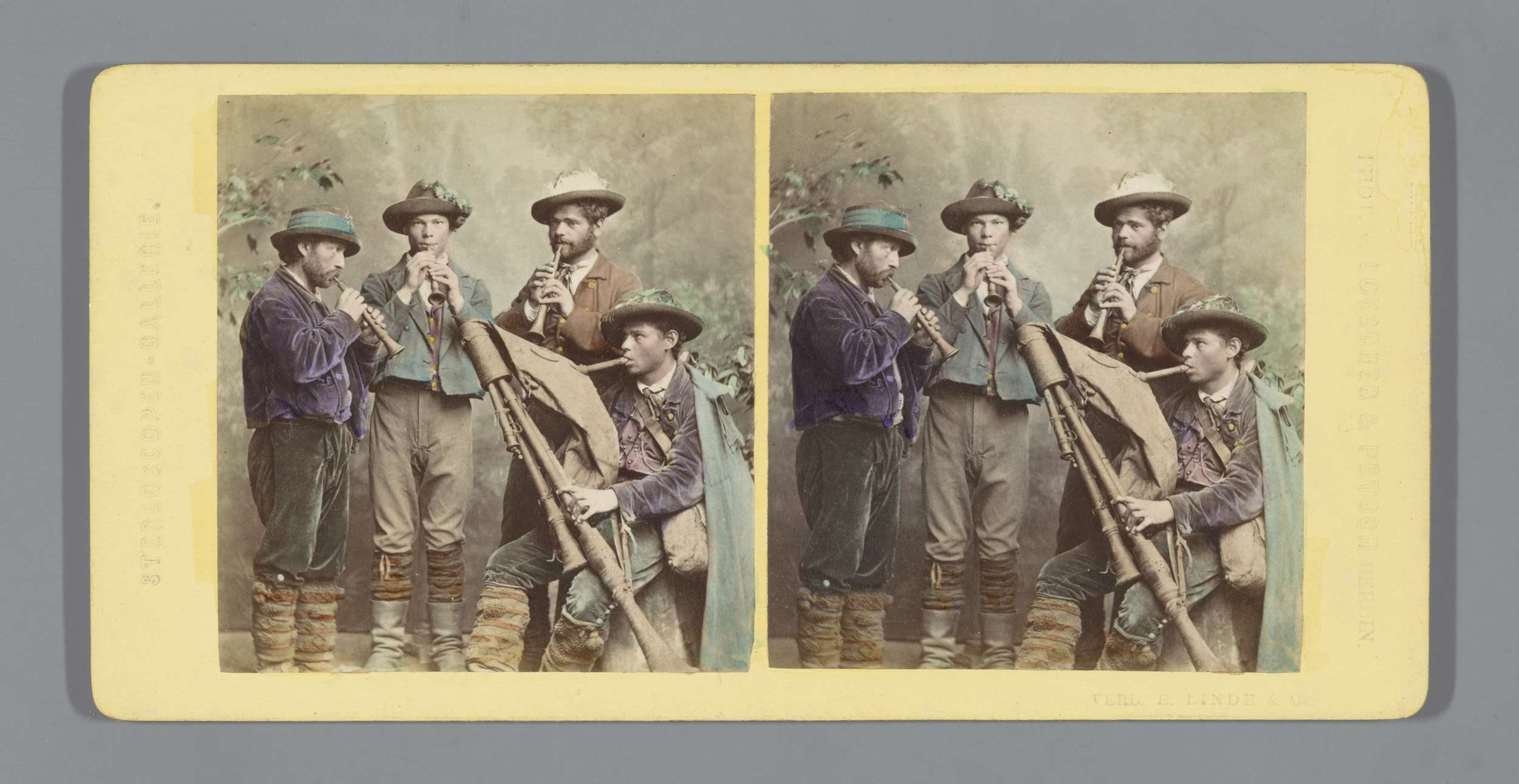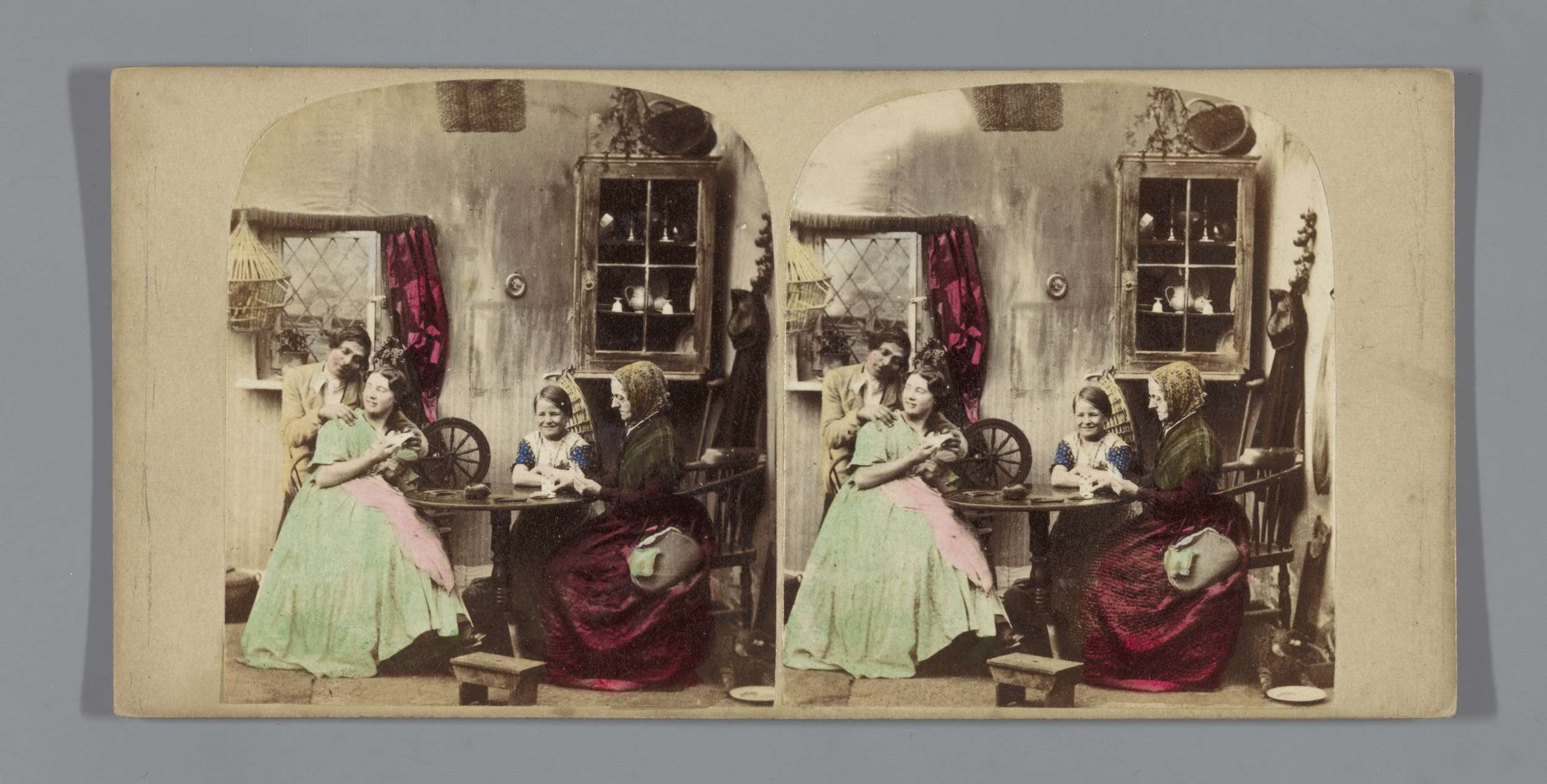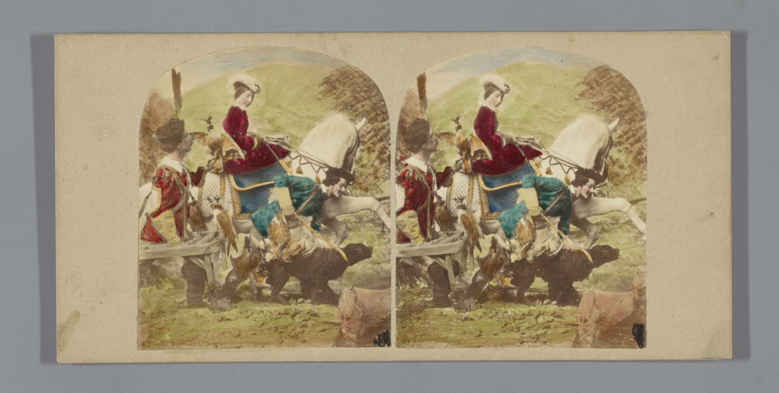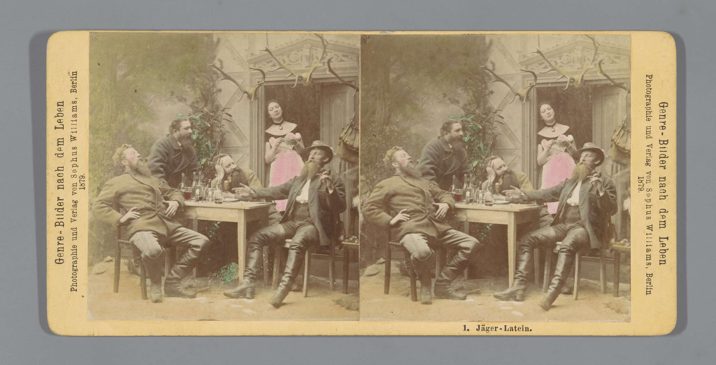 Vier jagers rond een tafel, een vrouw in de deuropening