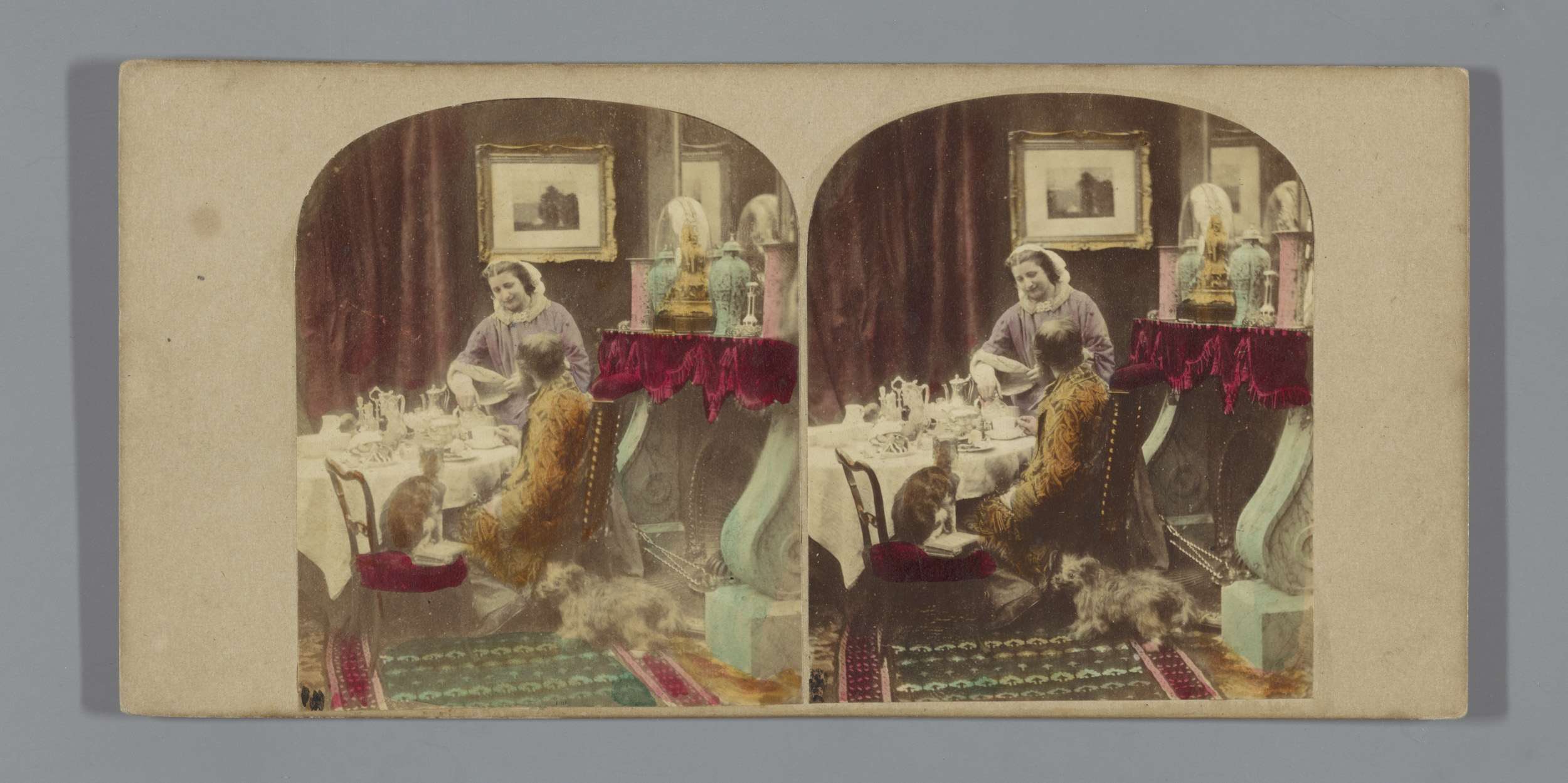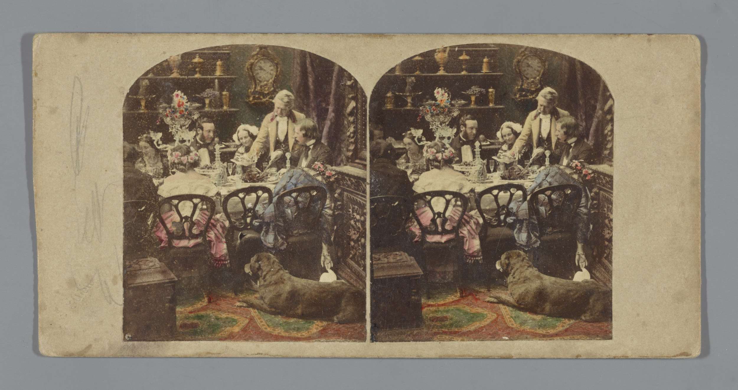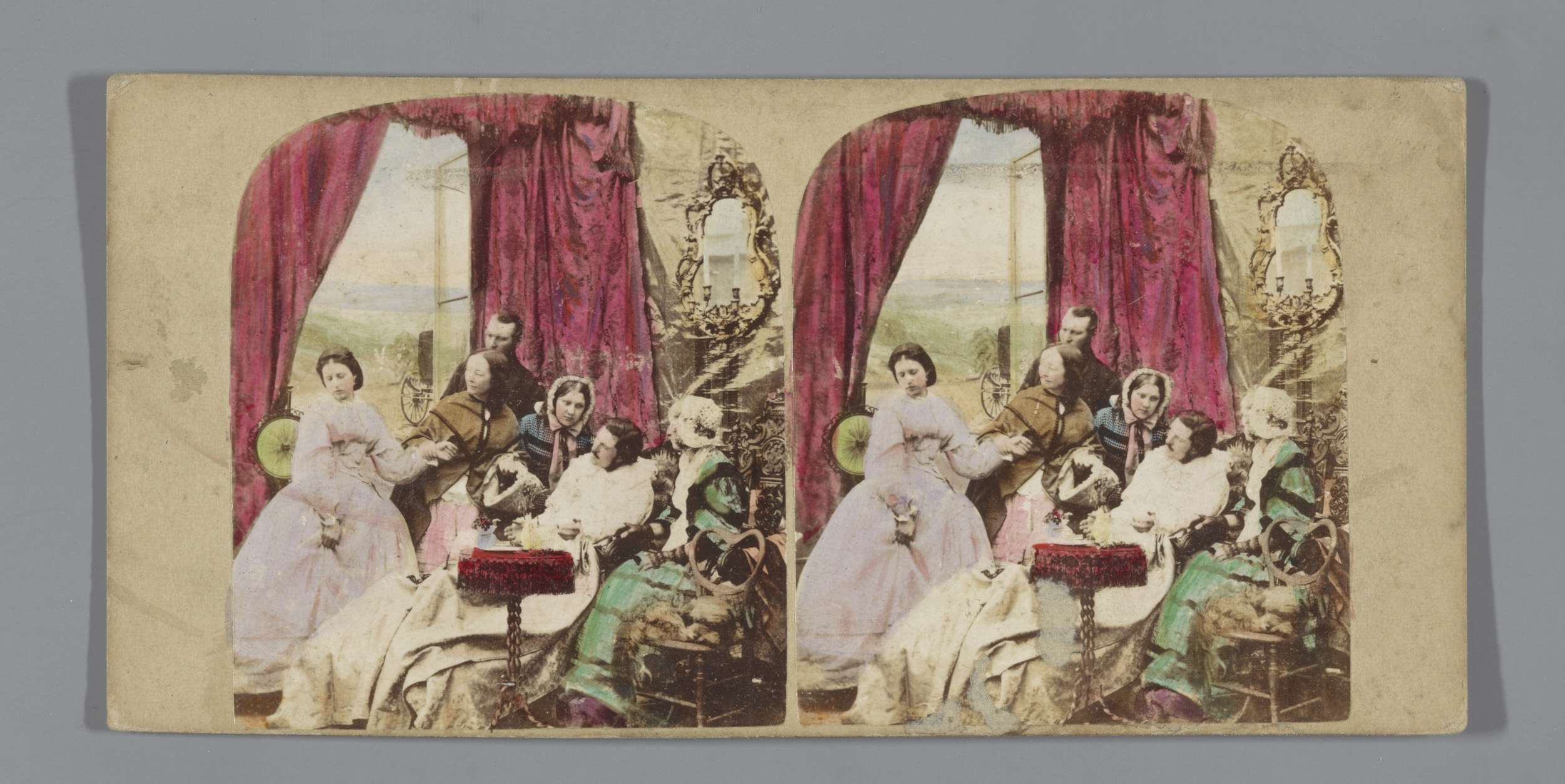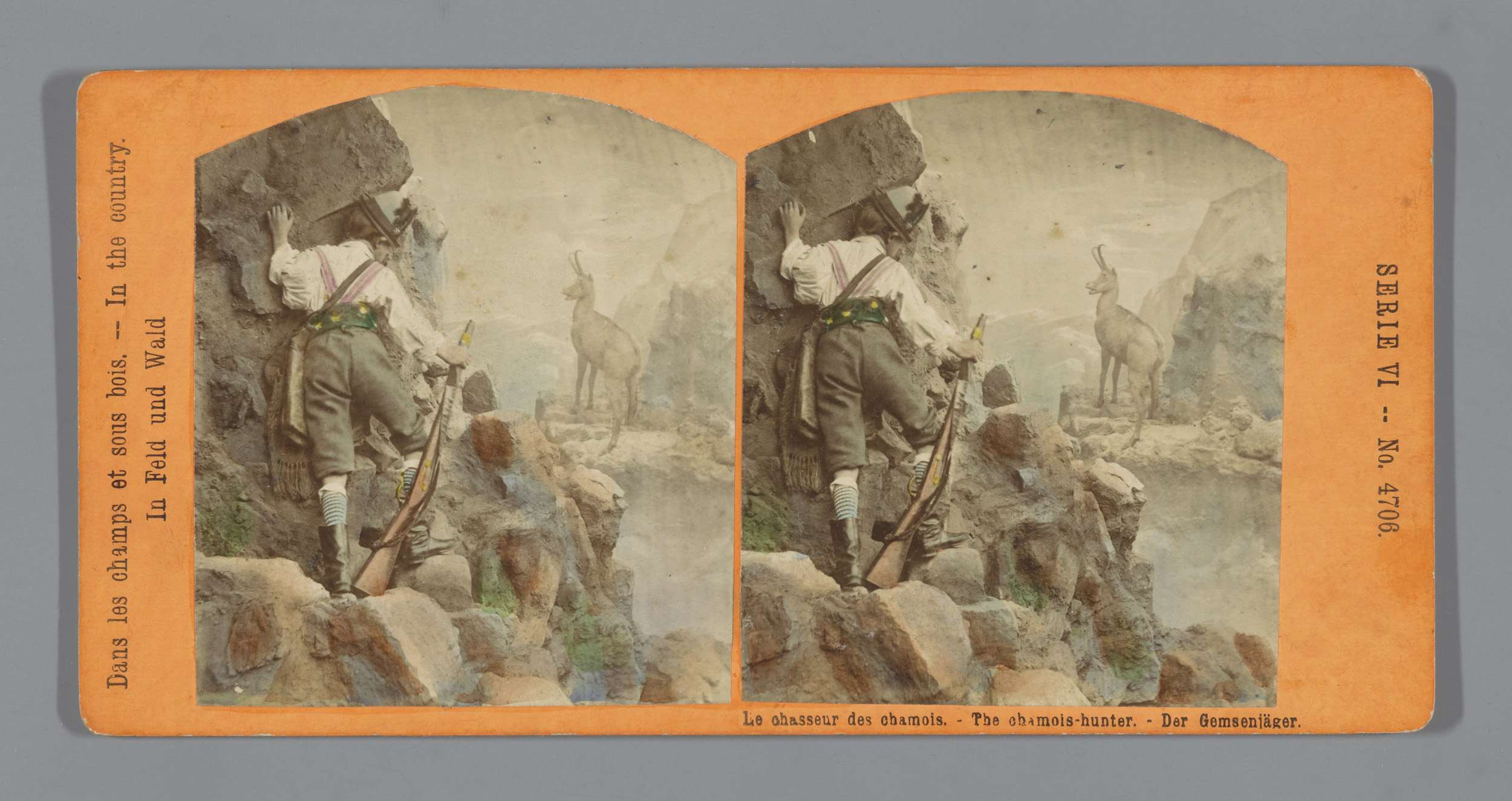 Vier jagers rond een tafel, een vrouw in de deuropening